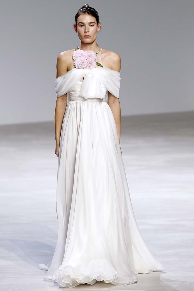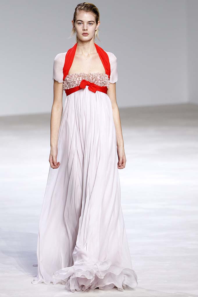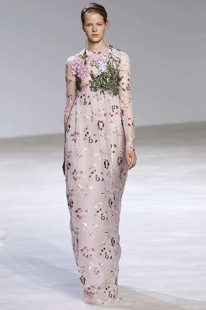 Aside from the designer’s masterful take on florals (this time they were inspired by the Parc de Bagatelle, the Jardin du Luxembourg, the Palais-Royal, and the Jardin des Tuileries), some of the themes popping up throughout the collection include bishop sleeves, Watteau backs, and empire waists, which aren’t suitable for those with any hint of curves—the minute bodices just peek above the skirt. In any case, there are plenty of looks both for the red carpet and daily lives of the one percent!