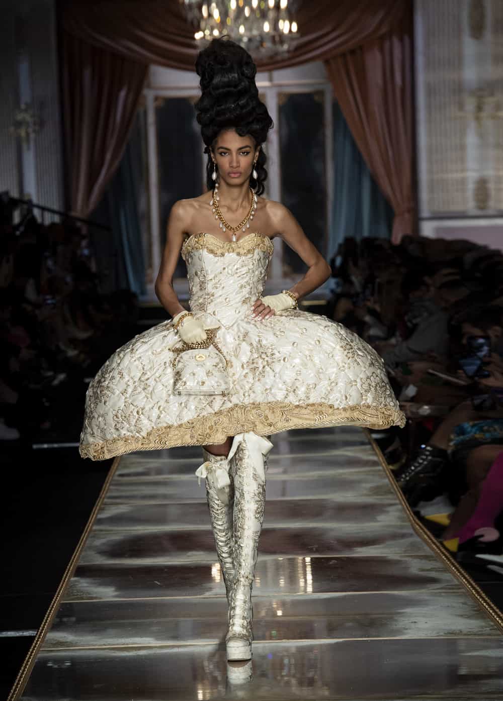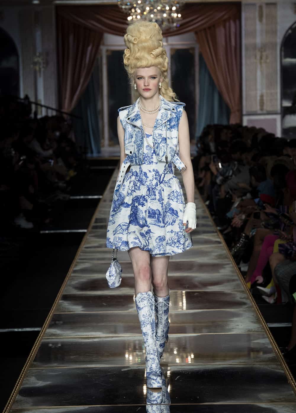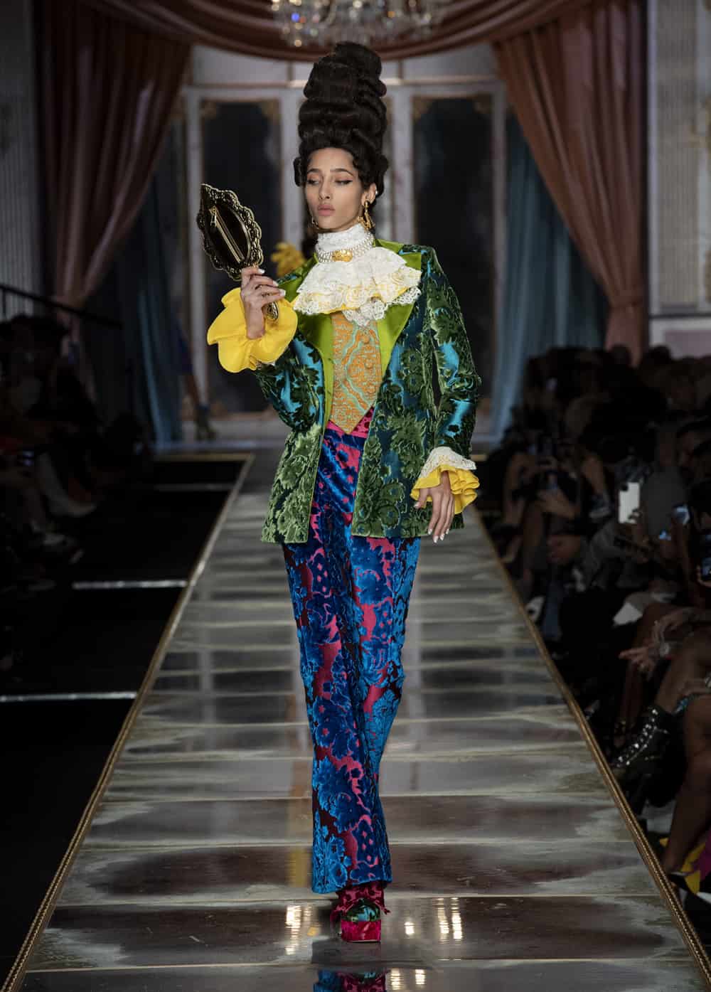 What happens when you mix Marie Antoinette with the bright colors of Tokyo? According to Jeremy Scott, “Anime Antoinette.” The designer’s Fall 2020 collection for Moschino was a cosplay version of the famed French queen, riffing on her alleged “let them eat cake” quote to an extreme.