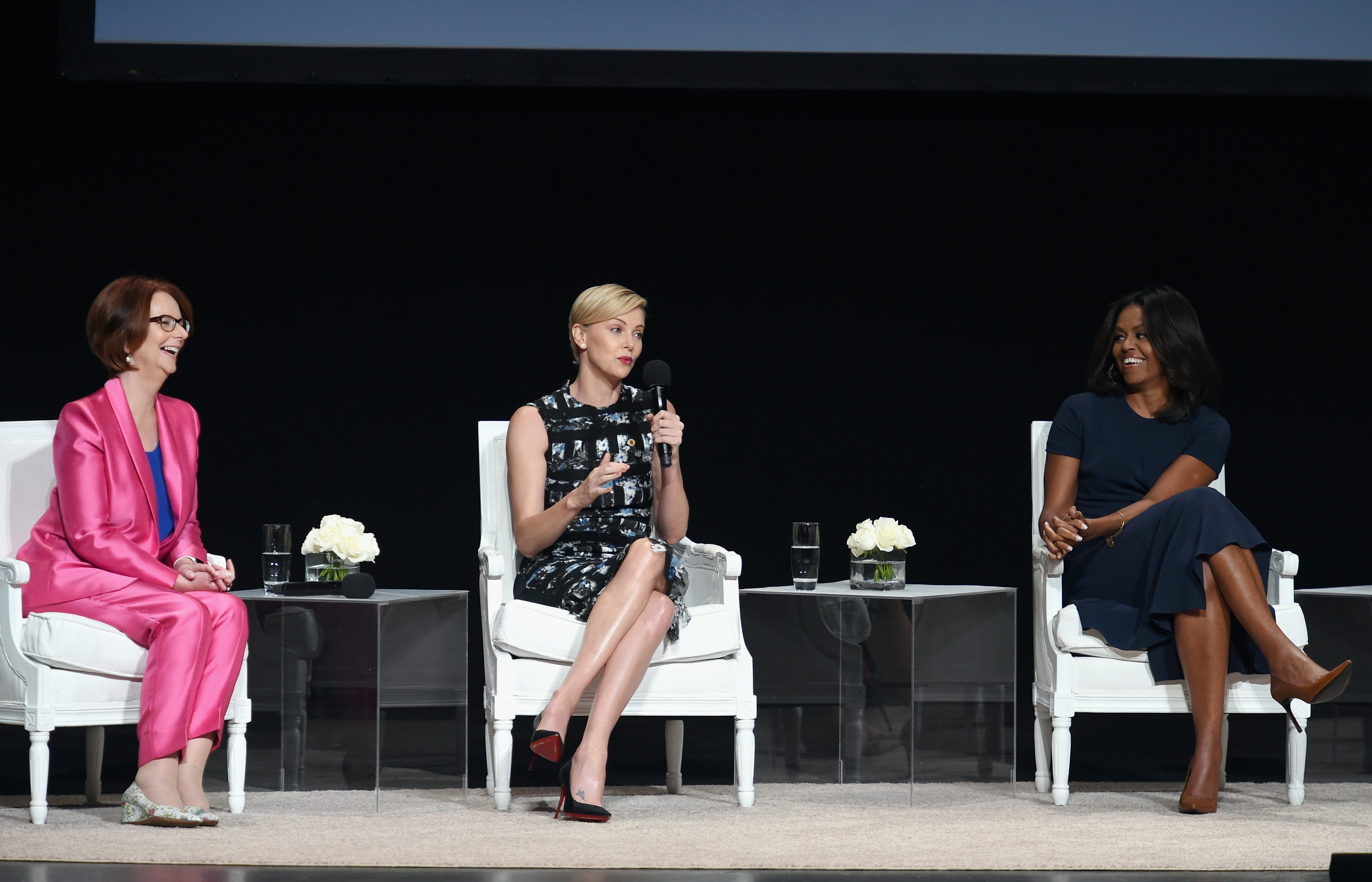 - NEW YORK, NY – SEPTEMBER 29: (L-R) Former Australian Prime Minister Julia Gillard, Founder of Charlize Theron Africa Outreach Project and U.N. Messenger of Peace Charlize Theron and First Lady of the United States Michelle Obama join Glamour “The Power Of An Educated Girl” panel at The Apollo Theater on September 29, 2015 in New York City. (Photo by Dimitrios Kambouris/Getty Images for Glamour)