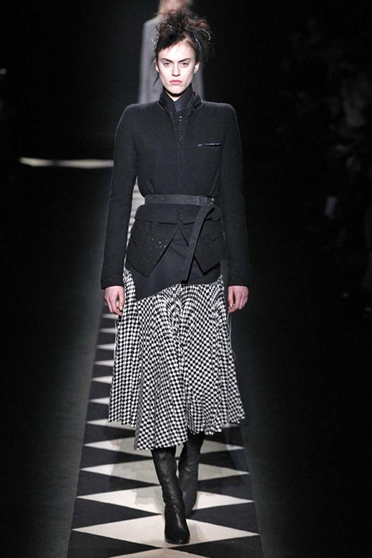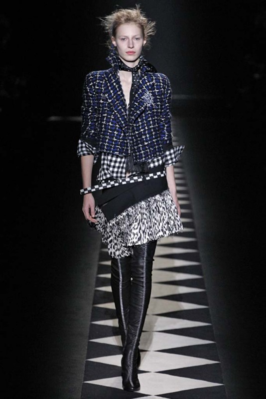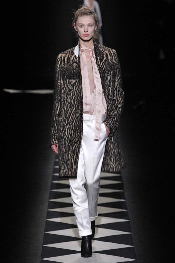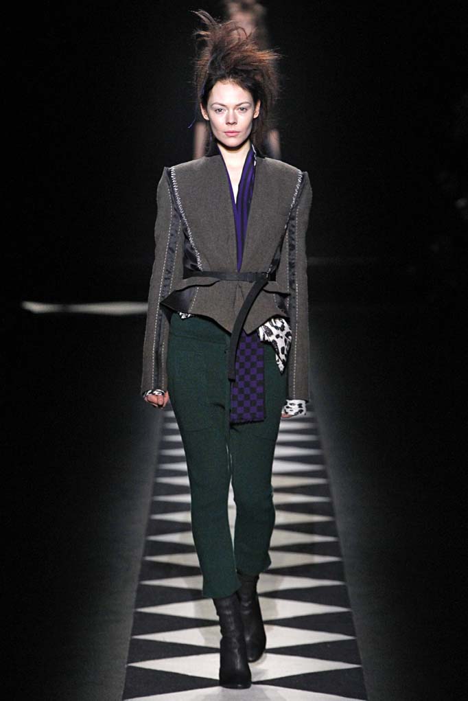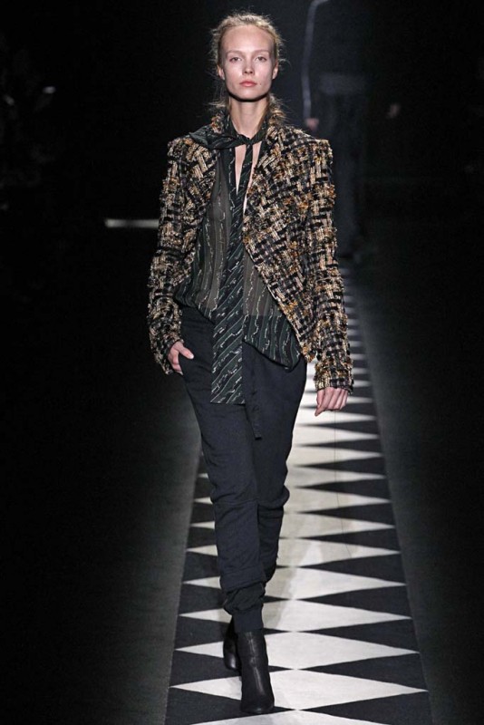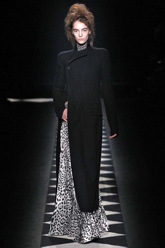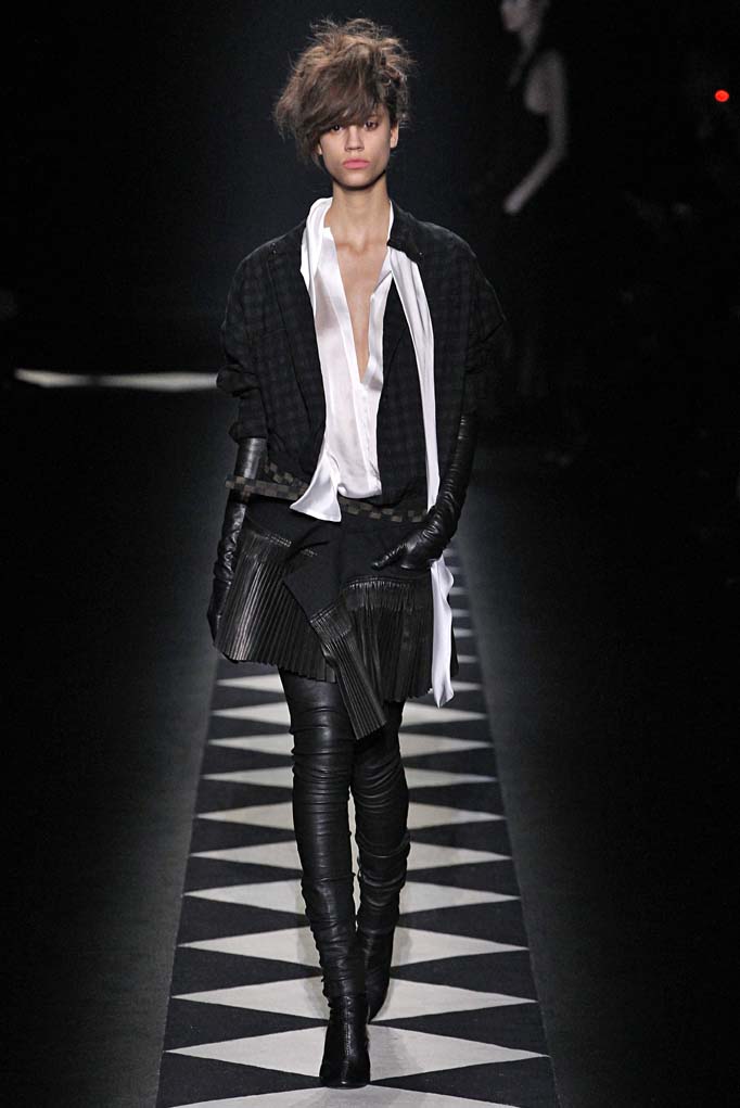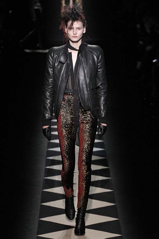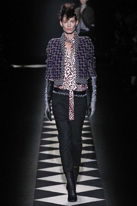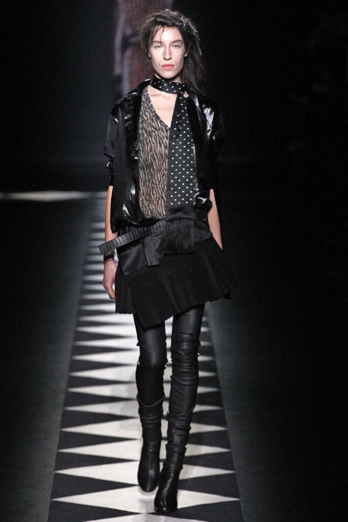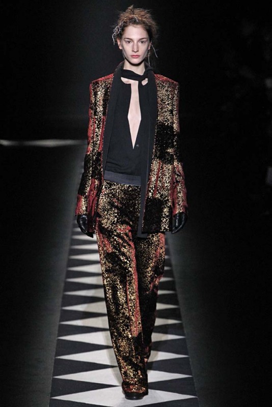 This season, the Haider Ackermann girl sported her hair messily piled on top of her head, along with gloves and thigh-high boots. There were plenty of constants, from the complicated layering of shirts, skirts, jackets, and belts, to the wild mix of prints.. A trio of printed jackets were paired with colorful pants and tied at the waist with obi belts. Another standout: sparkly pants paired with a leather jacket, whose rock ‘n roll influence was obvious. And then there was a simple black jumpsuit with a plunging neckline and a simple touch of white, a nice moment of clean lines and simplicity among the many busy prints.