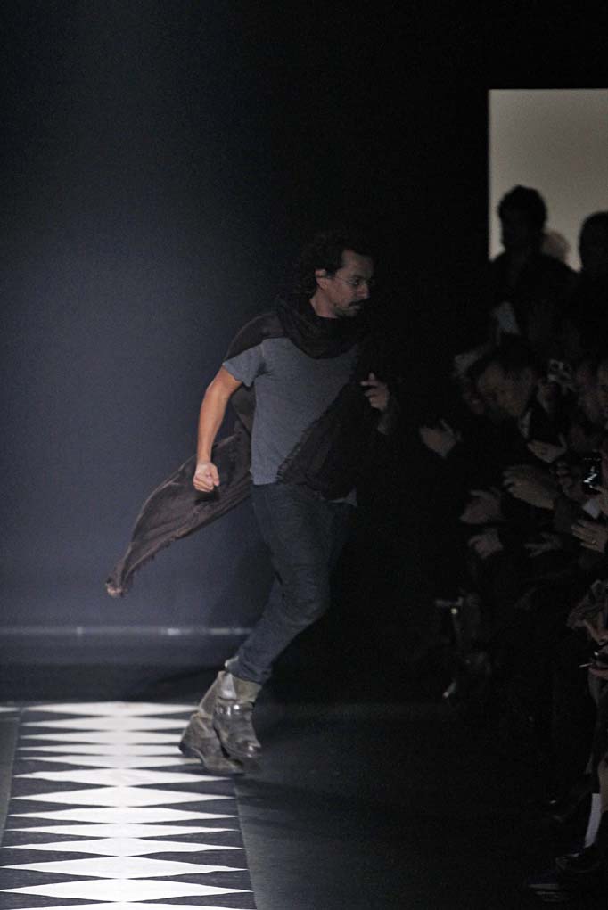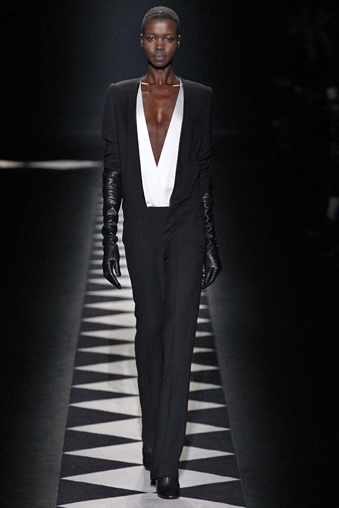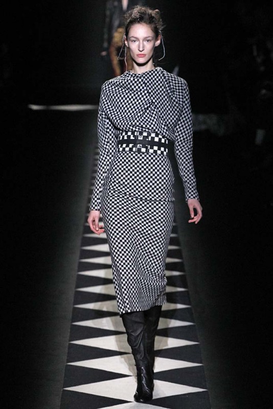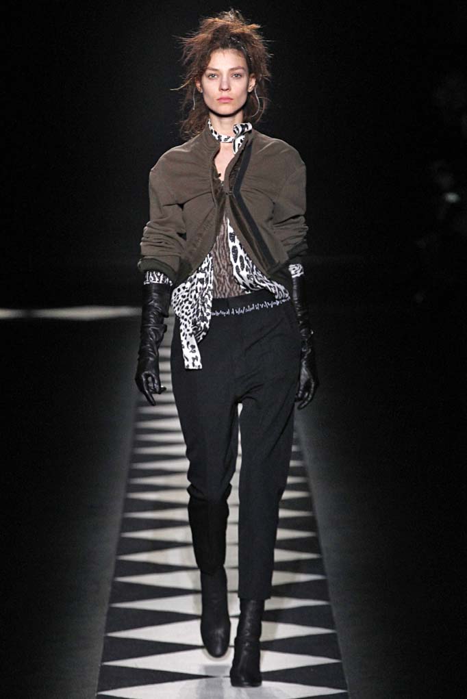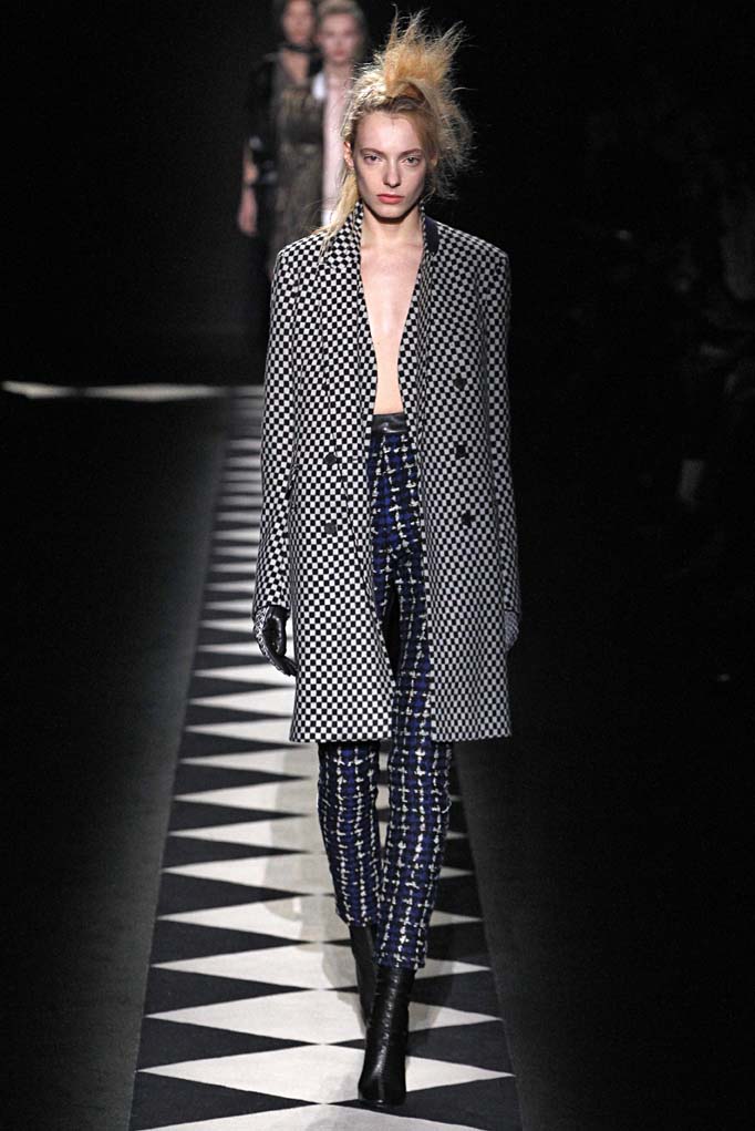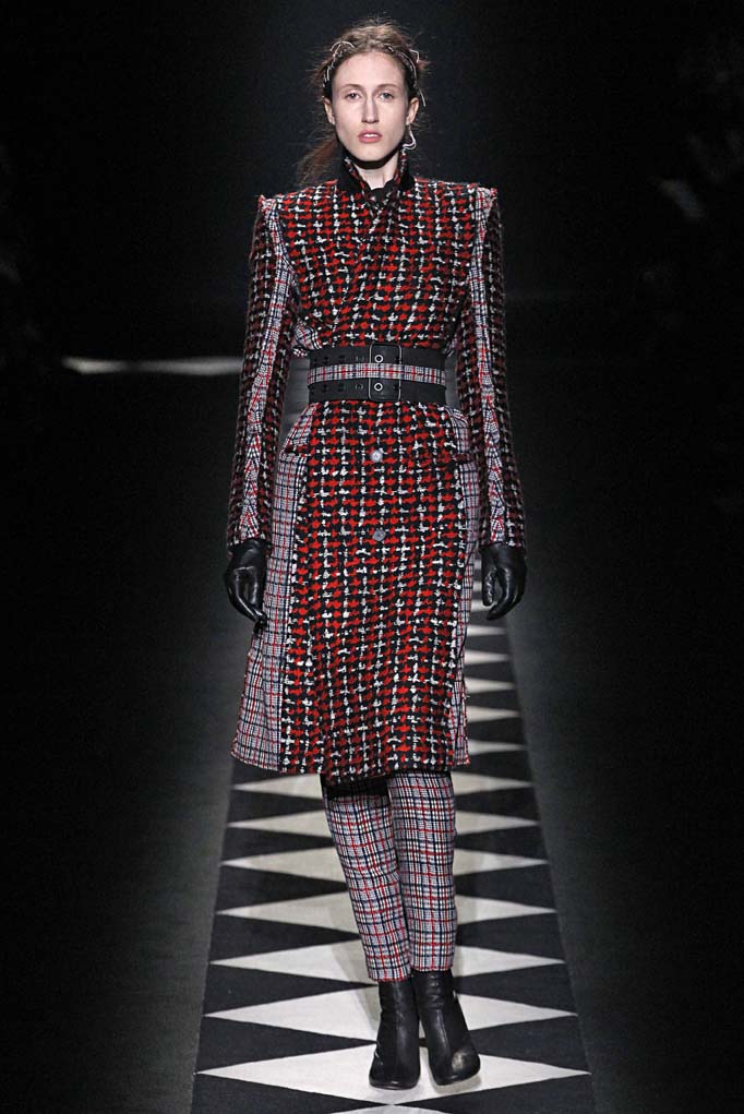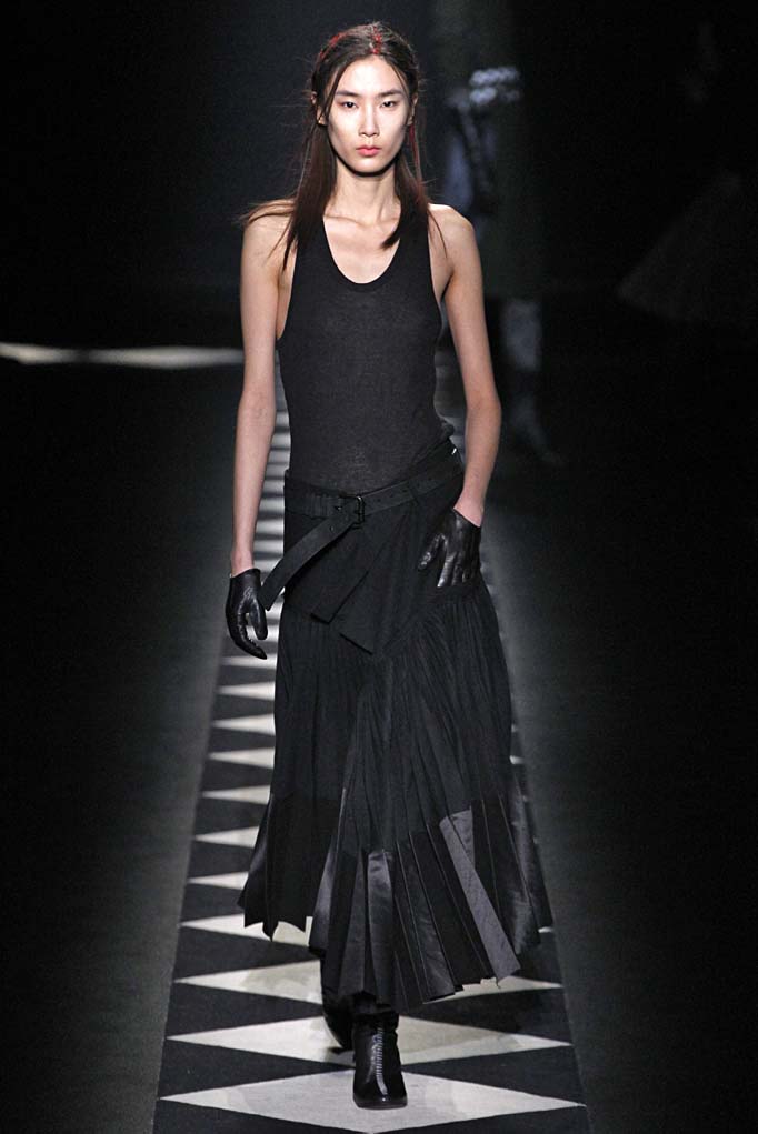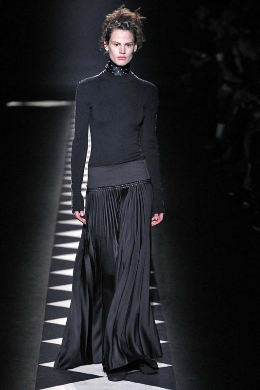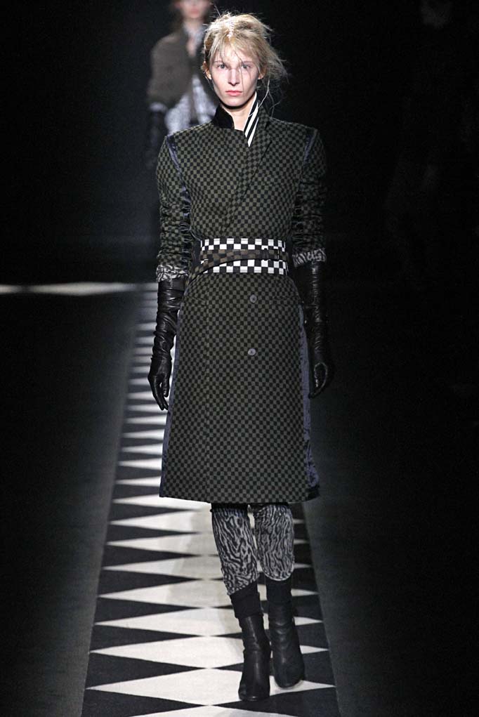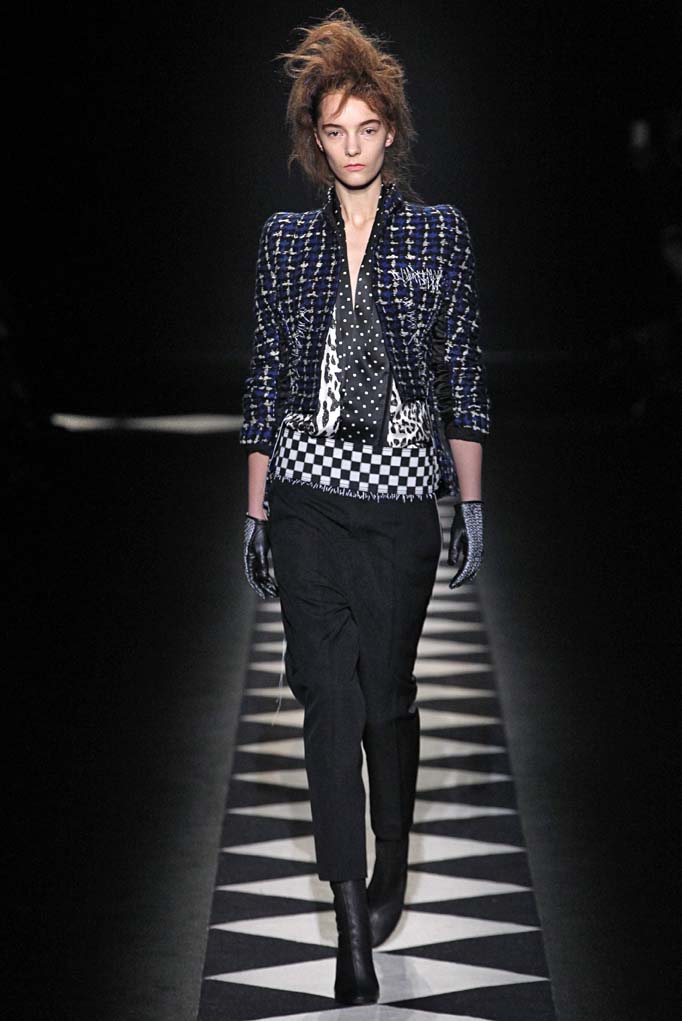 This season, the Haider Ackermann girl sported her hair messily piled on top of her head, along with gloves and thigh-high boots. There were plenty of constants, from the complicated layering of shirts, skirts, jackets, and belts, to the wild mix of prints.. A trio of printed jackets were paired with colorful pants and tied at the waist with obi belts. Another standout: sparkly pants paired with a leather jacket, whose rock ‘n roll influence was obvious. And then there was a simple black jumpsuit with a plunging neckline and a simple touch of white, a nice moment of clean lines and simplicity among the many busy prints.