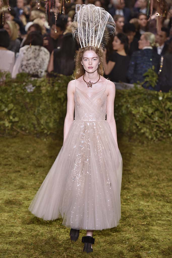 The venue decor set the tone for Grazia Chiuri’s pixies, who floated down the runway in awe-inspiring ethereal gowns topped off with floral and feathered crowns by famed milliner Stephen Jones. Before the show’s debut, Dior took fans behind-the-scenes of the atelier on Instagram to reveal Grazia Chiuri and the team’s penchant for mysticism (designer Giuseppe showed off his protective amulets) and daily horoscope readings (Grazia Chiuri is Aquarius, but she has a team of Geminis, Pisces, and Scorpios!). It’s no wonder that Grazia Chiuri’s collection felt so other worldly.
