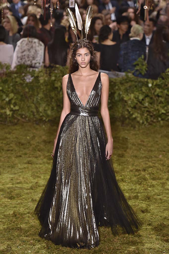 Maria Grazia Chiuri presented her first couture collection for the house of Dior today. The scene? While her predecessor, Raf Simons, was known for creating elaborate floral displays as the backdrop for his shows, Grazia Chiuri transformed the runway into a mossy forest for her mystical nymphs. Front row guests like Diane Kruger and Kirsten Dunst sat perched on velvet green pillows while their heels rested on a grassy carpet that covered the room at the Musée Rodin in Paris.