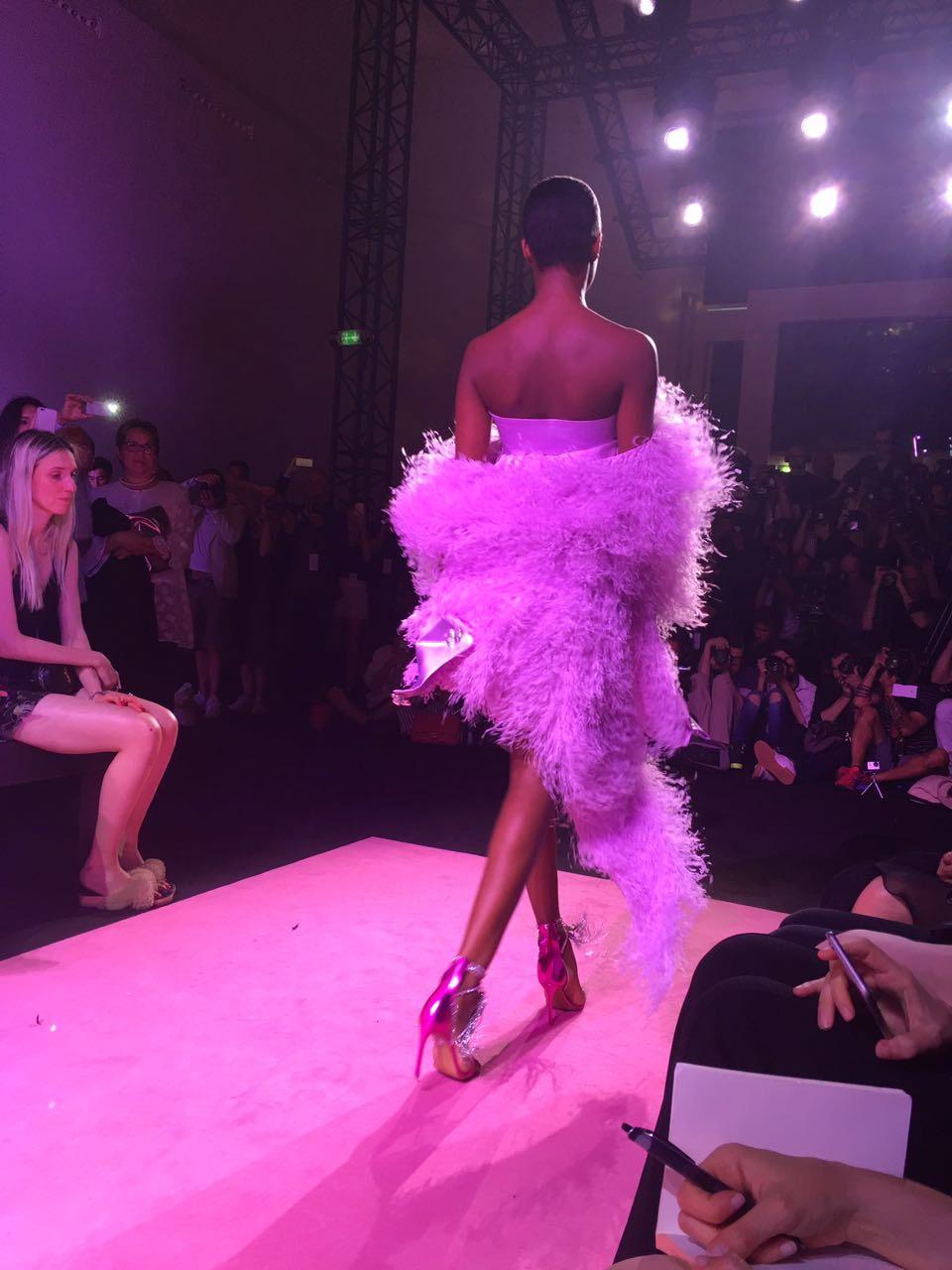 The Alexander Vauthier show took place at the Grand Palais, close-by to where the Chanel show was that morning. When we entered the room we felt like we were in a disco with the pink moving lights and loud music. We all felt like dancing.