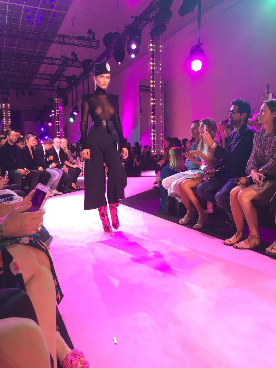 Bella Hadid opened the show and looked stunning. She was wearing an ’80s-inspired look: black pants, pink shiny boots, a transparent long-sleeved top and a small black hat. She was the star of the show.