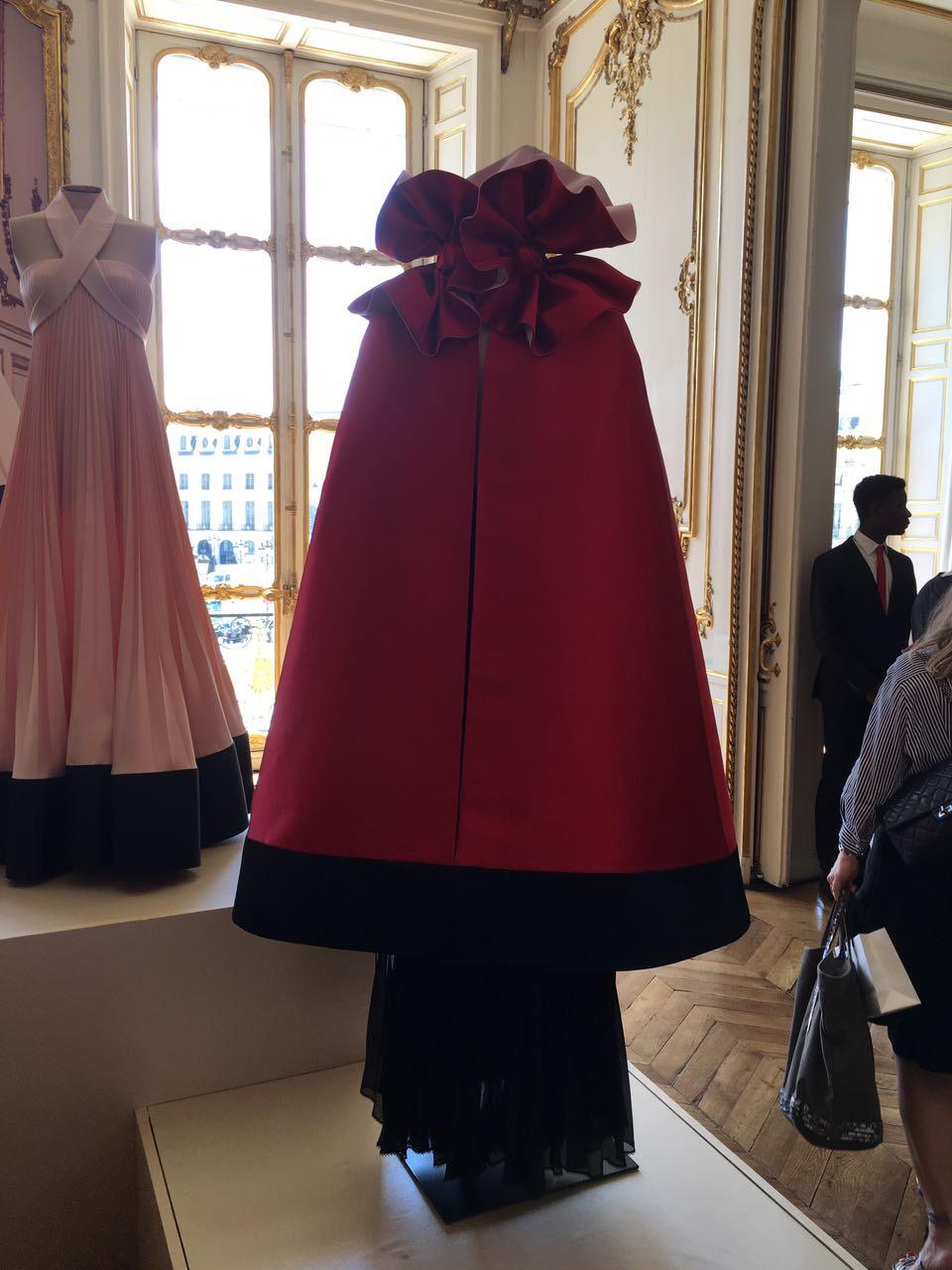 From Schiaparelli, I walked next door to the Alexis Mabille show. It took place in the Hôtel d’Evreux. The space was like a palace, with spectacular rooms and very high ceilings and golden tapestries on the walls. The dresses were exhibited in four different rooms. I met Alexis, who explained to me the work that was done in a golden coat that had big golden flowers with crystals. One of my favorite looks was a red cape made out of silk and a silver dress with large ruffled sleeves.