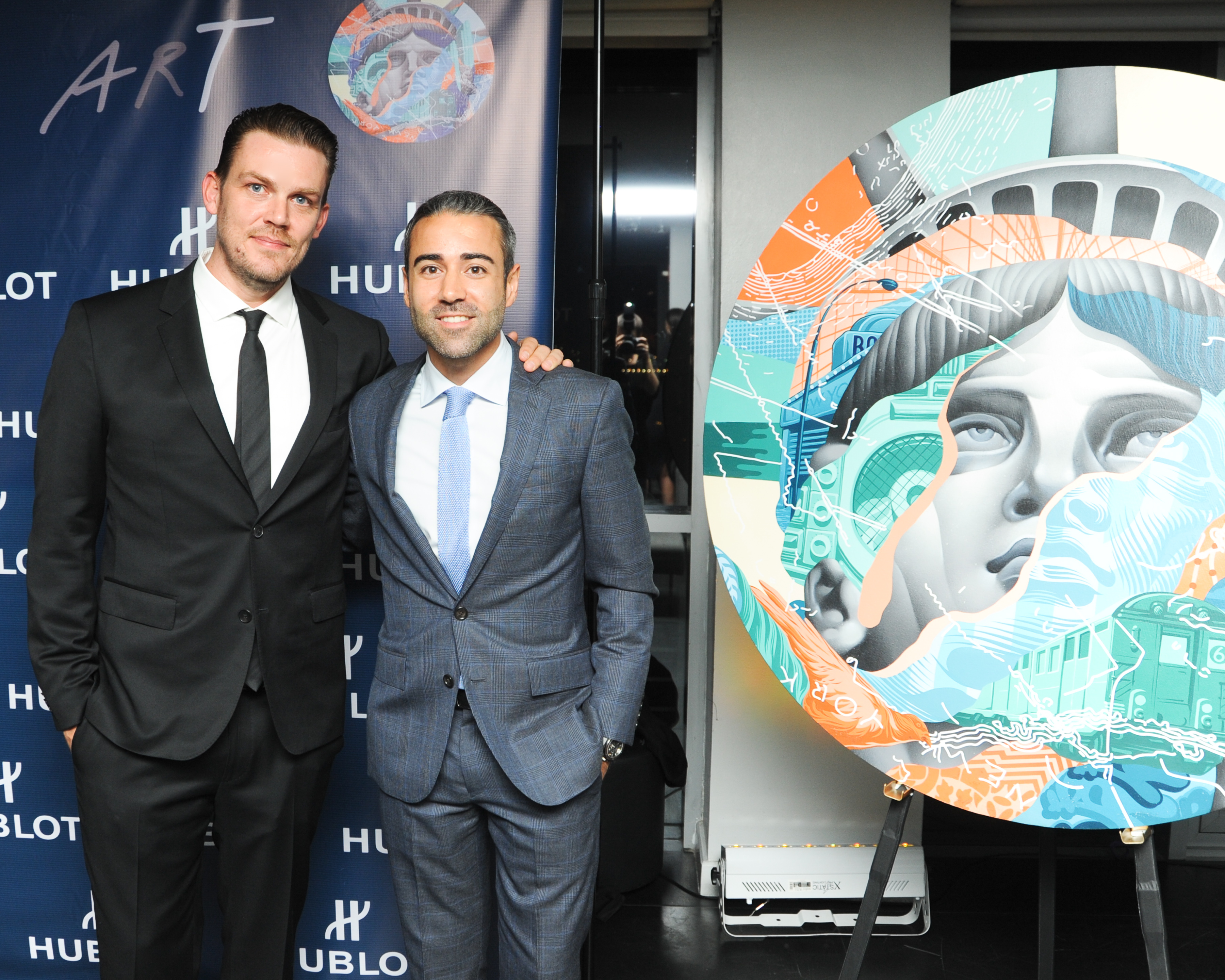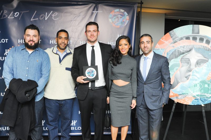Sweeping city views from the glass-enclosed penthouse at the Hotel on Rivington served as the parfait backdrop to unveil Hublot’s latest artist collaboration: Classic Fusion Aerofusion Concrete Jungle, a tribute to NYC and a continuation of the brand’s mantra “Hublot Loves Art.” The watchmakers teamed up with street artist and New Yorker Tristan Eaton for the special-edition timepiece, which features a real concrete bezel (see what they did there?) For the caseback, Eaton created a mosaic painting of the Statue of Liberty, reflective of his first large-scale work, Liberty, a five-story mural he painted in 2012 at the corner of Mulberry and Canal Streets. To kick off the evening, guests sipped cocktails and viewed Eaton’s works before heading downstairs to Cafe Medi for an intimate seated dinner of hamachi crudo, truffle-accented polenta, sea scallops, and chocolate mousse.