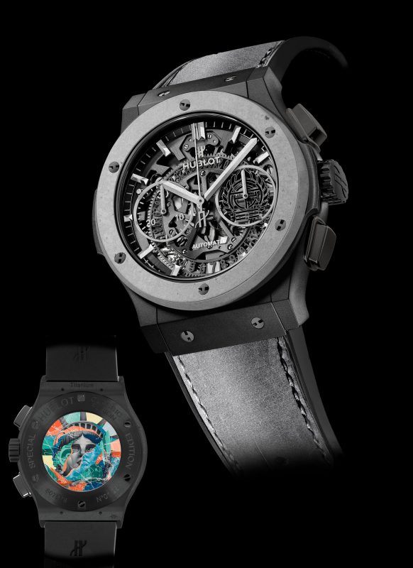 “When I met Jean-Francois [Sberro, managing director of Hublot America], he had come to Miami to meet me, and I was painting a wall, sweaty and covered in dirt, probably had the worst B.O., and wearing a spray mask. He saw through all of that and here I am today,” Eaton told guests. “[This watch is] a love letter from me and Hublot to the city. This city made me the artist I am today. I’m sure everyone here knows how hard this city can be, so to fight through that jungle and persevere means a lot. This project is a really great way to honor [that].”