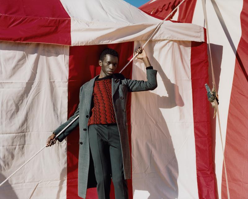 The menswear collection is rooted in the American outdoors with influences like the lumberjack, hunter, and fisherman as well as their uniforms of denim and camouflage. To keep with the film’s theme, womenswear incorporates circus elements like bold stripes, oversized bows, and high clown collars that are transformed into feminine tailoring and sportswear.