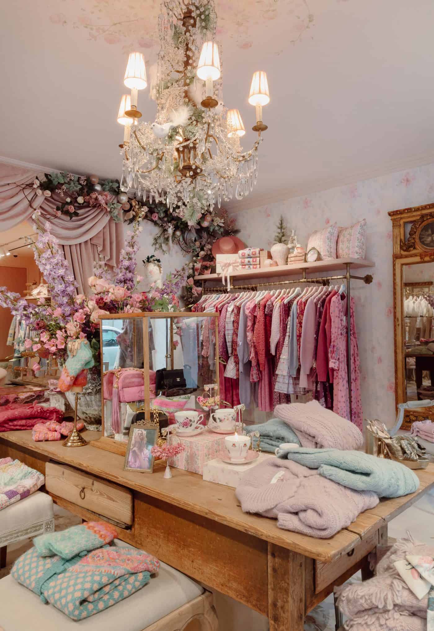 As with the other stores, it’s a smorgasbord of romantic-inspired clothing, vintage treasures, pastel hues, hand-painted wallpaper, and sumptuous details that shoppers of every age will love. The 1,100 square foot boutique houses ready-to-wear (currently in store is the swoon-worthy Resort collection and plenty of glittery marigold and gold pieces from the Fall offering), as well as swim, knitwear, home, and new collaborations.