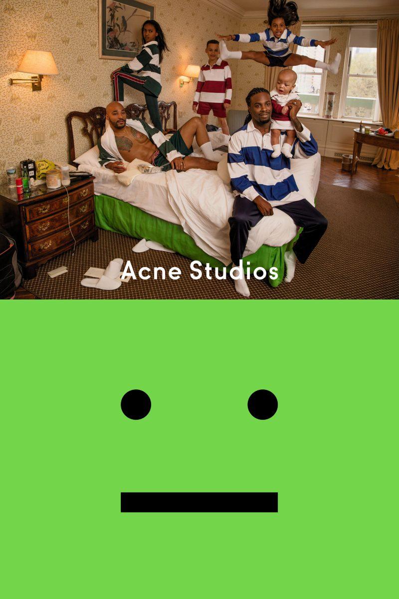 “I have been thinking about families for a long time,” said Johansson. “Since Acne Studios started as a collective, we would see each other as a family back in the days. I therefore wanted to portray households of today, in all constellations—this is how we found Kordale and Kaleb. How does the face motif fit into all of this? Well it’s just an ordinary Swedish citizen. Not too happy, not too sad, but somewhere in between. Lagom in Swedish. Like me.”