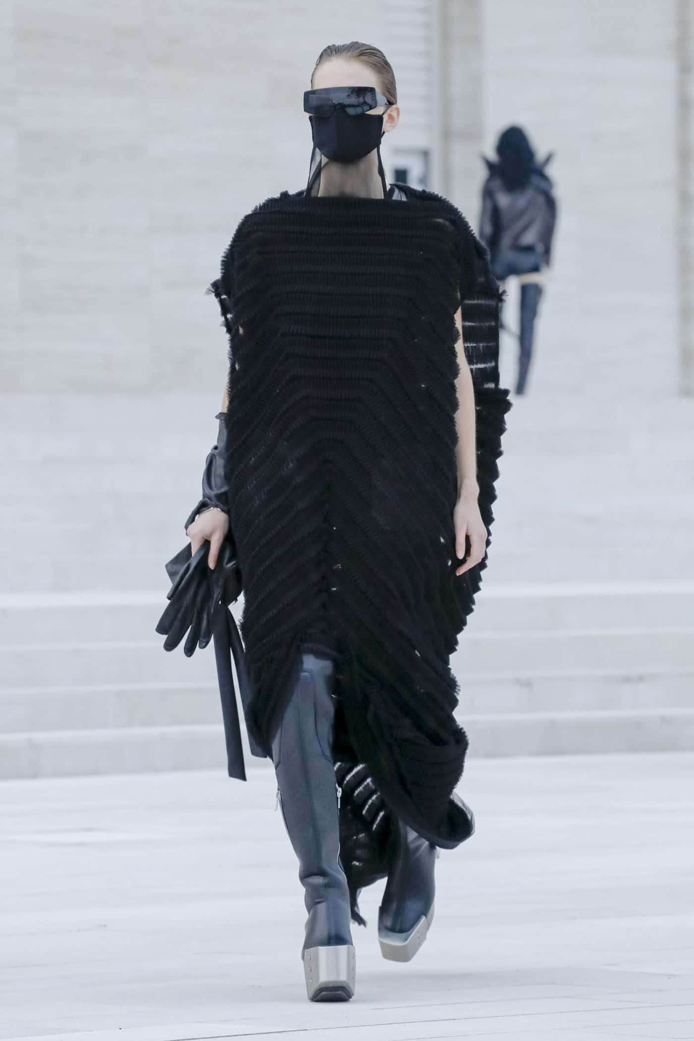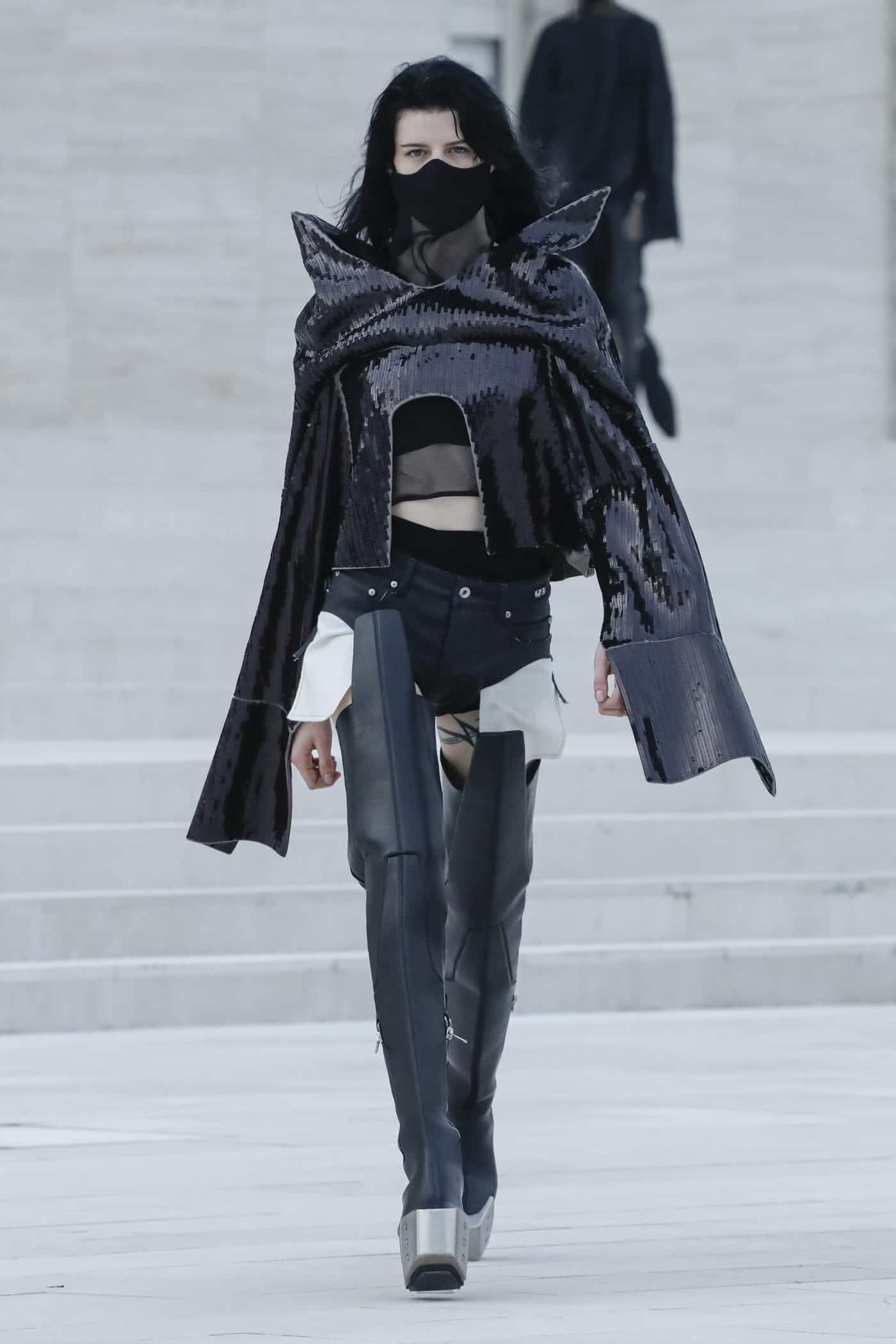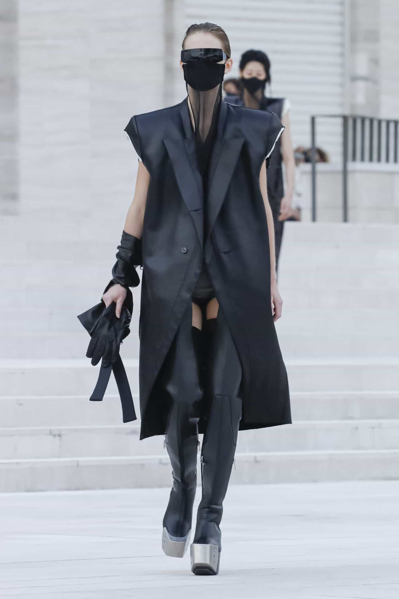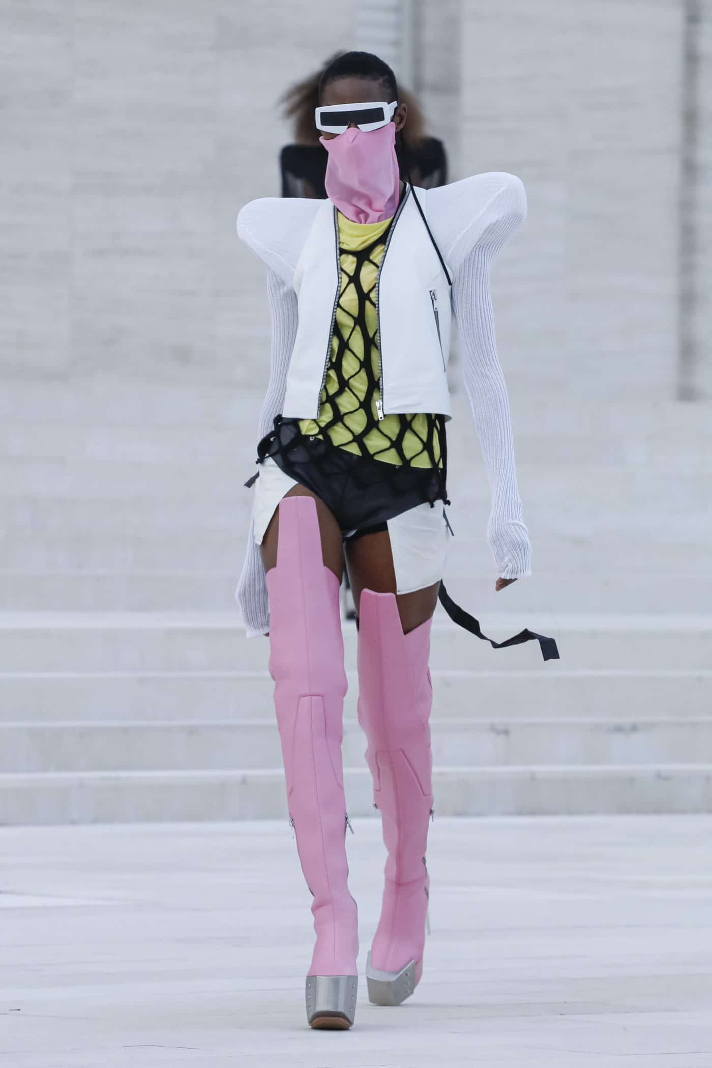 Believe it or not, Rick Owens was the only one to send his models down the runway in masks. And furthermore, the collection’s racy fishnet dresses were even up-cycled from the masks models wore in his fall 2012 show. The designer had a ‘grim gaiety’ on his mind, as per his show notes, and models looked suitable prepped for these conflicting ideals. While there was no shortage of signatures—slim-fitting destructed tailoring, leather, and, strong shoulders—there were also little moments of uplifting joy in the Pepto Bismol-pink hues and the surprising addition of sequins.