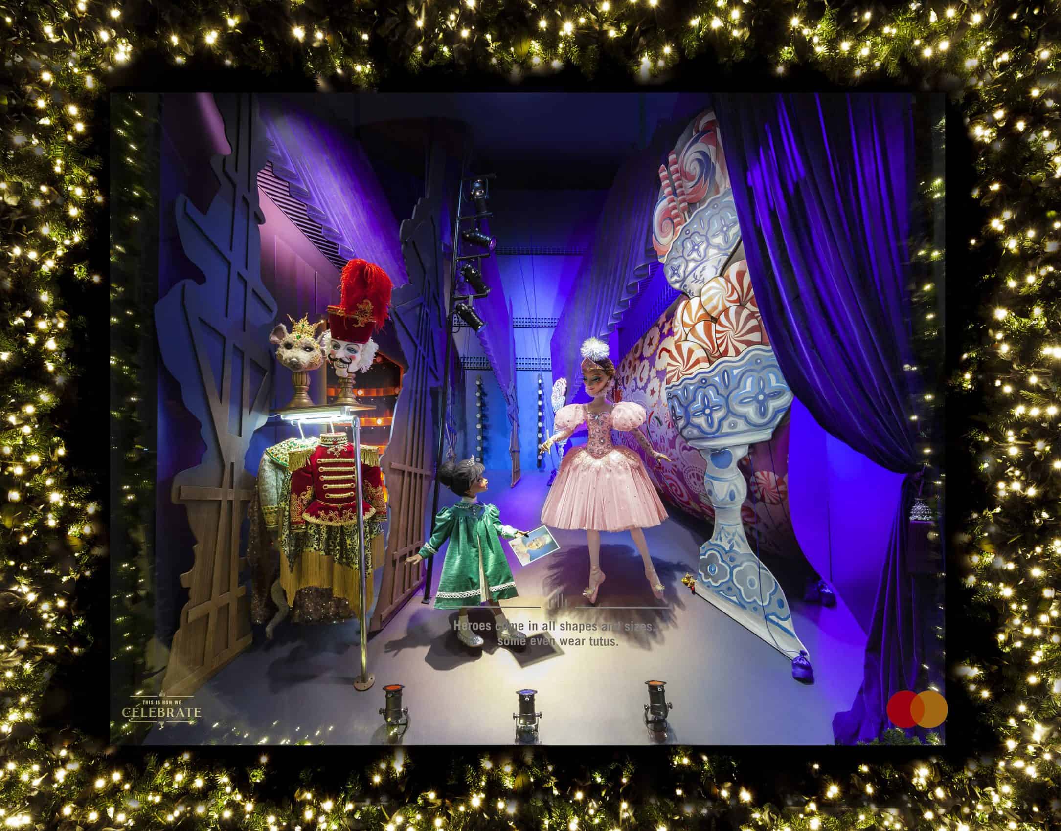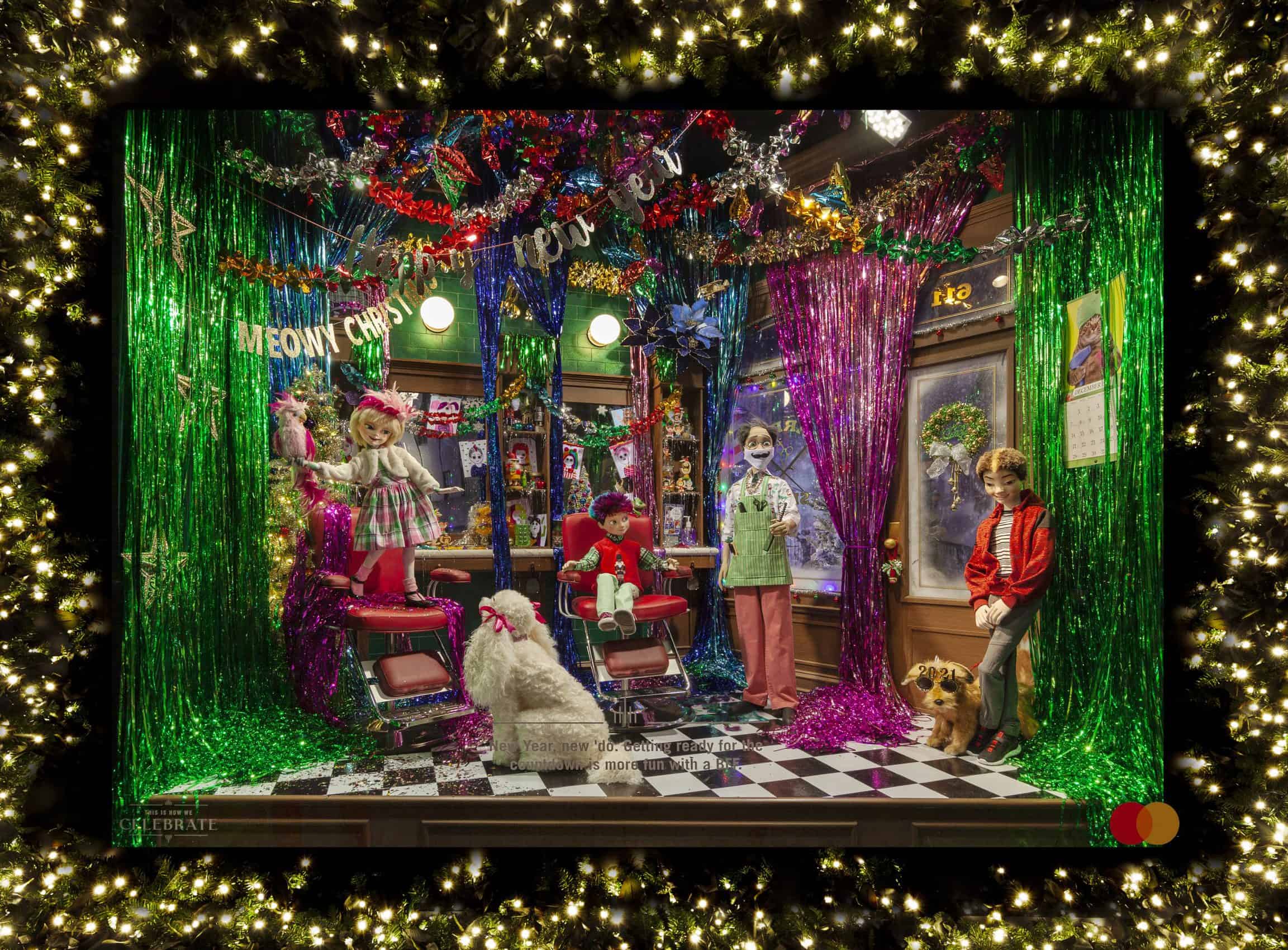 The theme this year is ‘this is how we celebrate’—shining a light on the importance of spending time with loved ones and the different ways people and places across the country celebrate. The windows showcase how different people celebrate in iconic settings around the city, with each joyous scene bringing to mind a different quintessential New York moment: a musical celebration on Broadway, a classic barber shop getting a visit from some adorable kids and their pets, a couple on their way to deliver gifts via the Roosevelt Island tram, an aspiring dancer getting an autograph from her ballerina idol, a celebration surrounding the neighborhood food truck at a holiday block party, and a friendly competition of holiday lights and decor at neighboring houses in Brooklyn’s Dyker Heights.