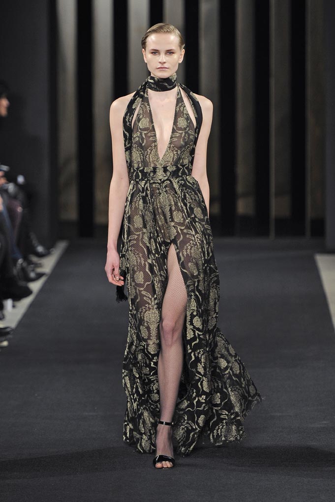 But Mendel said the collection was as much about nightlife as it was about what that woman wears during the day. The Mendel woman’s daytime attire involves sumptuous fur coats, pencil skirts with slits and charmeuse blouses, and “day” dresses cut away at the shoulders to reveal some skin. By night? A sequined silk organza deep-v wrap dress or a gold lurex jacquard halter jumpsuit. She’s not exactly dressing down, ever. Such is the life of a glam J.Mendel girl.