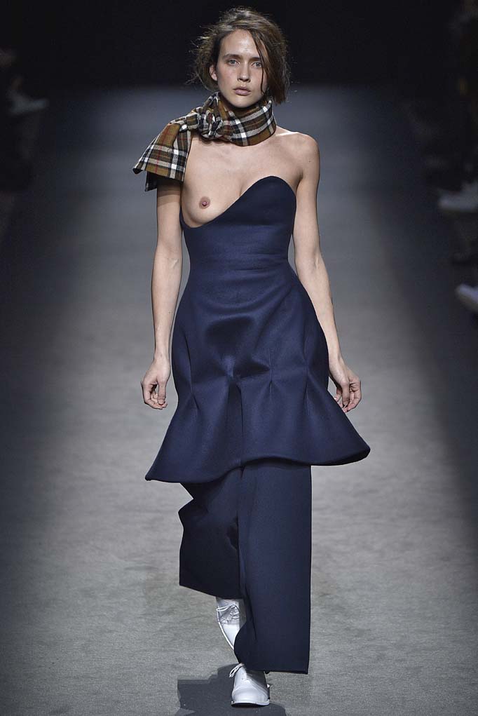 Jacquemus’ collections always seem like a surreal fashion dream come to life. There were oversized suit jackets with enormous shoulders and no armholes, tops and tunics with elevated shoulder ties that seemed to suspend from the air, a dress attached to a shirt worn sideways like a sash, and so on. He even one-upped Versace’s now famous Gigi nip slip with an intentional display of a full breast thanks to a dip in the bodice of a strapless navy dress.