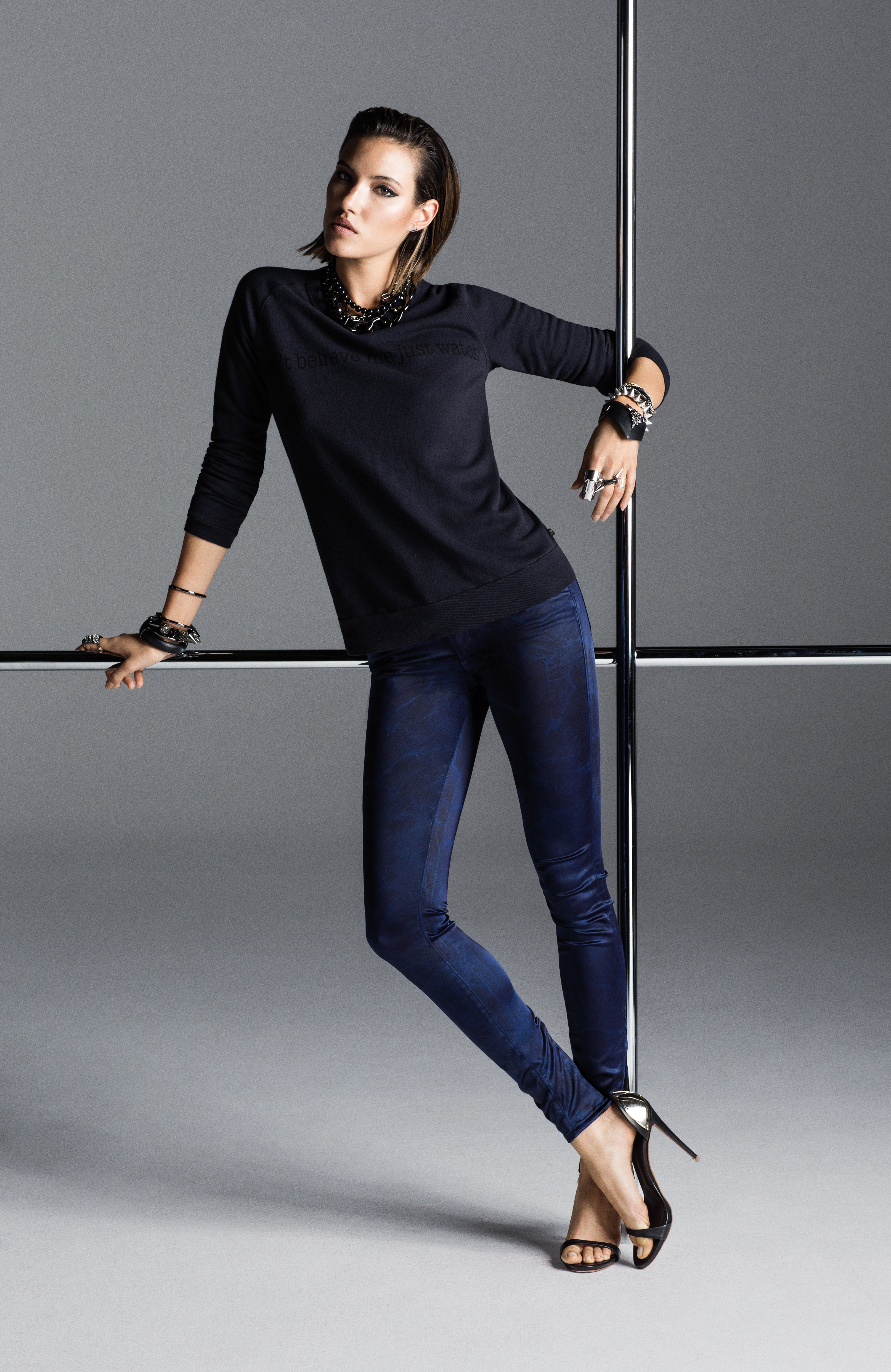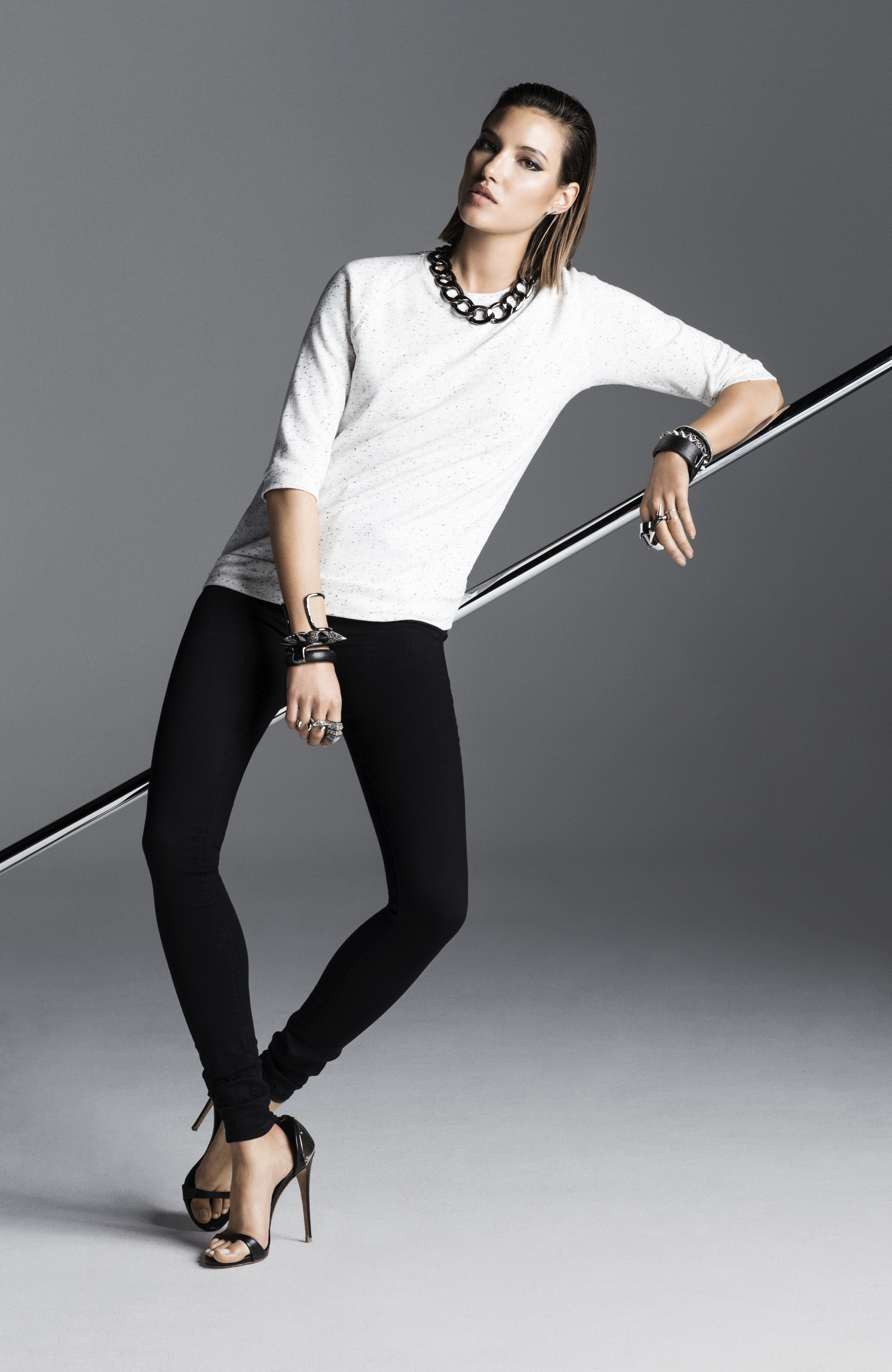 Denim to discuss: Joan Smalls’ debut capsule collection for True Religion, filled with delightfully stretchy skinnies (from classic noir to a washed satin spin in grey that resembles the gently-rippled effect of the bottom of a pool) and chic cropped sweatshirts, some flaunting phrases chosen by Smalls, as well as a logoed sports bra and more. The line hit stores last week, and she toasted the collection last eve with a din at the Gramercy Park Hotel with the likes of Prabal Gurung, Steven Klein (who shot the sexy campaign), and Lily Donaldson. We had a quick chat with Smalls about the chic project…