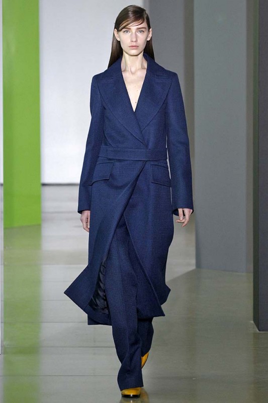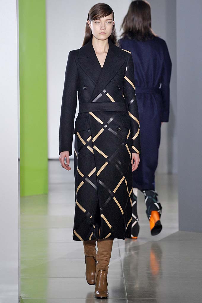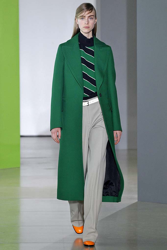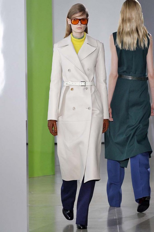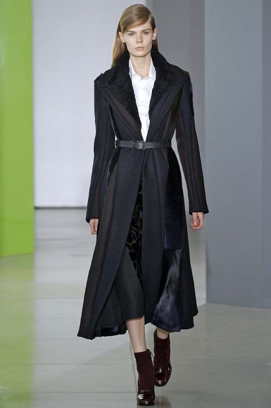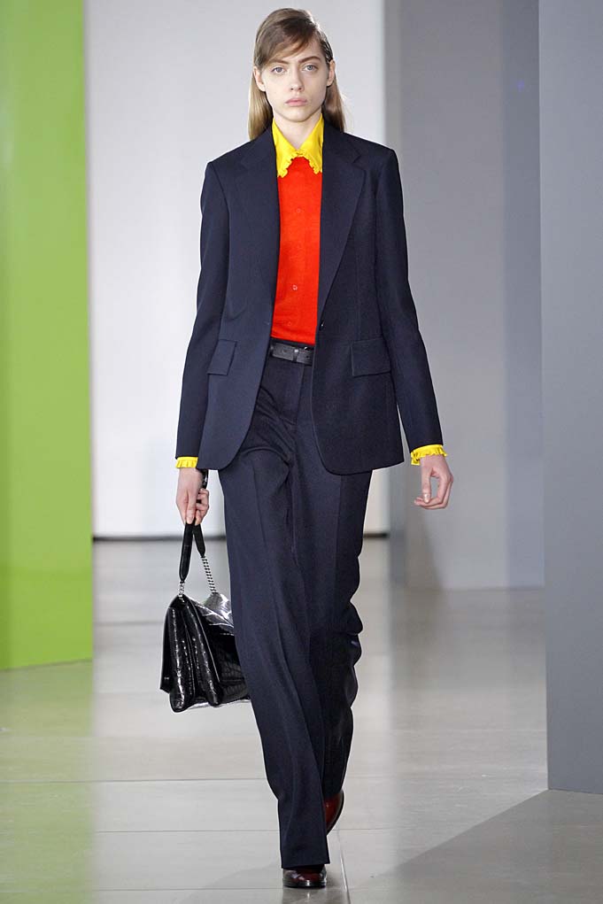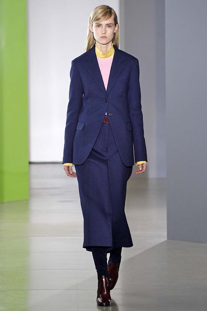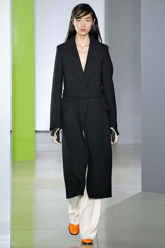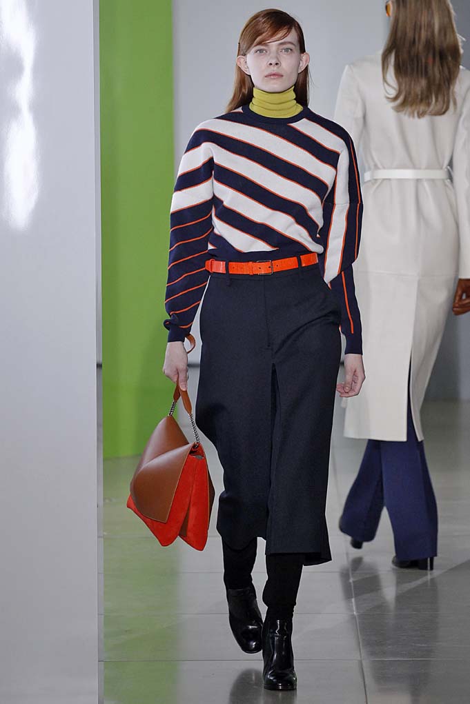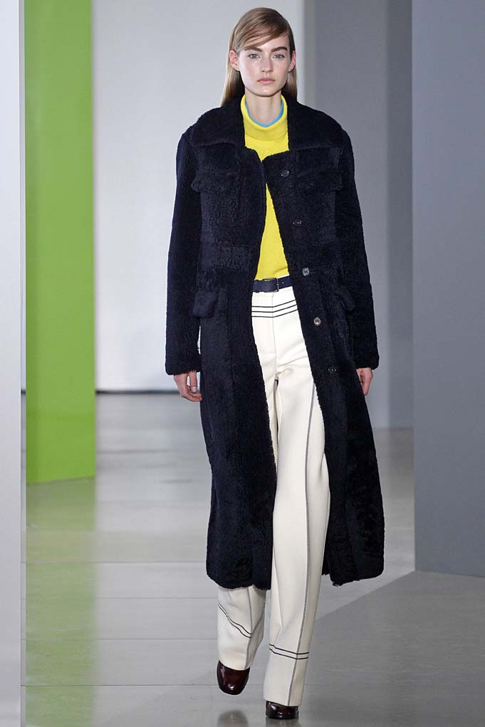 Strong suiting was the name of the game at Jil Sander, although this collection was replete with far more color than is usually associated with the brand. The show started off with a long navy coat, layered over coordinating pants, but the yellow shoes hinted at the colorful pieces to follow. Like sweaters with pink and white turtlenecks and a fur jacket sporting a yellow, black, white, and green pattern. Yes, even prints made an appearance, albeit in a very controlled and neat manner. Rugby stripes diagonally crossed a knit top. Gaffer tape-esque lines found their way across a blousy top and a black skirt. A delicate plaid adorned long jackets and vests. However, the best pop of color here may have been in the form of boots; in vivid hues of orange and yellow, they brightened up a collection that was mostly composed of black and white.