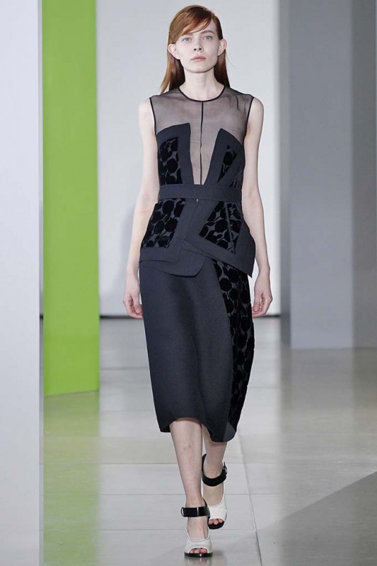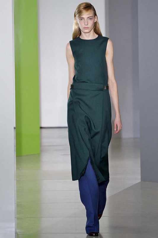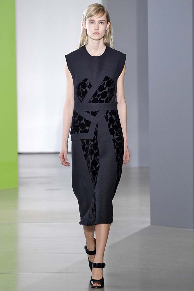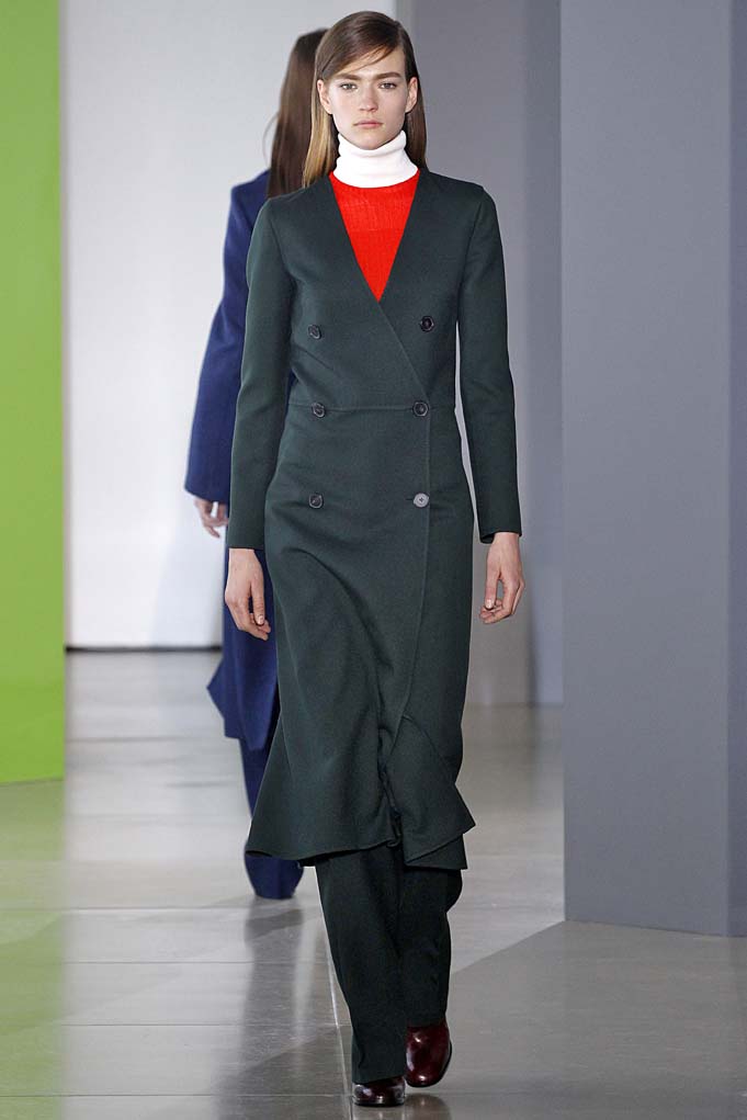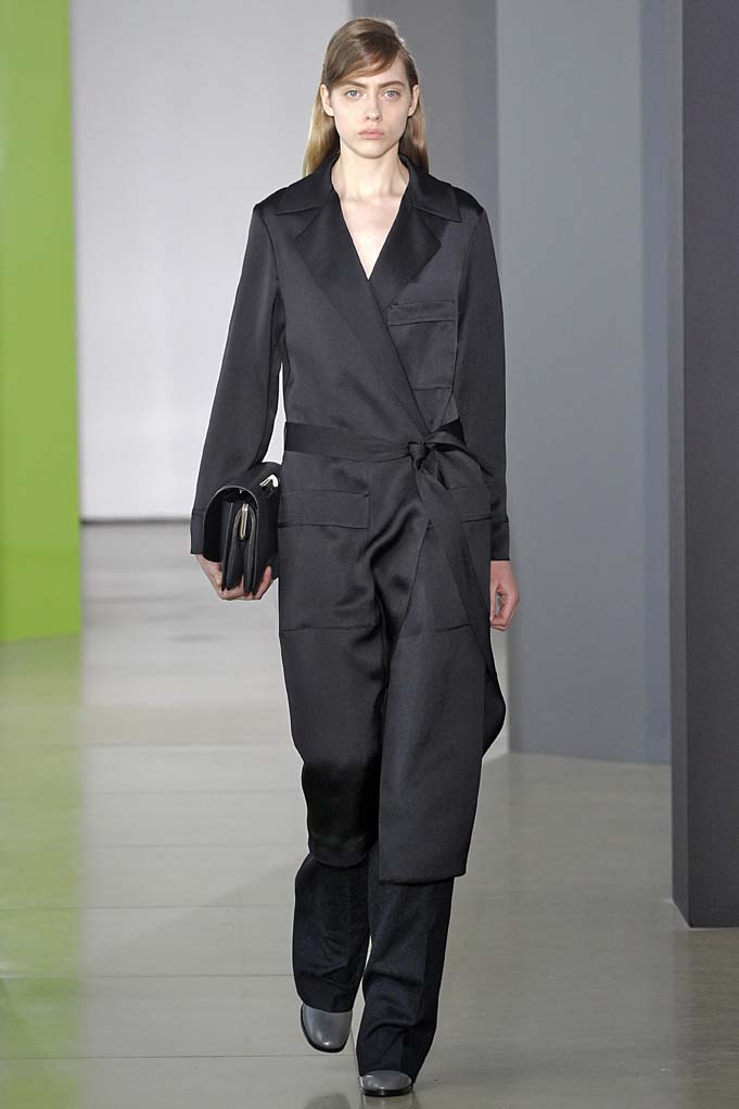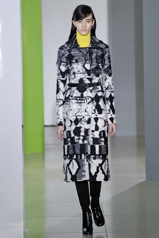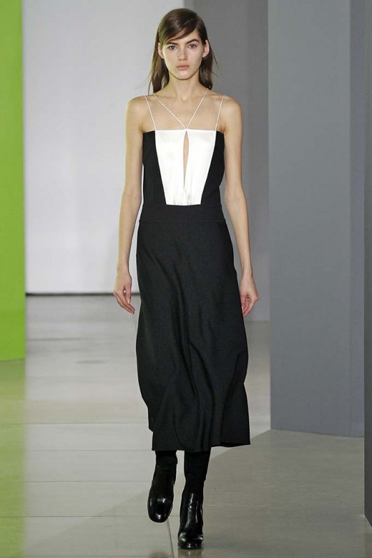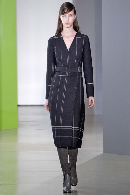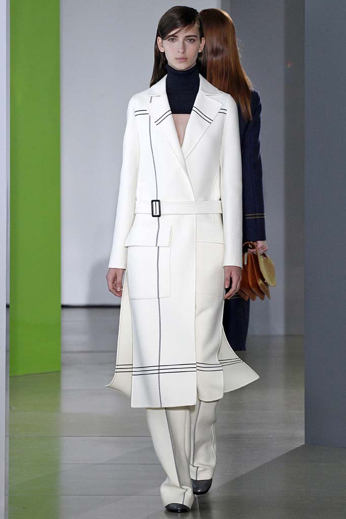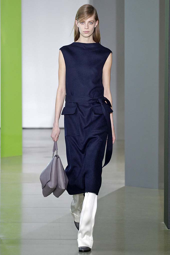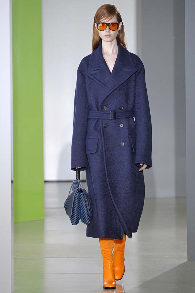Strong suiting was the name of the game at Jil Sander, although this collection was replete with far more color than is usually associated with the brand. The show started off with a long navy coat, layered over coordinating pants, but the yellow shoes hinted at the colorful pieces to follow. Like sweaters with pink and white turtlenecks and a fur jacket sporting a yellow, black, white, and green pattern. Yes, even prints made an appearance, albeit in a very controlled and neat manner. Rugby stripes diagonally crossed a knit top. Gaffer tape-esque lines found their way across a blousy top and a black skirt. A delicate plaid adorned long jackets and vests. However, the best pop of color here may have been in the form of boots; in vivid hues of orange and yellow, they brightened up a collection that was mostly composed of black and white.