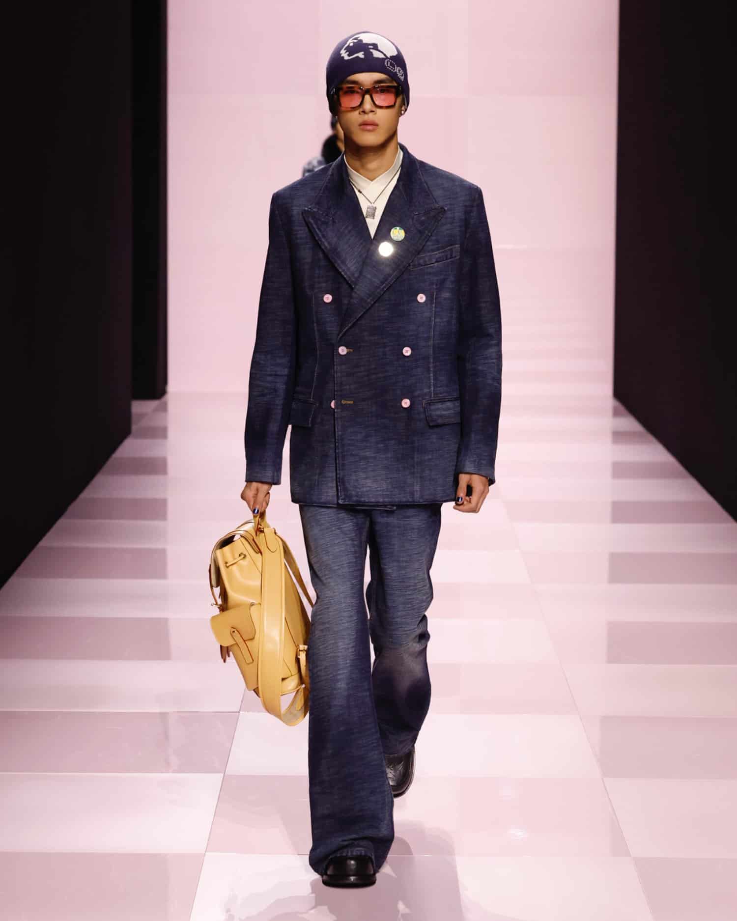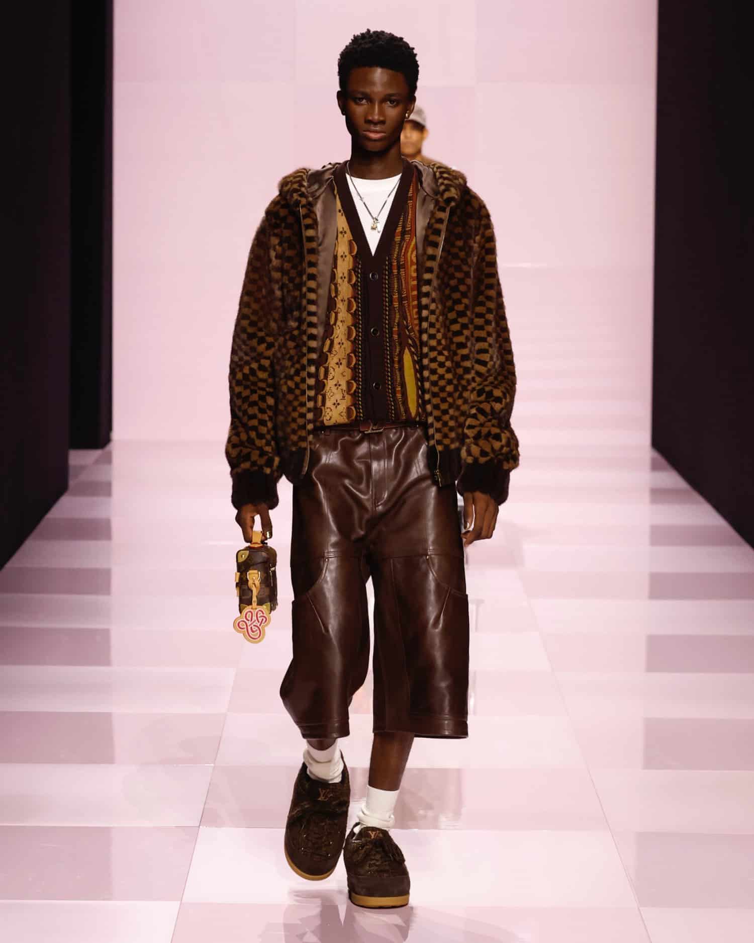 Pretty in pink! Louis Vuitton returned to the runway at Paris Fashion Week Men’s, complete with a new collaboration with Nigo. Creative director Pharrell Williams’ Fall 2025 collection was set against a glossy pale rose interior, covered in the house’s signature checked Damier print—which also appeared across swearers, cardigans, and various handbags in hues of pink, yellow, blue, and brown. Also central to the collection’s utilitarian roots were Williams’ new takes on Vuitton’s signature trunks—accented with pressed flowers, transparent sides, and allover monochrome hues. Pops of collaged monograms, multicolored florals, leopard spots, and checkerboard prints brought a cheerful finish to the array of wide-legged trousers, dark denim, leather jackets, ’70s-inspired suiting, and elegant overcoats.