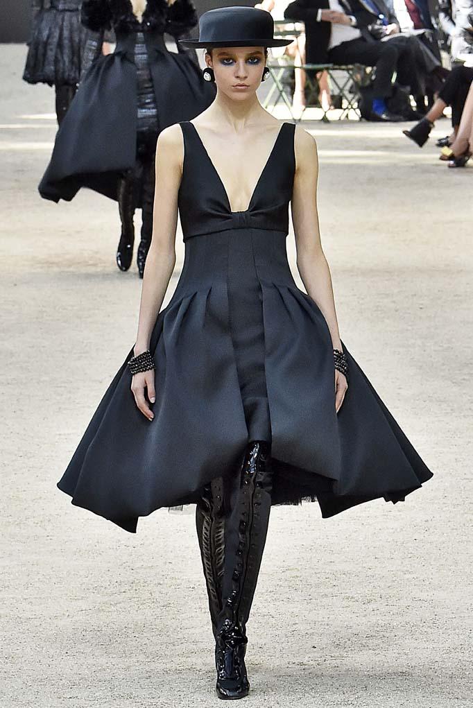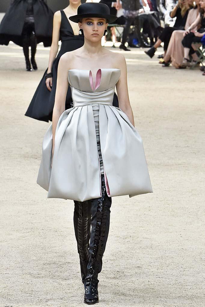 Reflecting the structure that loomed over the audience, the Haute Couture collection was dedicated to its perfection: all at once simple, complex, and magnificently out-of-reach. Each sculpted silhouette highlighted the incredible craftsmanship of Chanel’s petit mains and the brilliant designs of Lagerfeld that have kept this French house at the very pinnacle of fashion. The collection featured curvy hourglass coats and suits as well as linear tunics and jackets worn over skirts and pants cropped just above the ankle. The latter was the kind of thing only a woman with Eiffel Tower height could truly pull off as a full ensemble. Some of the most spectacular pieces were eveningwear gowns and cocktail dresses that fanned out in a bell shape like the legs of Paris’ famous landmark. Each look was topped off with a Chanel canotier hat, like the ones Gabrielle Chanel was famous for wearing. To spot an elegant woman trotting down the rue Saint-Honoré in one of these creations? Now that’s the kind of tourist attraction we would pay to see!