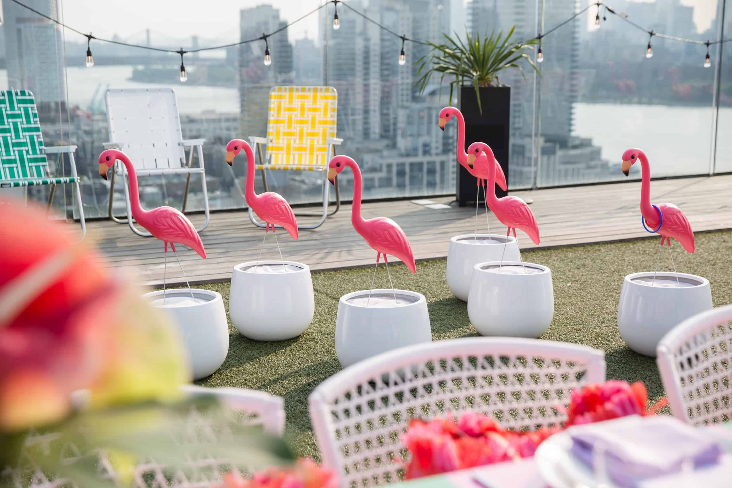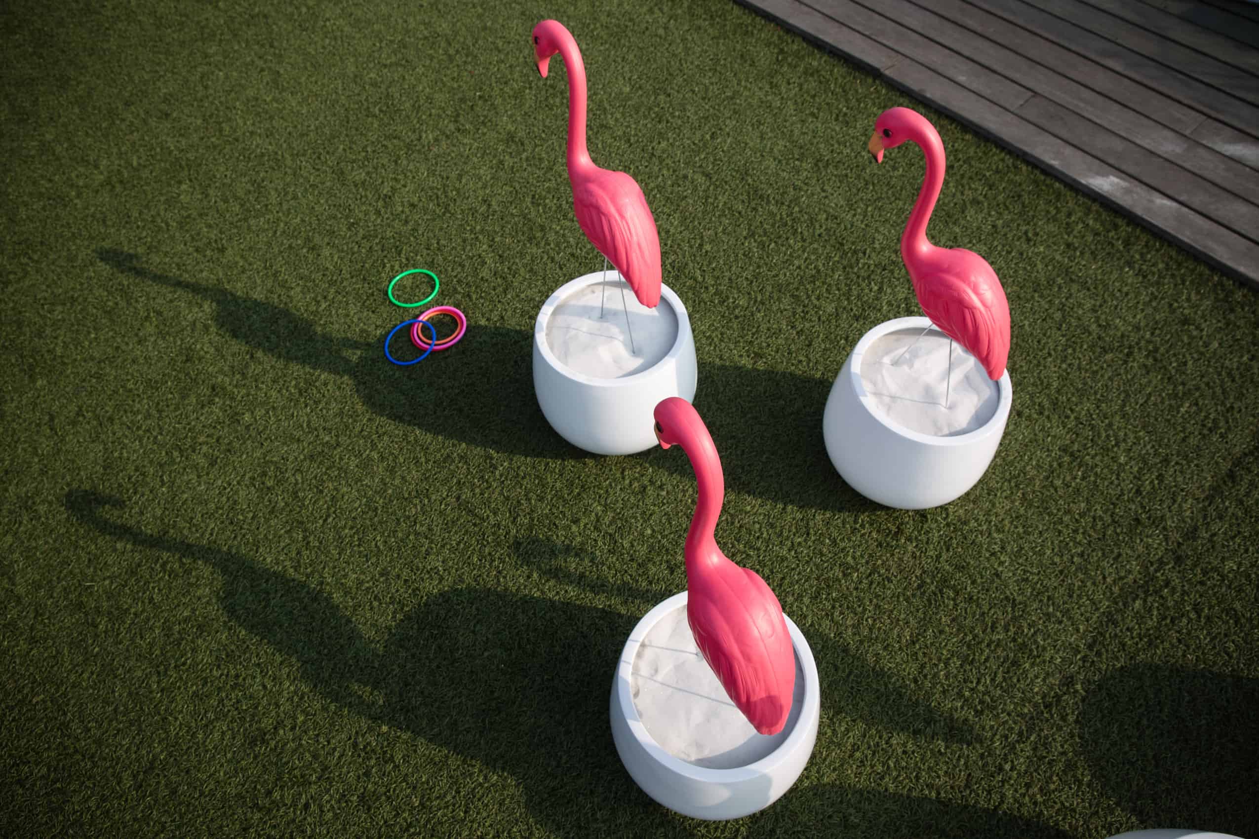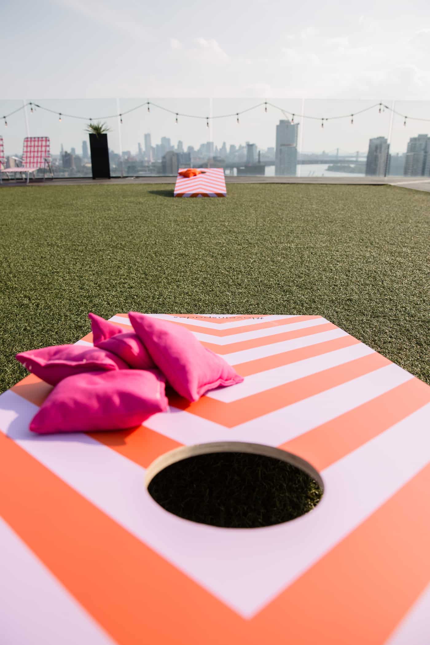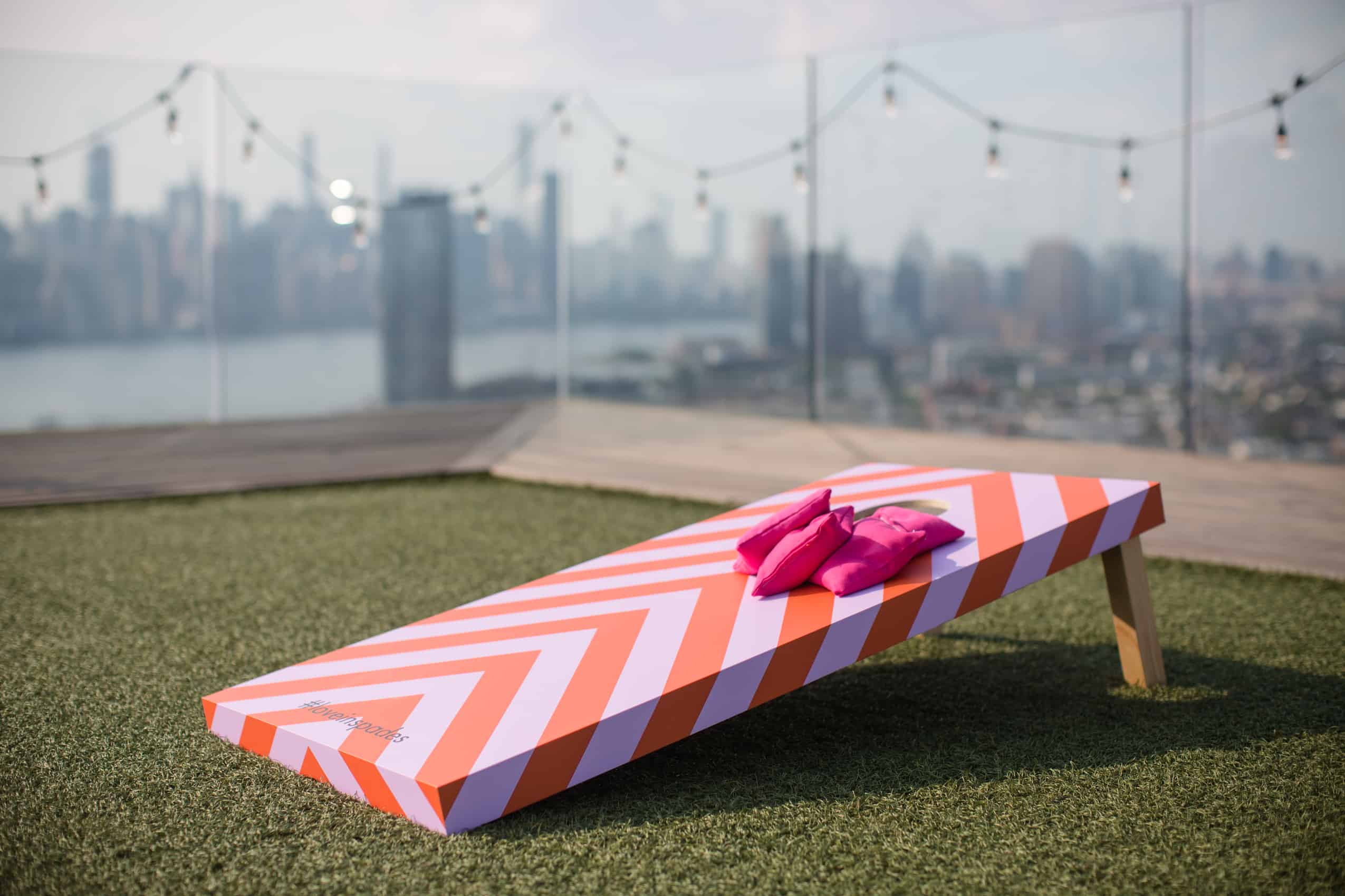 Also on-theme were the classic backyard games like corn hole and ring toss, both of which were given the full Kate Spade treatment with the help of some pastel paint and a flock of potted flamingoes.