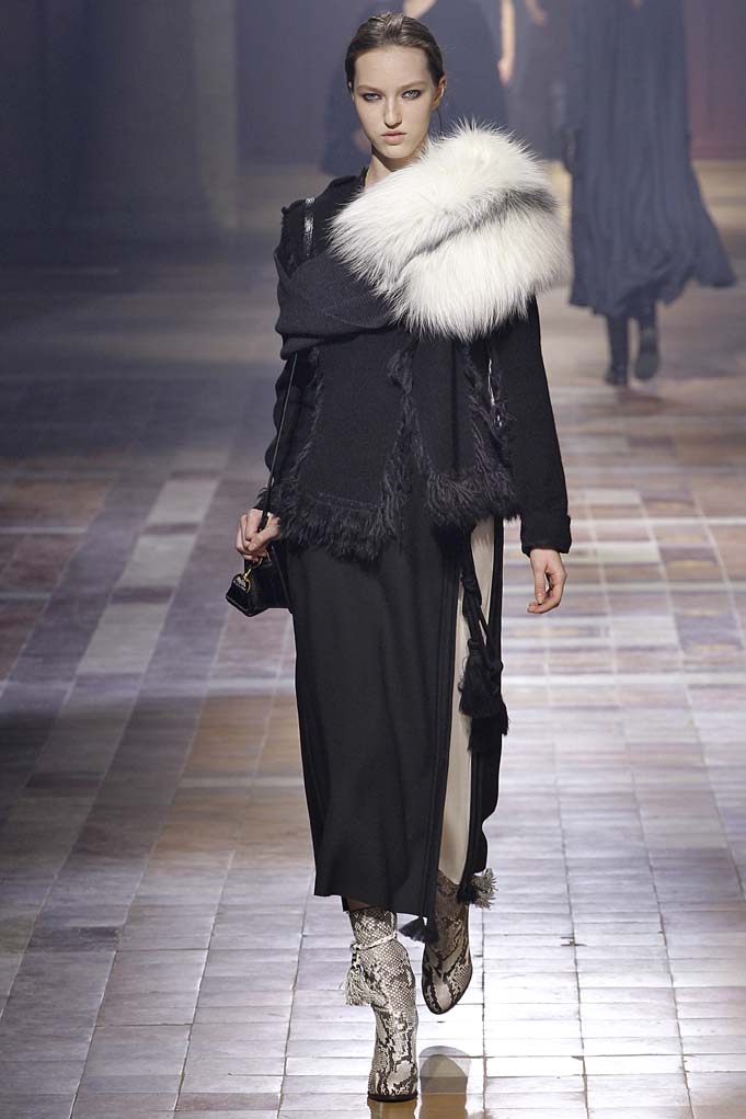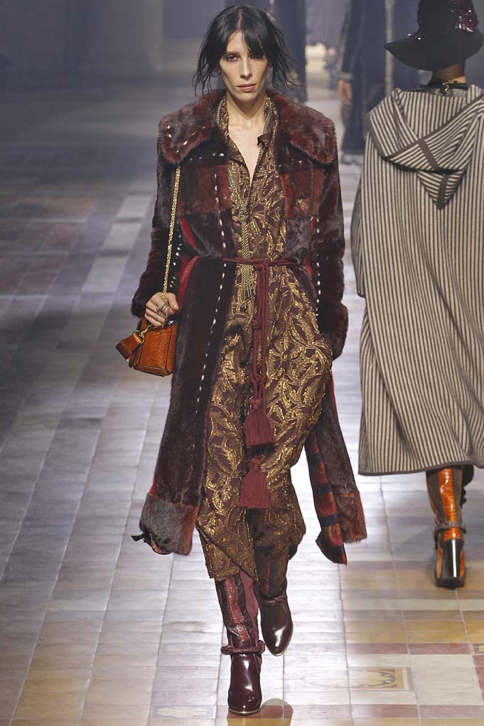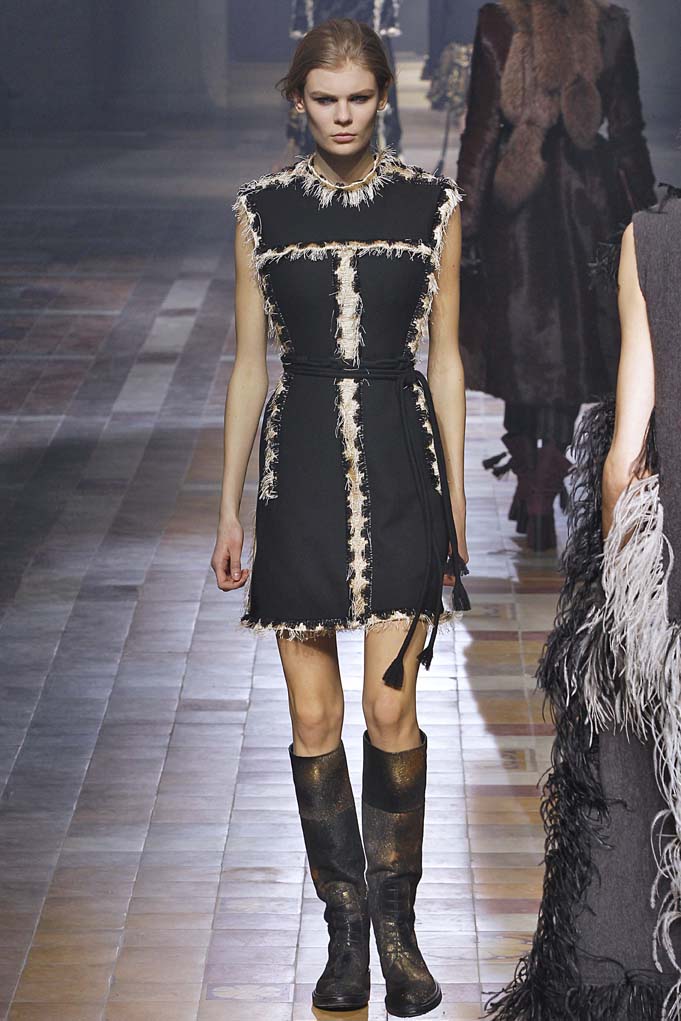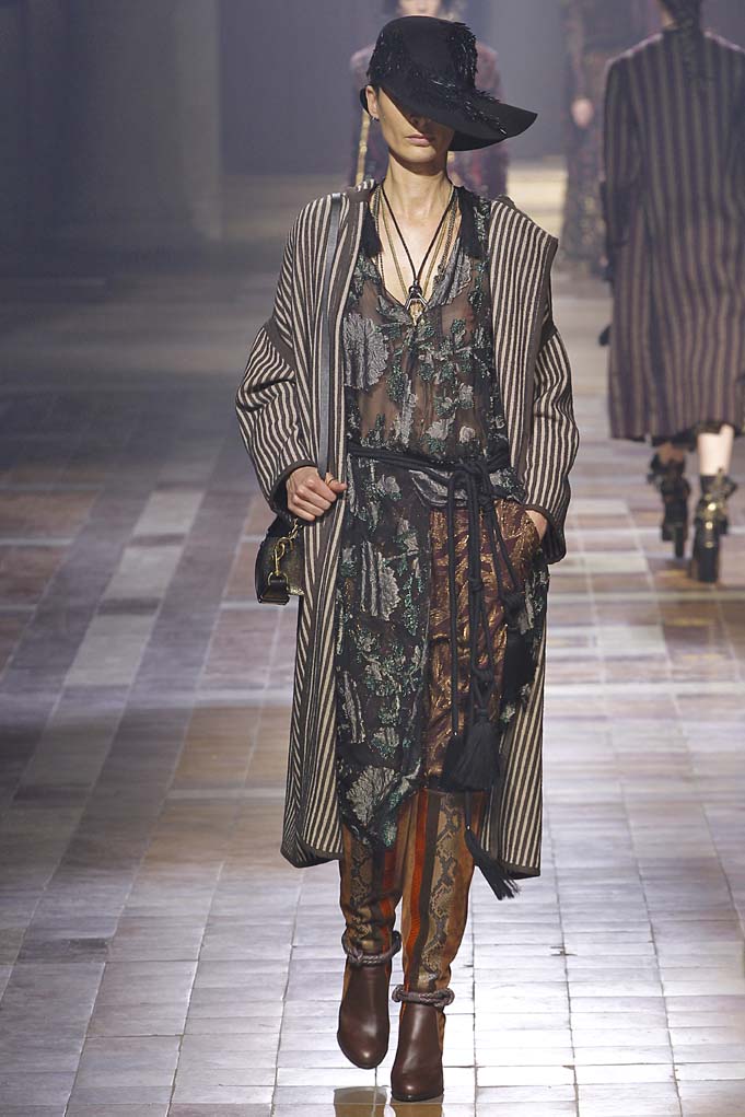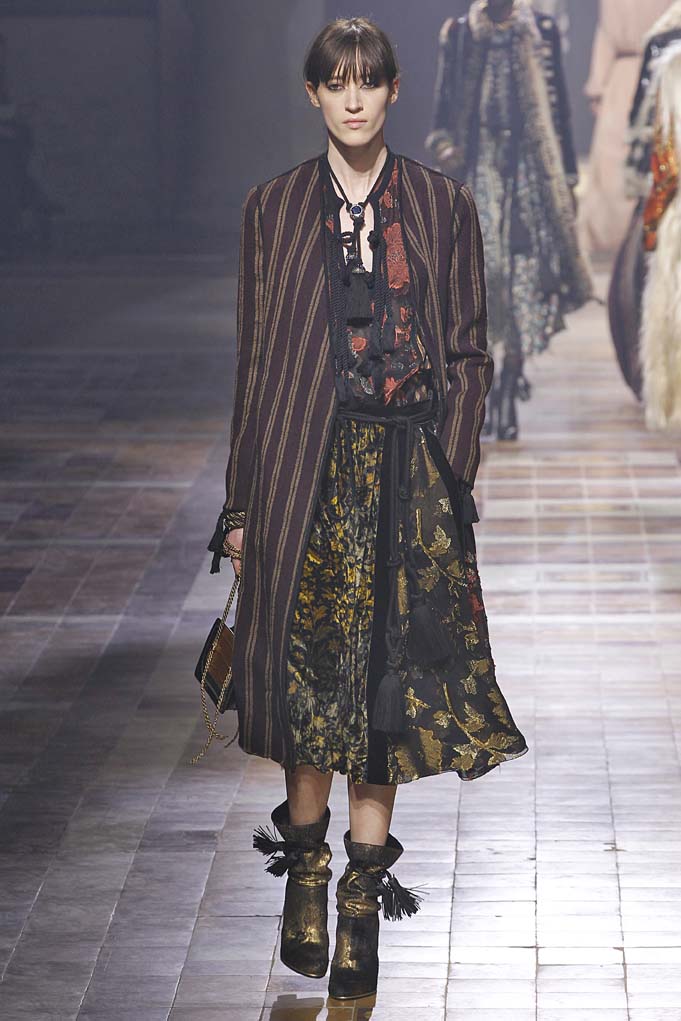 Alber Elbaz turned out a stunning collection that revisited his birthplace, Casablanca, Morocco. There was tassels, fringe, and shearling. Looks were styled a few different ways, including a Berber-inspired iteration, with layers upon layers of clothing and prints. To wit: a heavy fur coat was worn over striped pants with a fur neck warmer, a printed velvety tunic, and suede tasseled boots, while a thick shearling and leather coat was worn over a long printed skirt tied at the waist with huge drapery-esque tassels. Then there was the military element with chic high-waisted pants with a stripe tucked into riding boots or the long swinging coats with roped epaulets. Amid the collection’s ornateness, there were a few clean, sleek looks, like a white dress with black piping that followed the lines of the body down to two thigh-high slits.