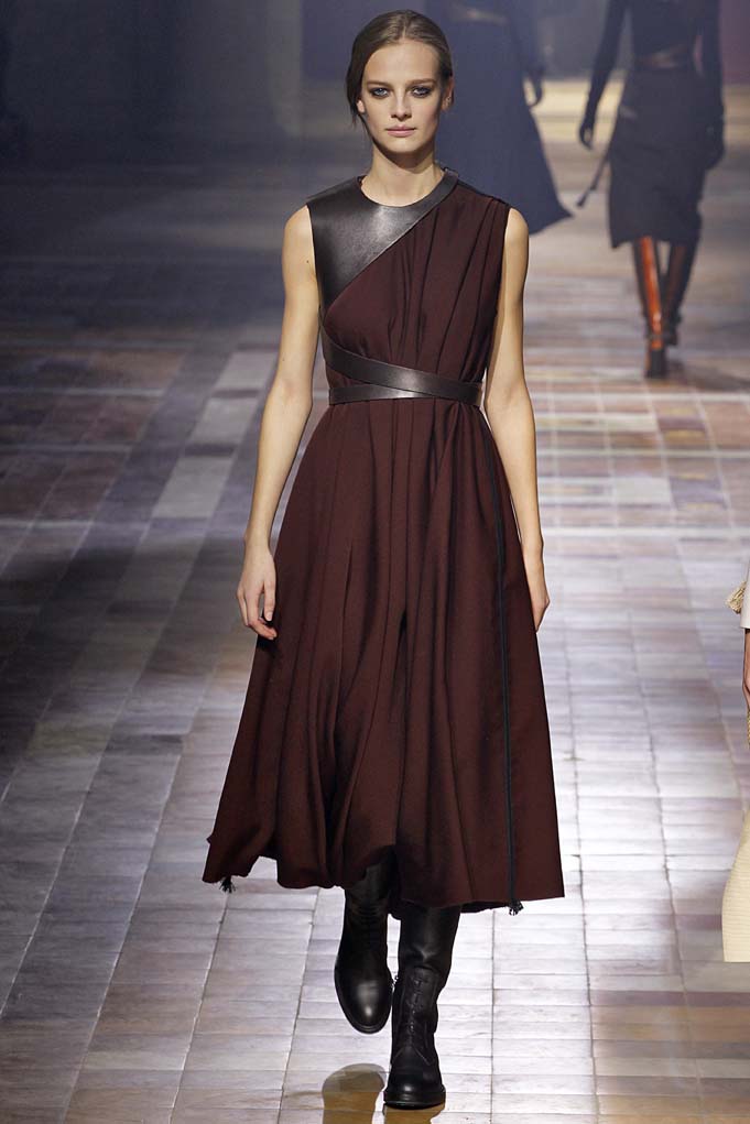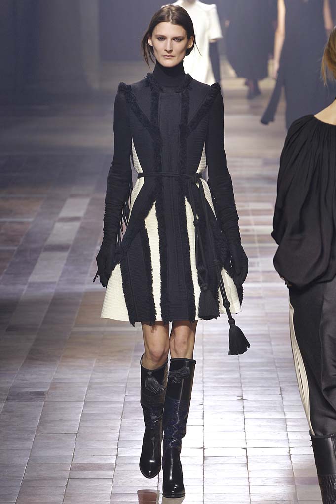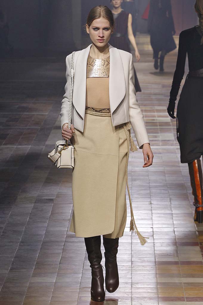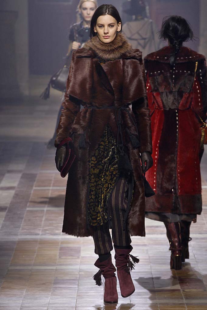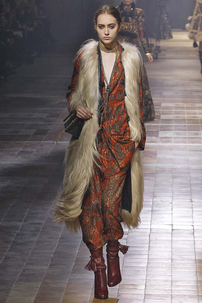 Alber Elbaz turned out a stunning collection that revisited his birthplace, Casablanca, Morocco. There was tassels, fringe, and shearling. Looks were styled a few different ways, including a Berber-inspired iteration, with layers upon layers of clothing and prints. To wit: a heavy fur coat was worn over striped pants with a fur neck warmer, a printed velvety tunic, and suede tasseled boots, while a thick shearling and leather coat was worn over a long printed skirt tied at the waist with huge drapery-esque tassels. Then there was the military element with chic high-waisted pants with a stripe tucked into riding boots or the long swinging coats with roped epaulets. Amid the collection’s ornateness, there were a few clean, sleek looks, like a white dress with black piping that followed the lines of the body down to two thigh-high slits.