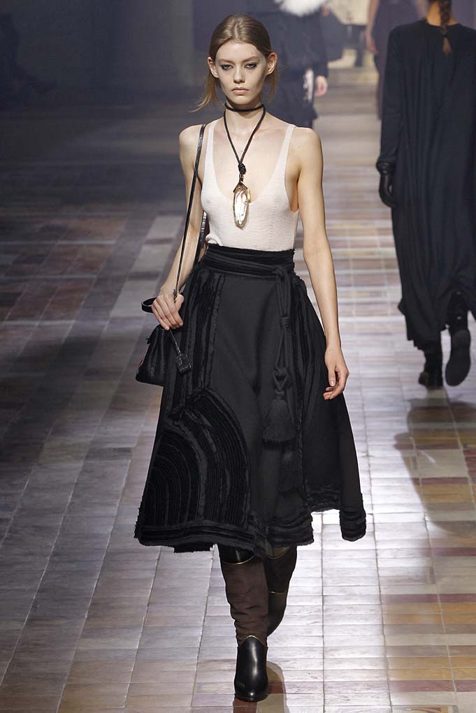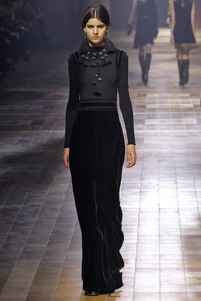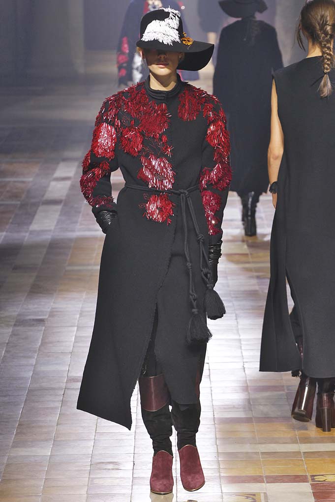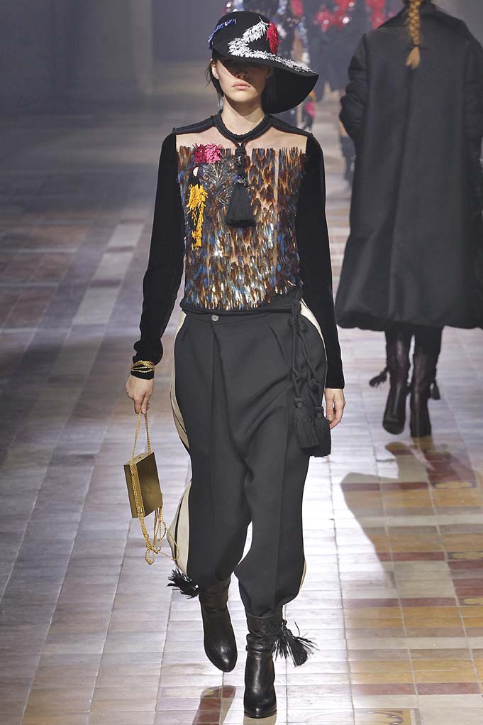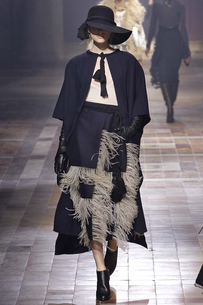 As for the accessories? There is always an accessory du moment on a Lanvin runway, and this season the must-have is going to be the brimmed caps with large tassels that fell to one side of the face, and the embellished fedoras with only half a brim. It was an extraordinary showing from Elbaz, culminating with feathery flecks of sequined florals intricately spilling down the shoulders of a wool coat or a cape thrown over an embellished blouse worn with a medallion necklace with trio of hanging tassels. These are the kind of clothes fashion fantasies are made of.