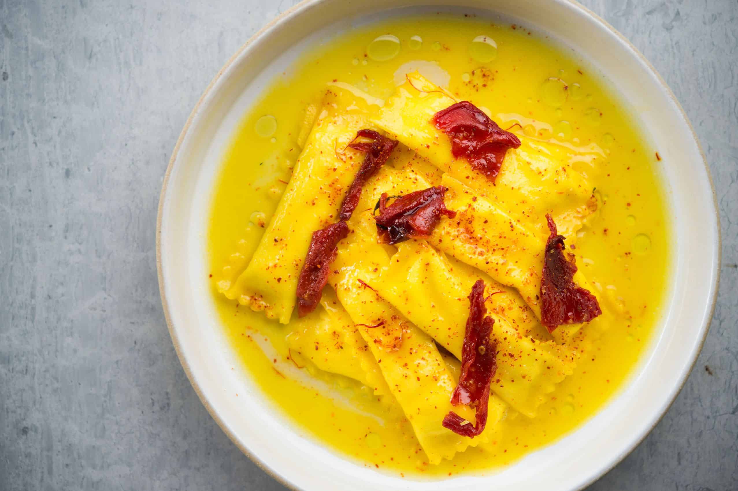 - Sheeps Milk Cheese Filled Agnolotti With Saffron, Dried Tomato, and Honey