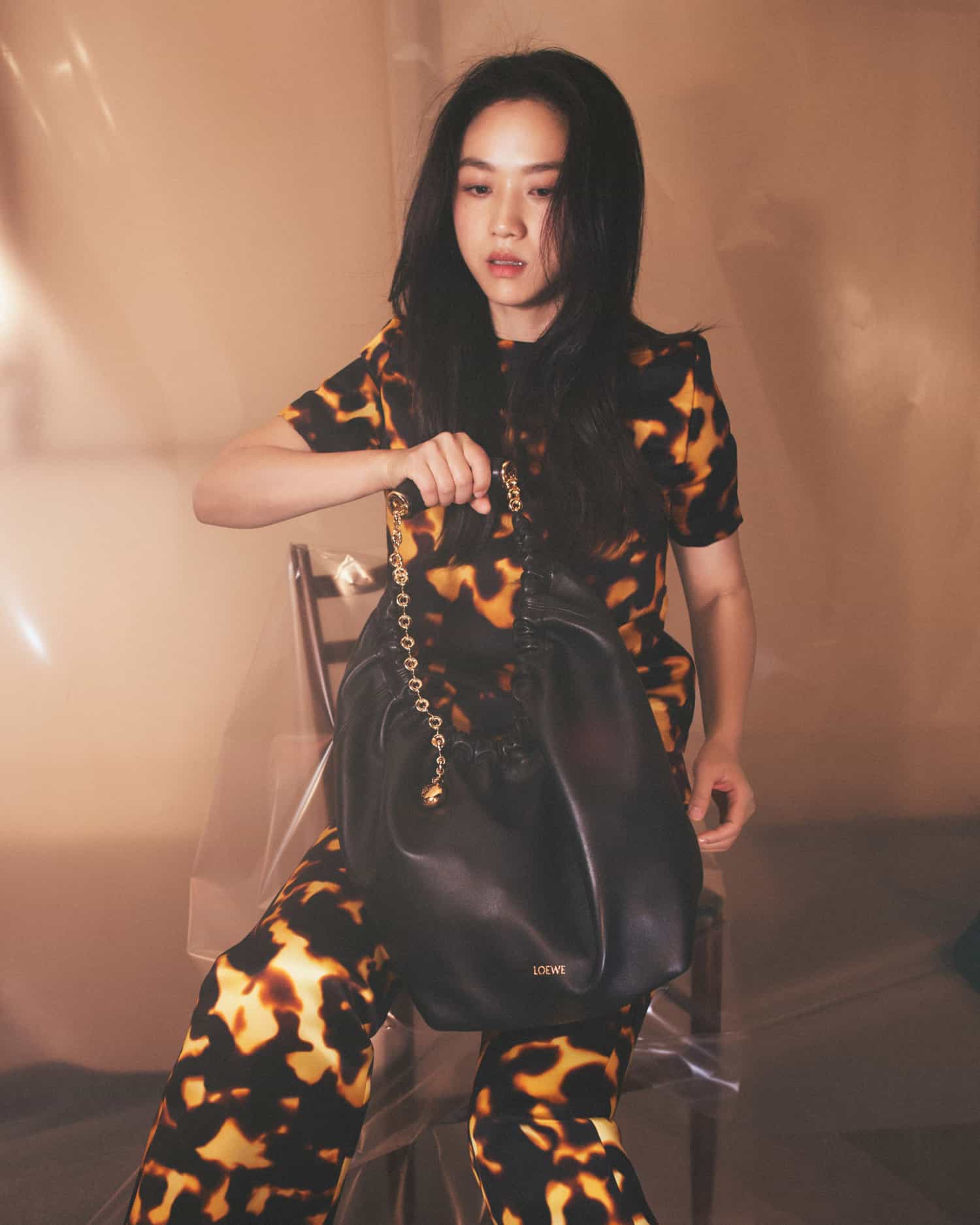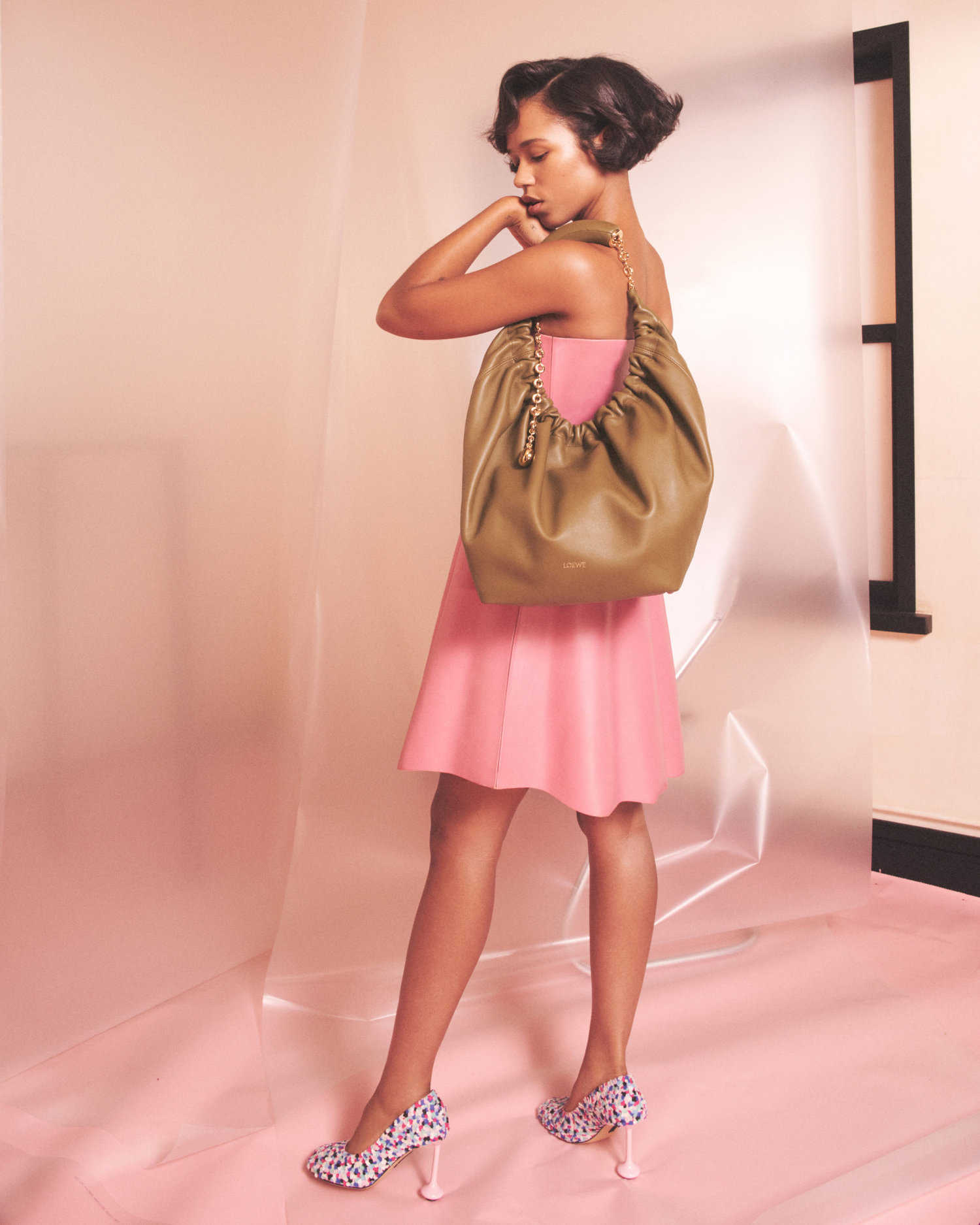The Loewe women’s campaign was unveiled today, with global brand ambassador Taylor Russell once again in the hot seat. The actress, director, and bona fide style star is joined by fellow actress Tang Wei, both photographed by David Sims. The slightly surreal edge of the imagery, intended to invoke the feeling of playing with Polly Pockets (were we ever so young!), lends itself well to the tongue-in-cheek and surely viral accessories, like the Toy and Bow pumps and the soon-to-come brush-adorned heels, playful foldable Puzzle tote, as well as ready to wear that tricks the eye thanks to fabric like square-lined bonded-nappa leather and fluid duchesse satin. Fashion dolls!