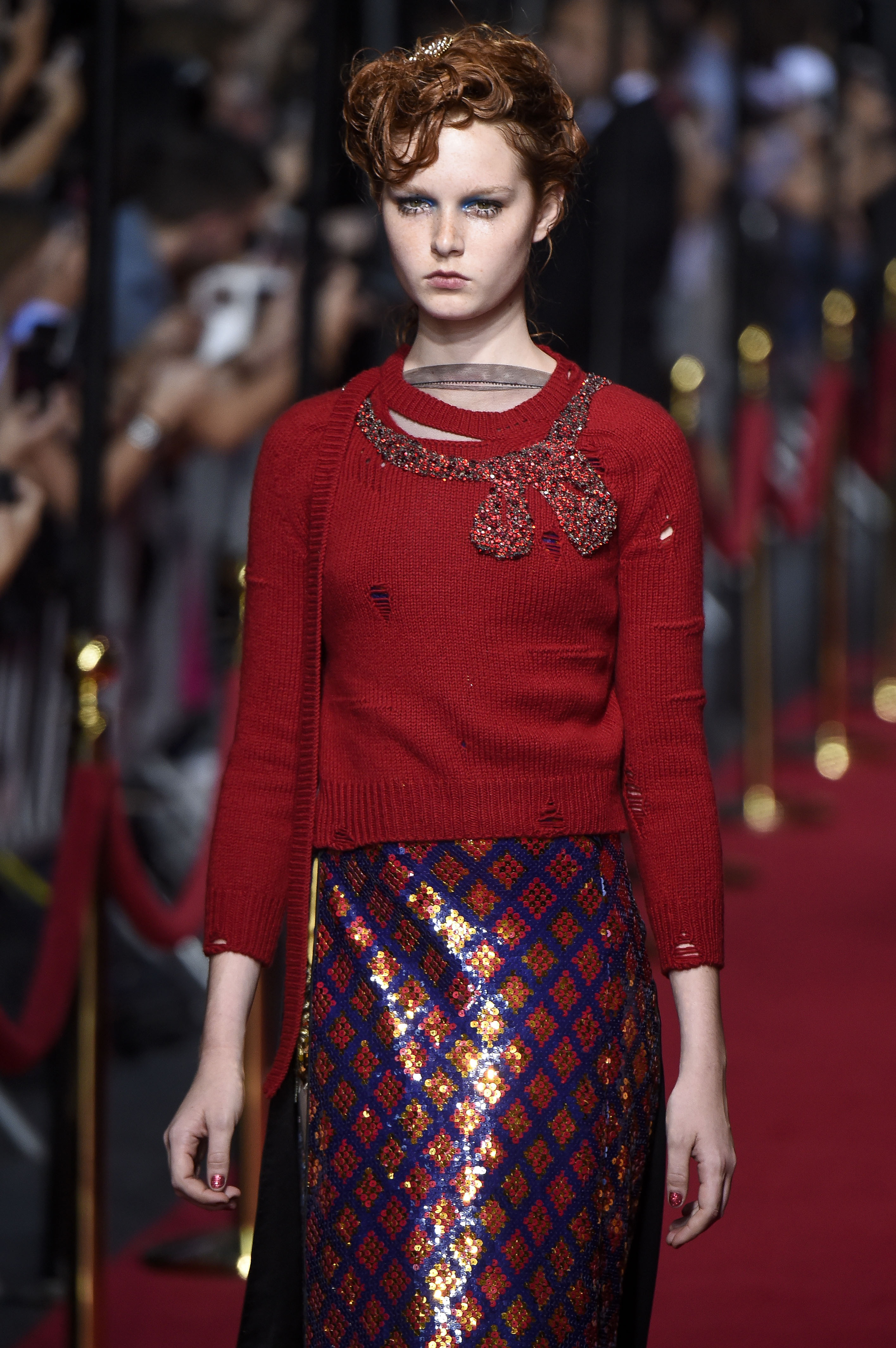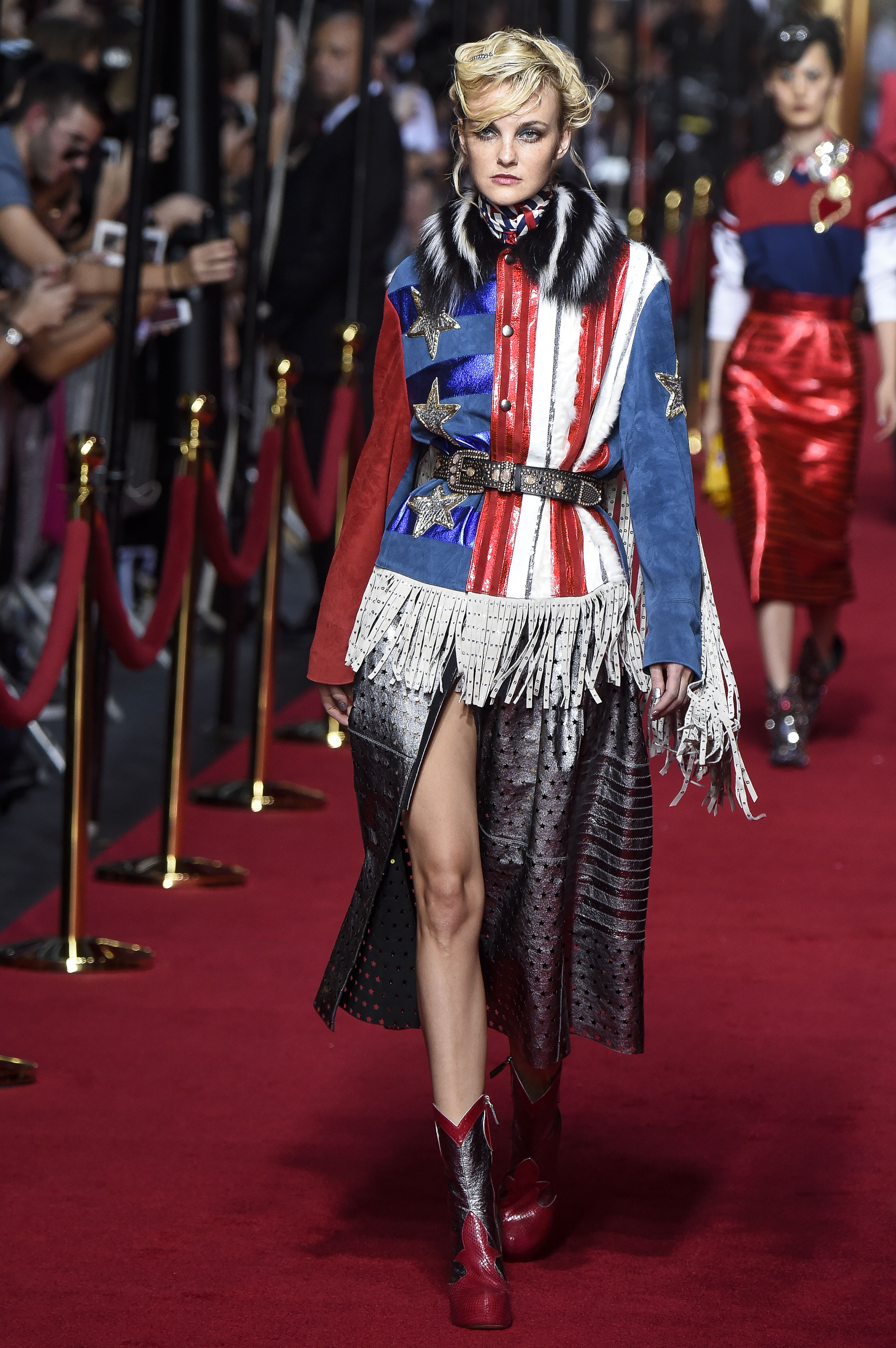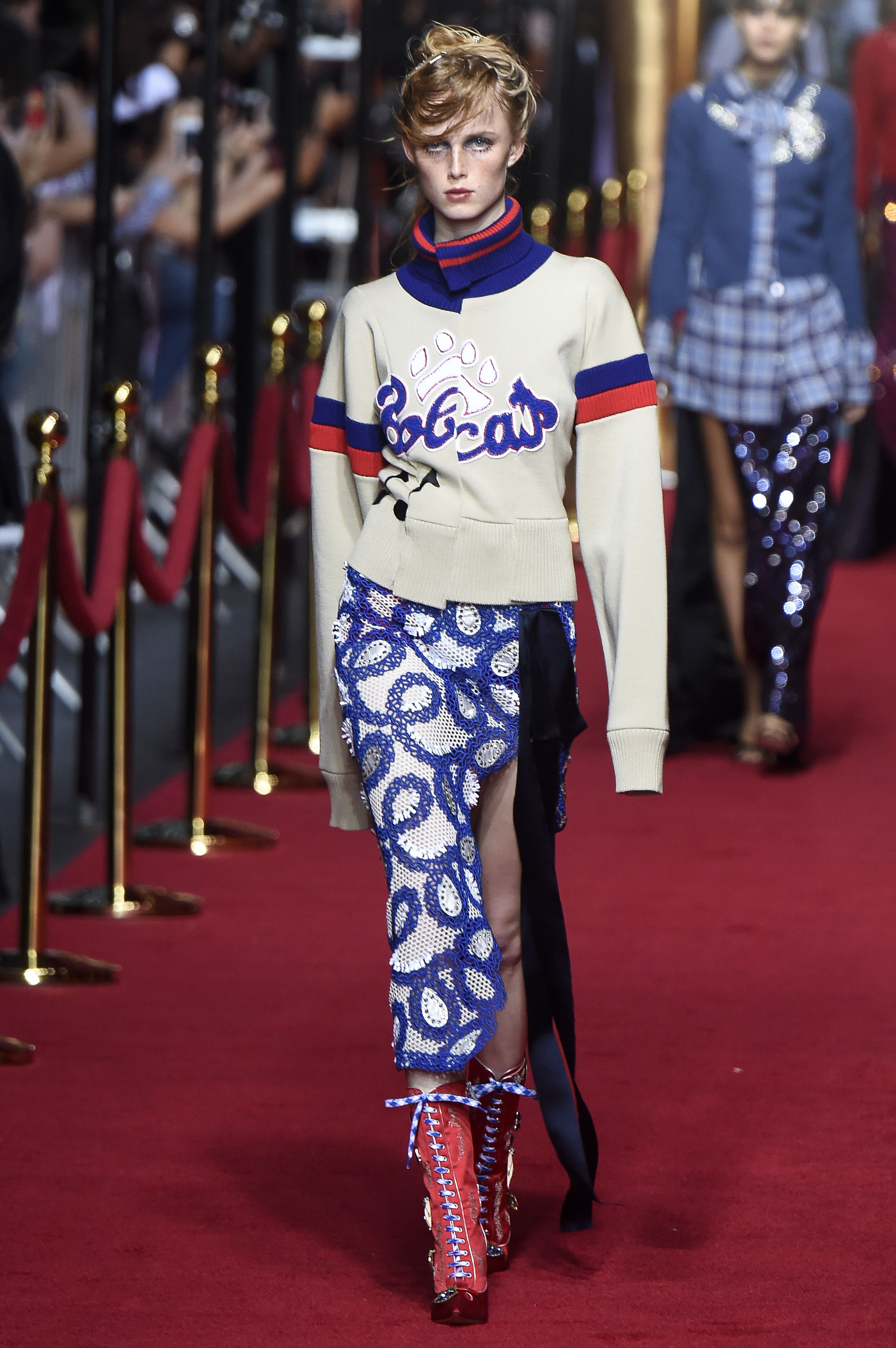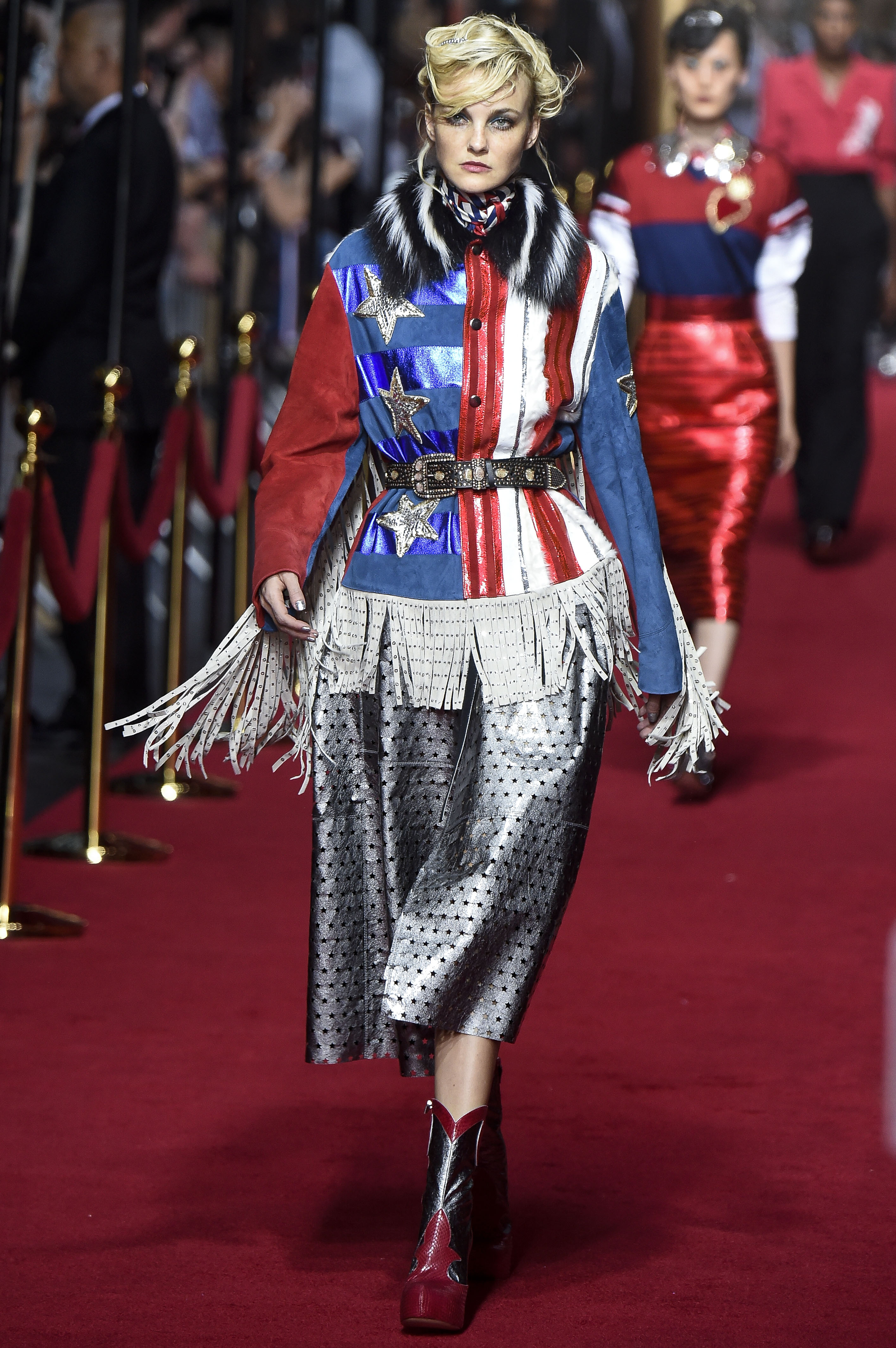 To say that Marc Jacobs marches to the beat of his own drum would be putting it mildly. An orchestra played in the background as an array of top models walked the runway (Plus! Beth Ditto) including Karen Elson, Bella Hadid, Alex Wek, Joan Smalls, Jamie Bochert, Anna Cleveland, Adriana Lima, Binx Walton, and the busiest model of the season, Lineisy Montero. There were no 90s-inspired looks on this runway, perhaps because that era is so inherently Marc’s. The show was all about faded American glam. Some of the models looked like washed up starlets from a bygone era. The Ziegfeld Theater is the longest surviving single-screen theater in America, thus fitting in with the evening’s theme. The building was built in 1969, but was based on the original which operated from 1927 to 1966. The looks included 40s style evening gowns, Americana themed pieces like a pair of jeans sewn to look like the American flag and high school letterman jackets, cowgirl fringe, sparkly pencil skirts, vintage inspired theater usher uniforms, and capes and skirts featuring Janet Leigh’s screaming visage. It was quite a spectacle, the likes of which the Ziegfeld Theater probably hasn’t seen in quite some time and it looked unlike anything else on the runways this season.
