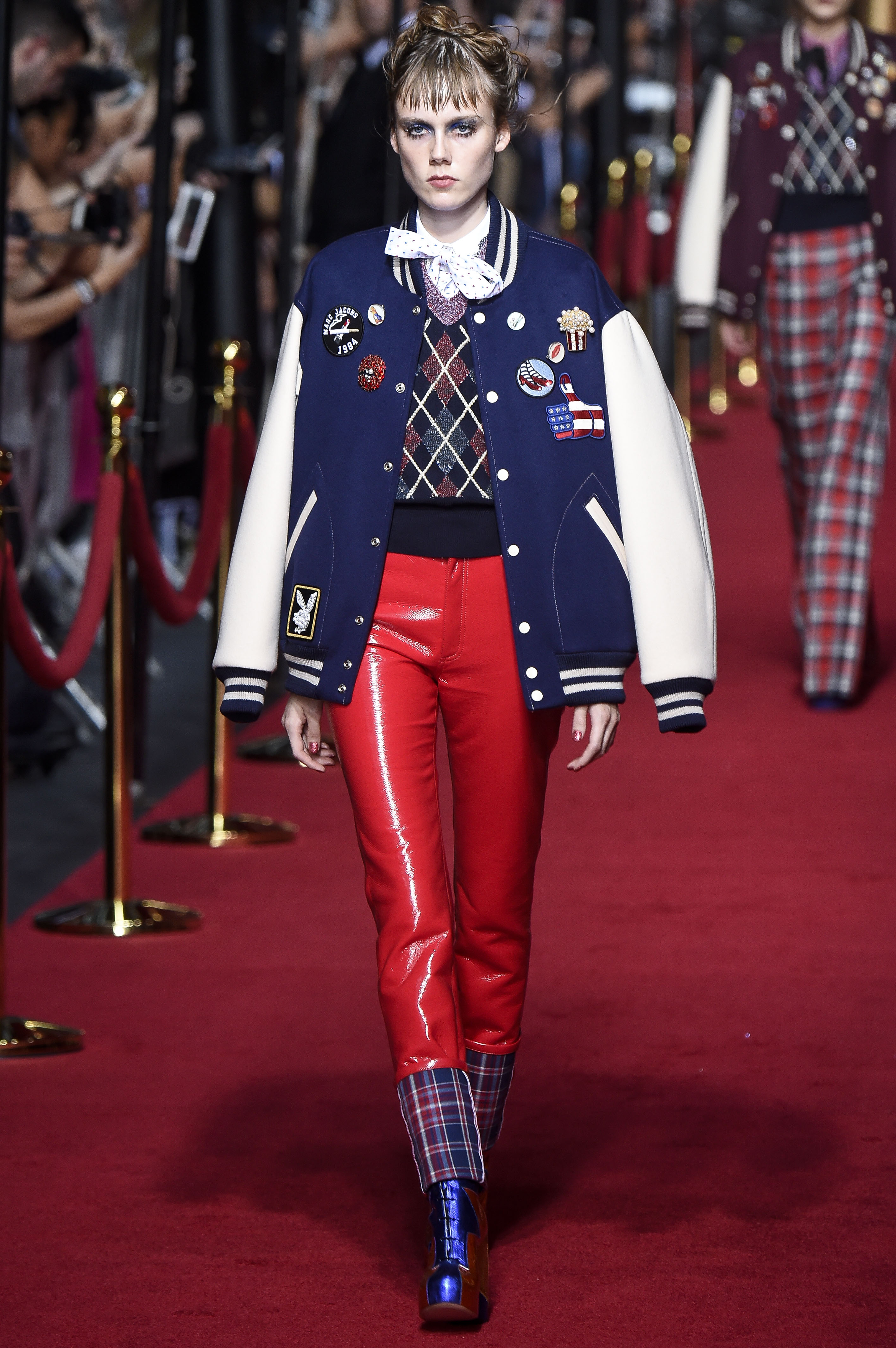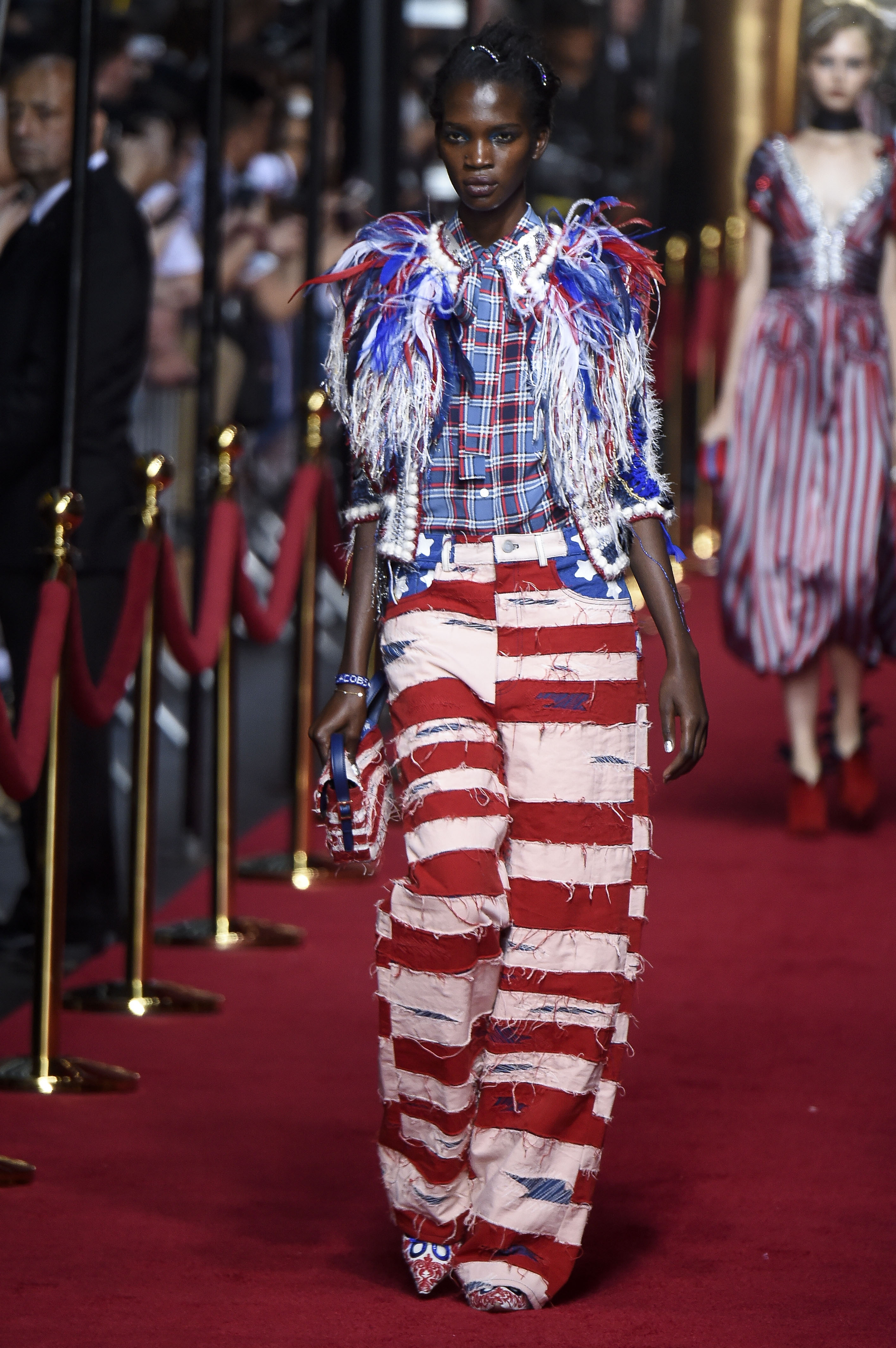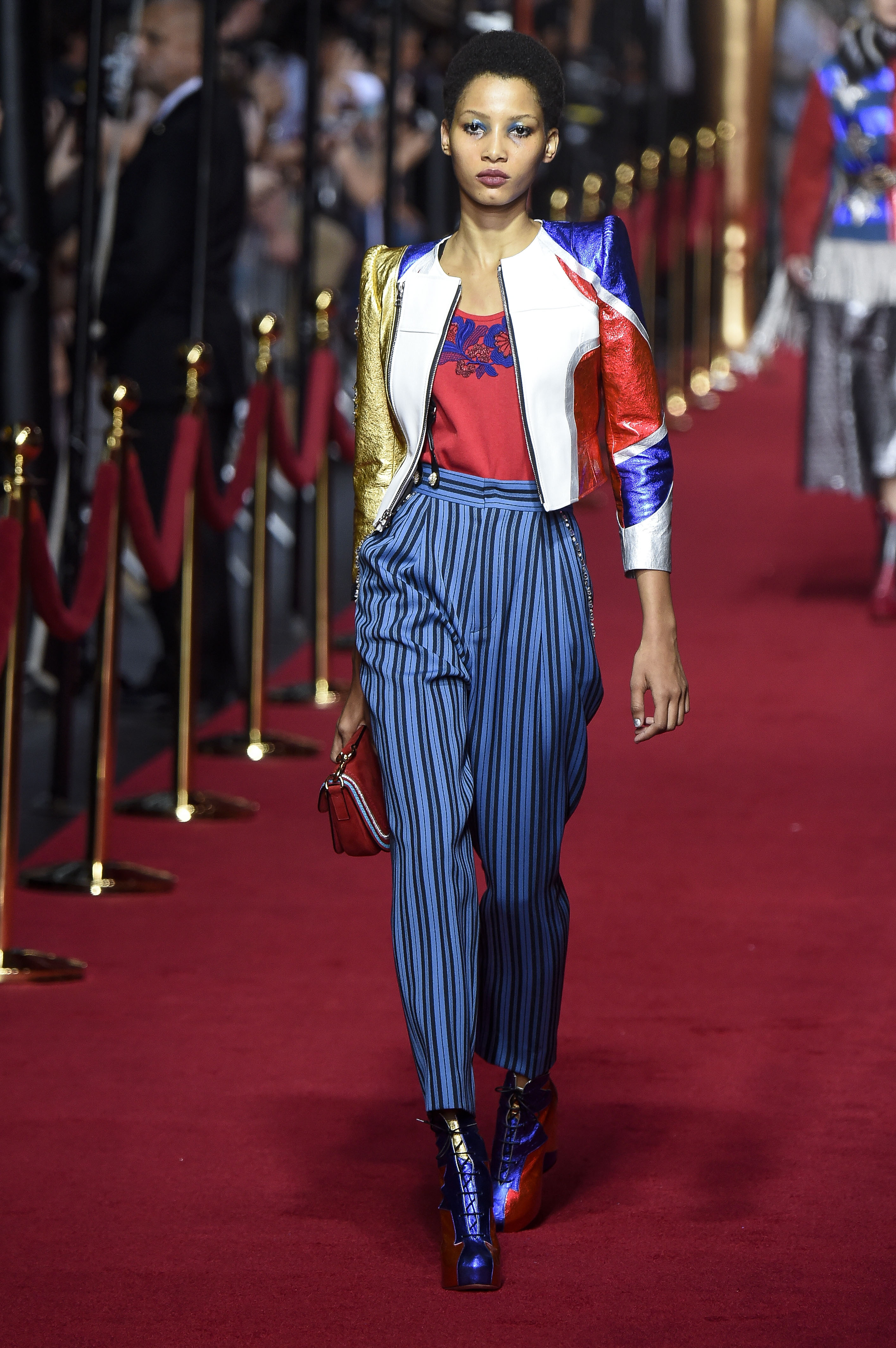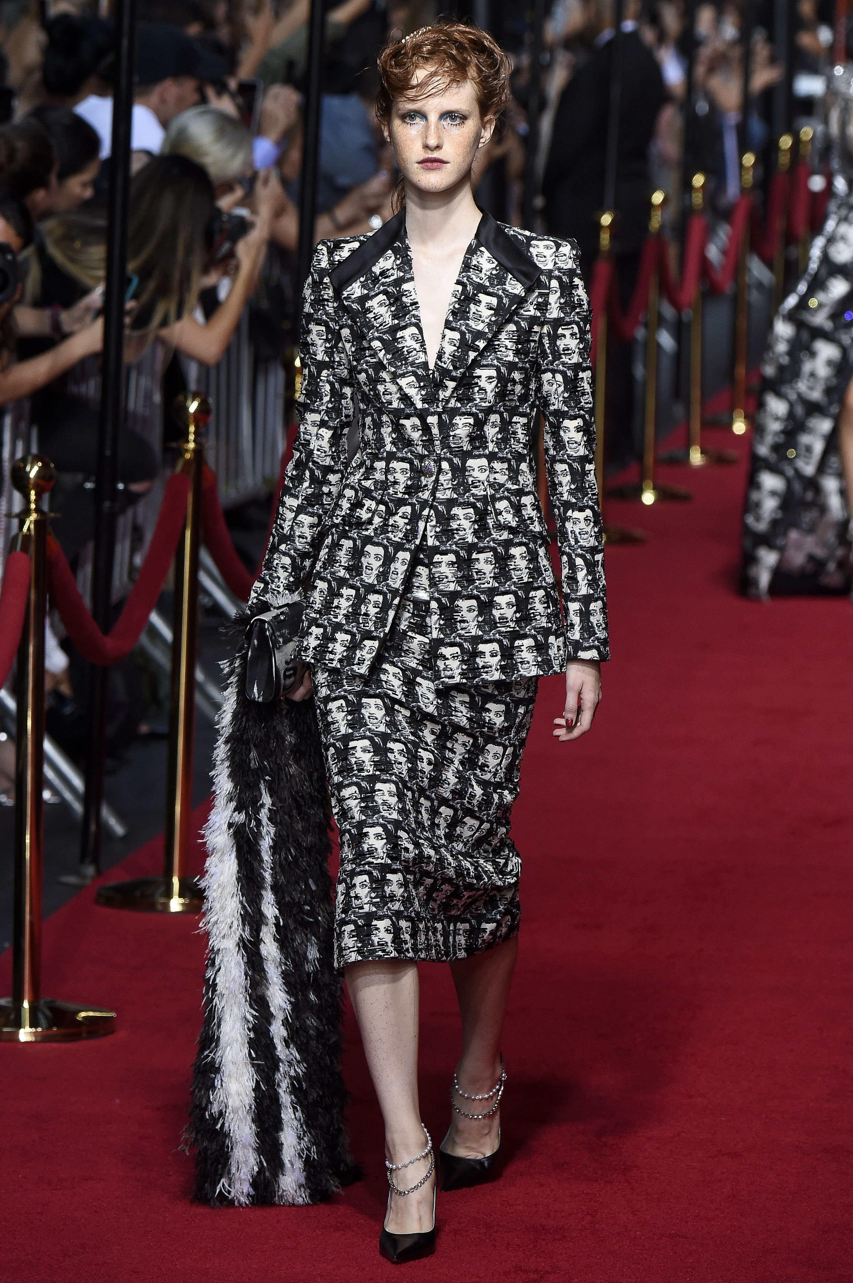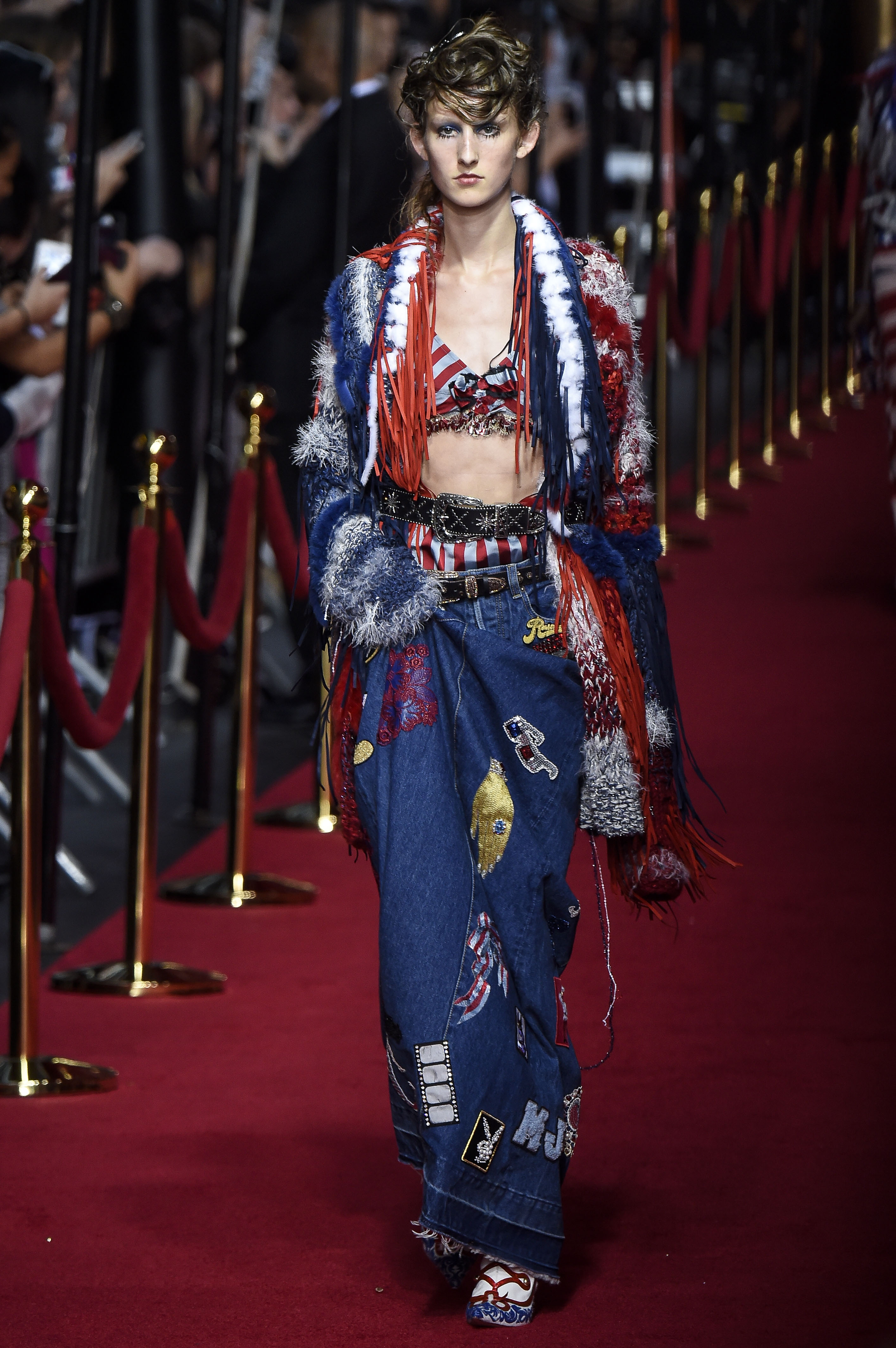 To say that Marc Jacobs marches to the beat of his own drum would be putting it mildly. An orchestra played in the background as an array of top models walked the runway (Plus! Beth Ditto) including Karen Elson, Bella Hadid, Alex Wek, Joan Smalls, Jamie Bochert, Anna Cleveland, Adriana Lima, Binx Walton, and the busiest model of the season, Lineisy Montero. There were no 90s-inspired looks on this runway, perhaps because that era is so inherently Marc’s. The show was all about faded American glam. Some of the models looked like washed up starlets from a bygone era. The Ziegfeld Theater is the longest surviving single-screen theater in America, thus fitting in with the evening’s theme. The building was built in 1969, but was based on the original which operated from 1927 to 1966. The looks included 40s style evening gowns, Americana themed pieces like a pair of jeans sewn to look like the American flag and high school letterman jackets, cowgirl fringe, sparkly pencil skirts, vintage inspired theater usher uniforms, and capes and skirts featuring Janet Leigh’s screaming visage. It was quite a spectacle, the likes of which the Ziegfeld Theater probably hasn’t seen in quite some time and it looked unlike anything else on the runways this season.