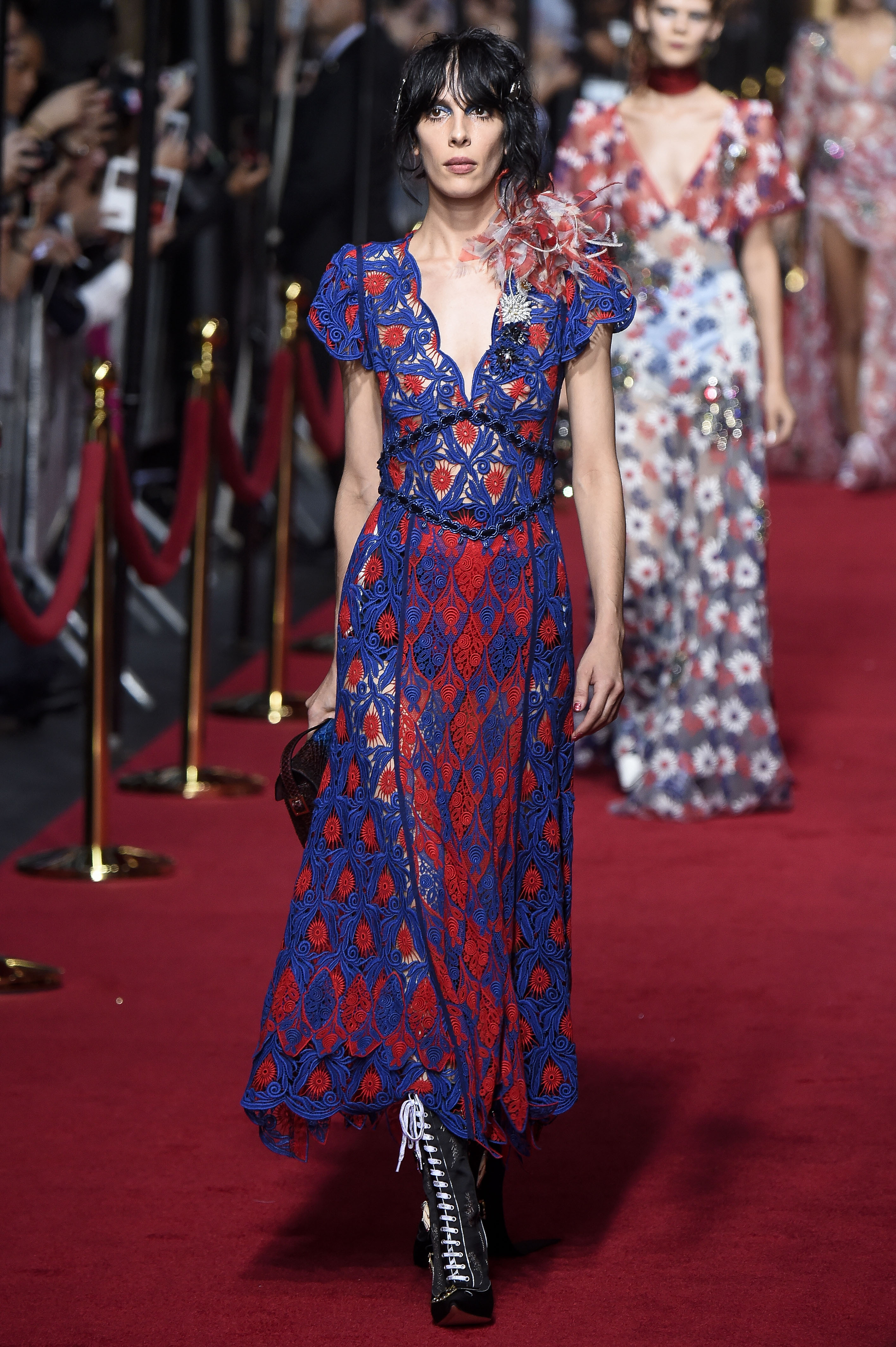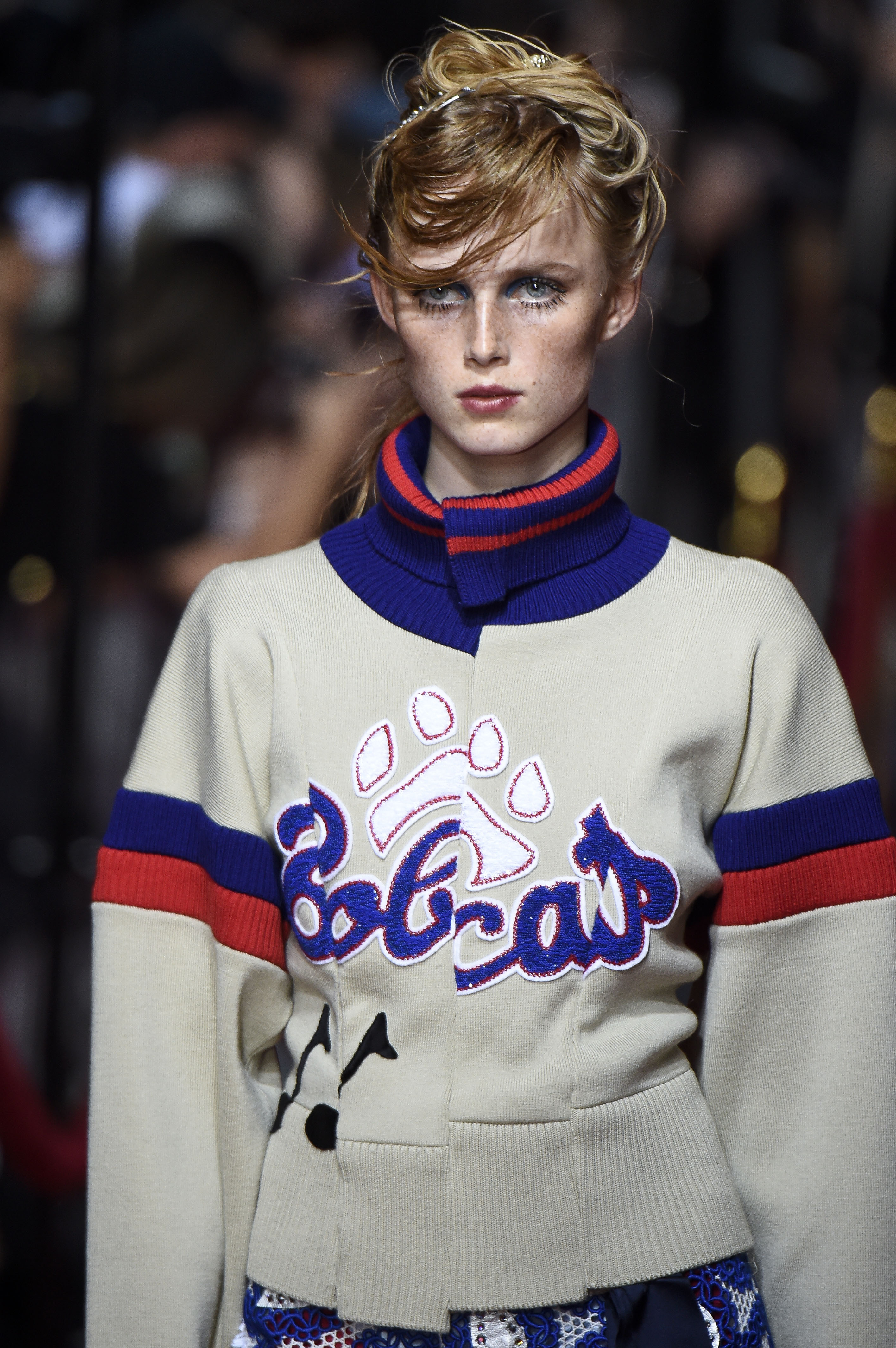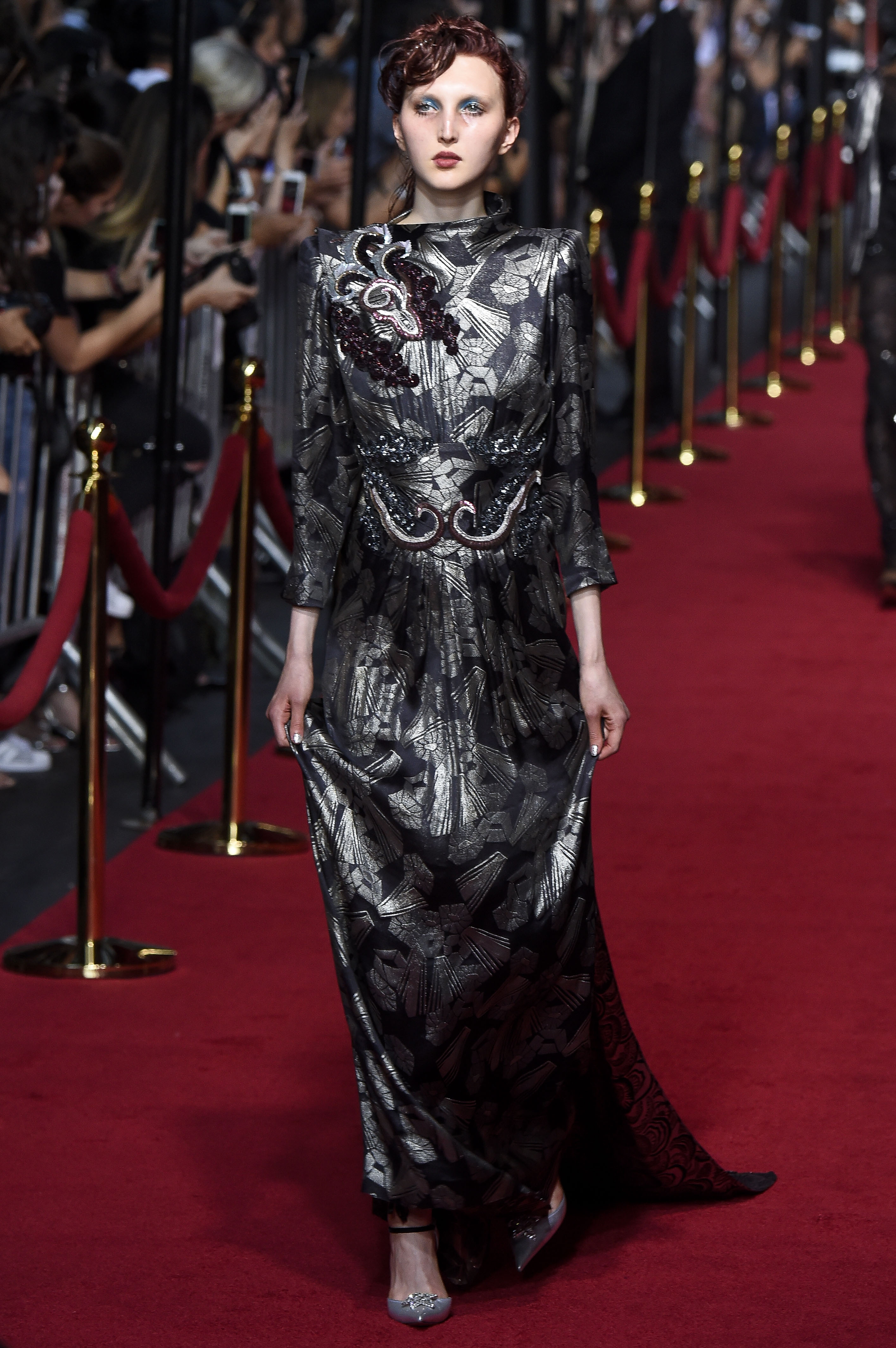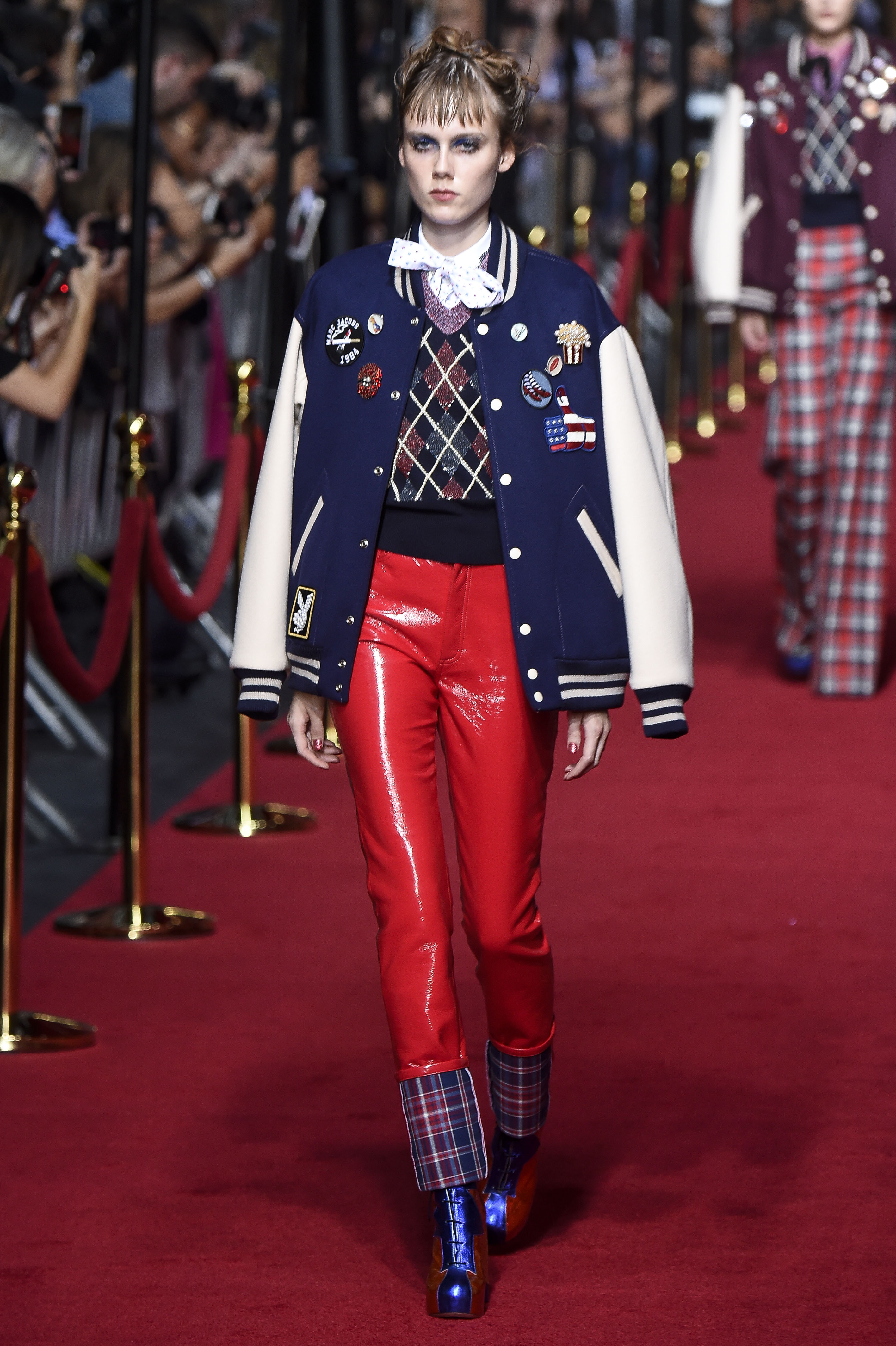 To say that Marc Jacobs marches to the beat of his own drum would be putting it mildly. An orchestra played in the background as an array of top models walked the runway (Plus! Beth Ditto) including Karen Elson, Bella Hadid, Alex Wek, Joan Smalls, Jamie Bochert, Anna Cleveland, Adriana Lima, Binx Walton, and the busiest model of the season, Lineisy Montero. There were no 90s-inspired looks on this runway, perhaps because that era is so inherently Marc’s. The show was all about faded American glam. Some of the models looked like washed up starlets from a bygone era. The Ziegfeld Theater is the longest surviving single-screen theater in America, thus fitting in with the evening’s theme. The building was built in 1969, but was based on the original which operated from 1927 to 1966. The looks included 40s style evening gowns, Americana themed pieces like a pair of jeans sewn to look like the American flag and high school letterman jackets, cowgirl fringe, sparkly pencil skirts, vintage inspired theater usher uniforms, and capes and skirts featuring Janet Leigh’s screaming visage. It was quite a spectacle, the likes of which the Ziegfeld Theater probably hasn’t seen in quite some time and it looked unlike anything else on the runways this season.