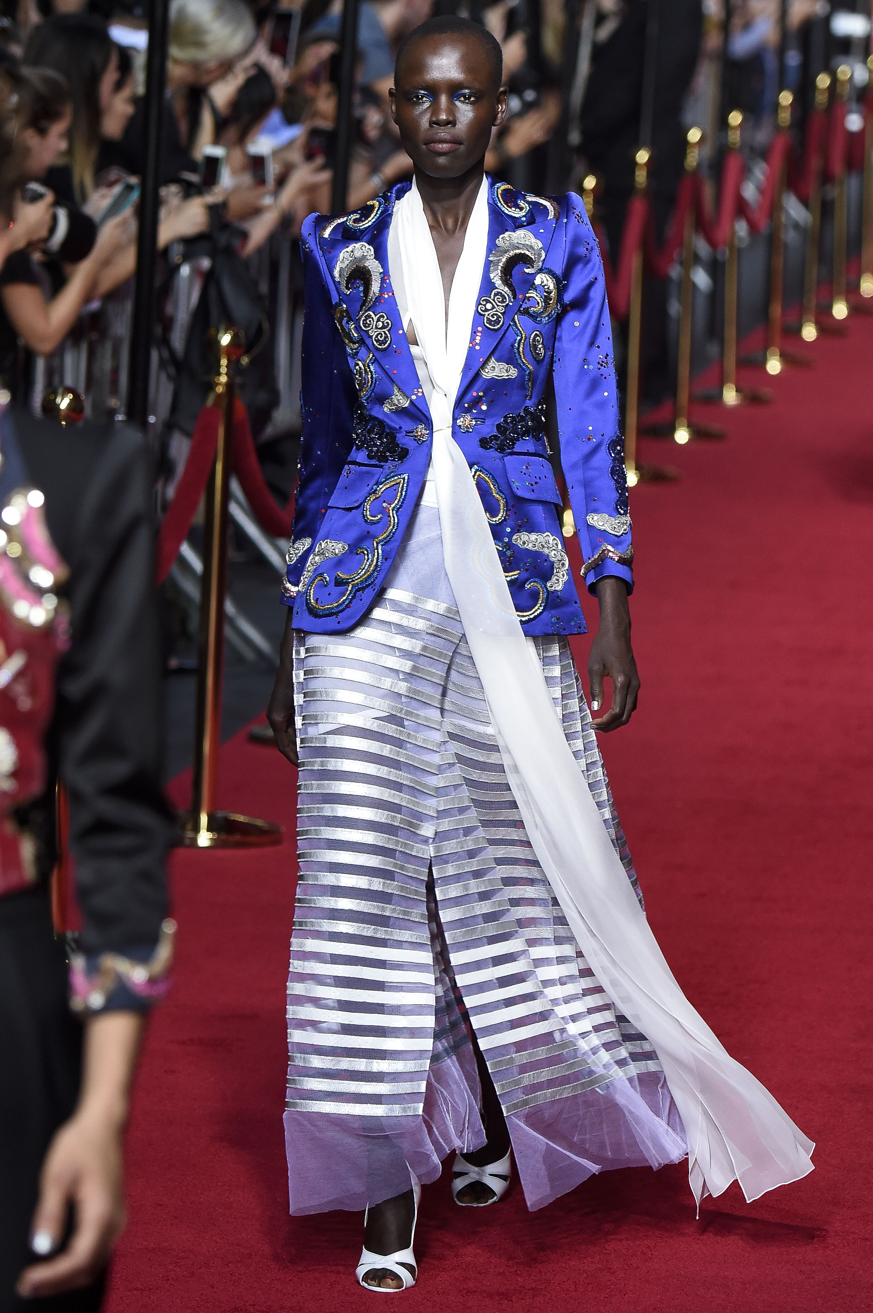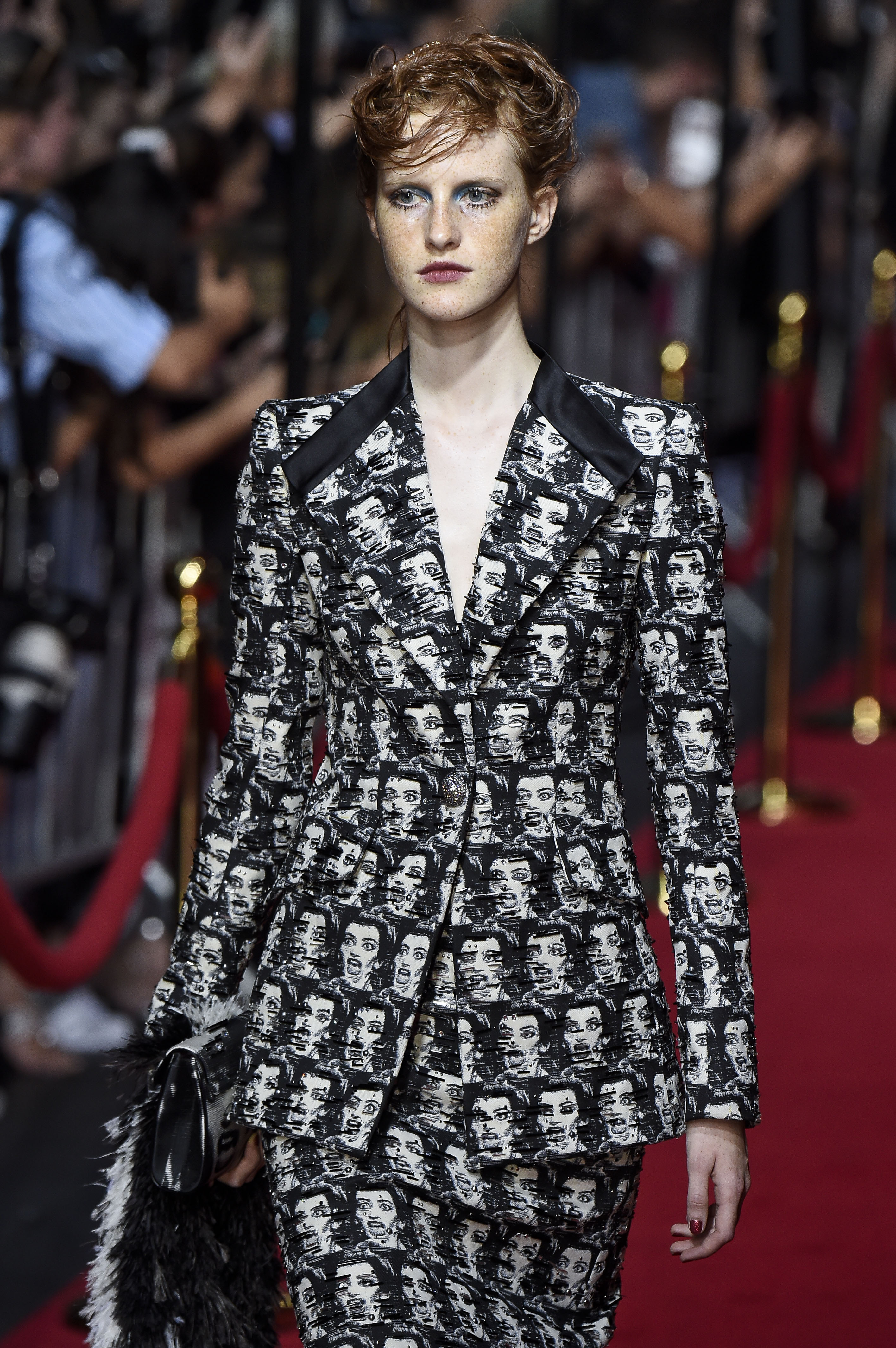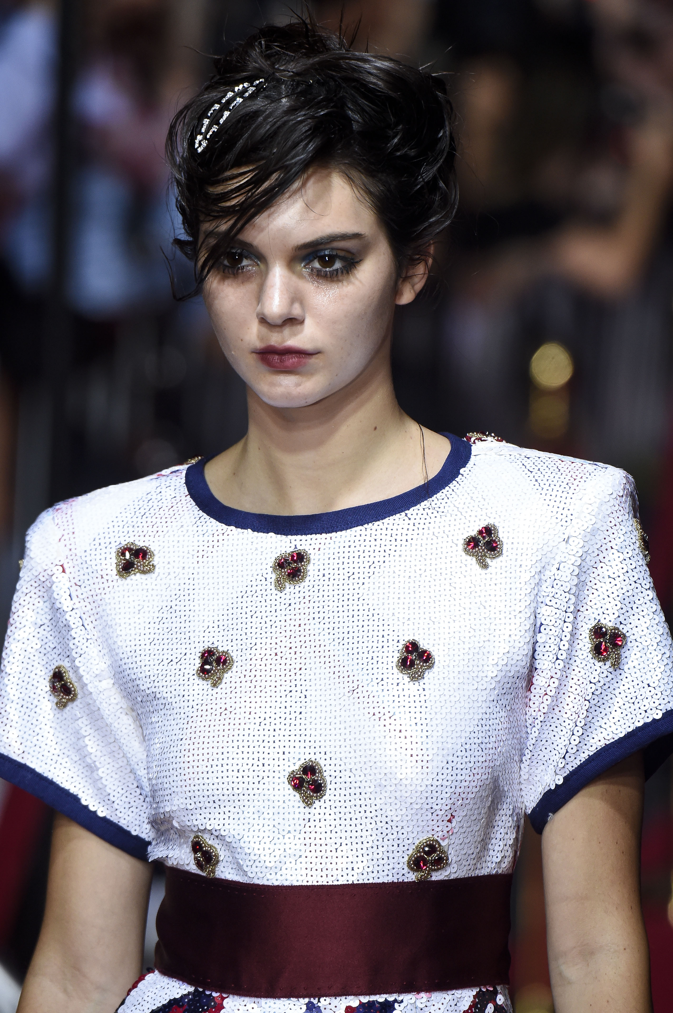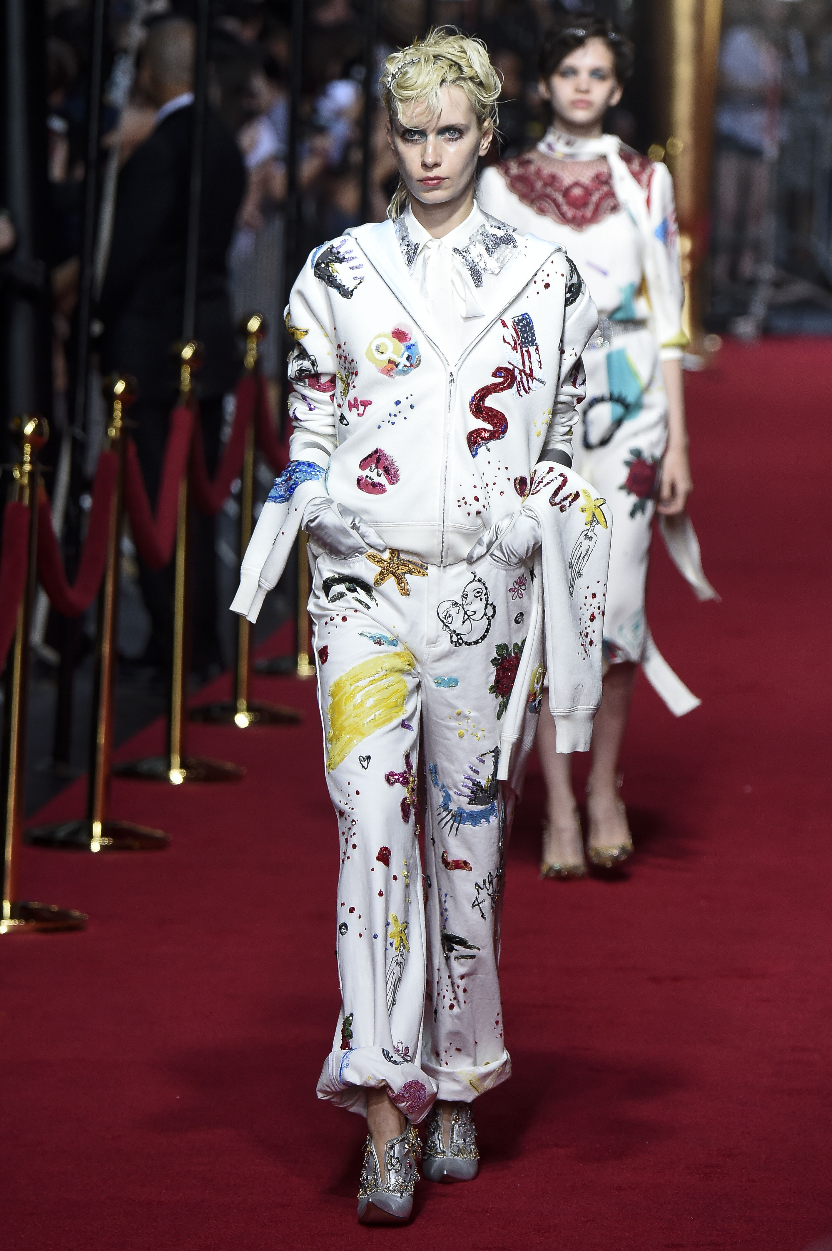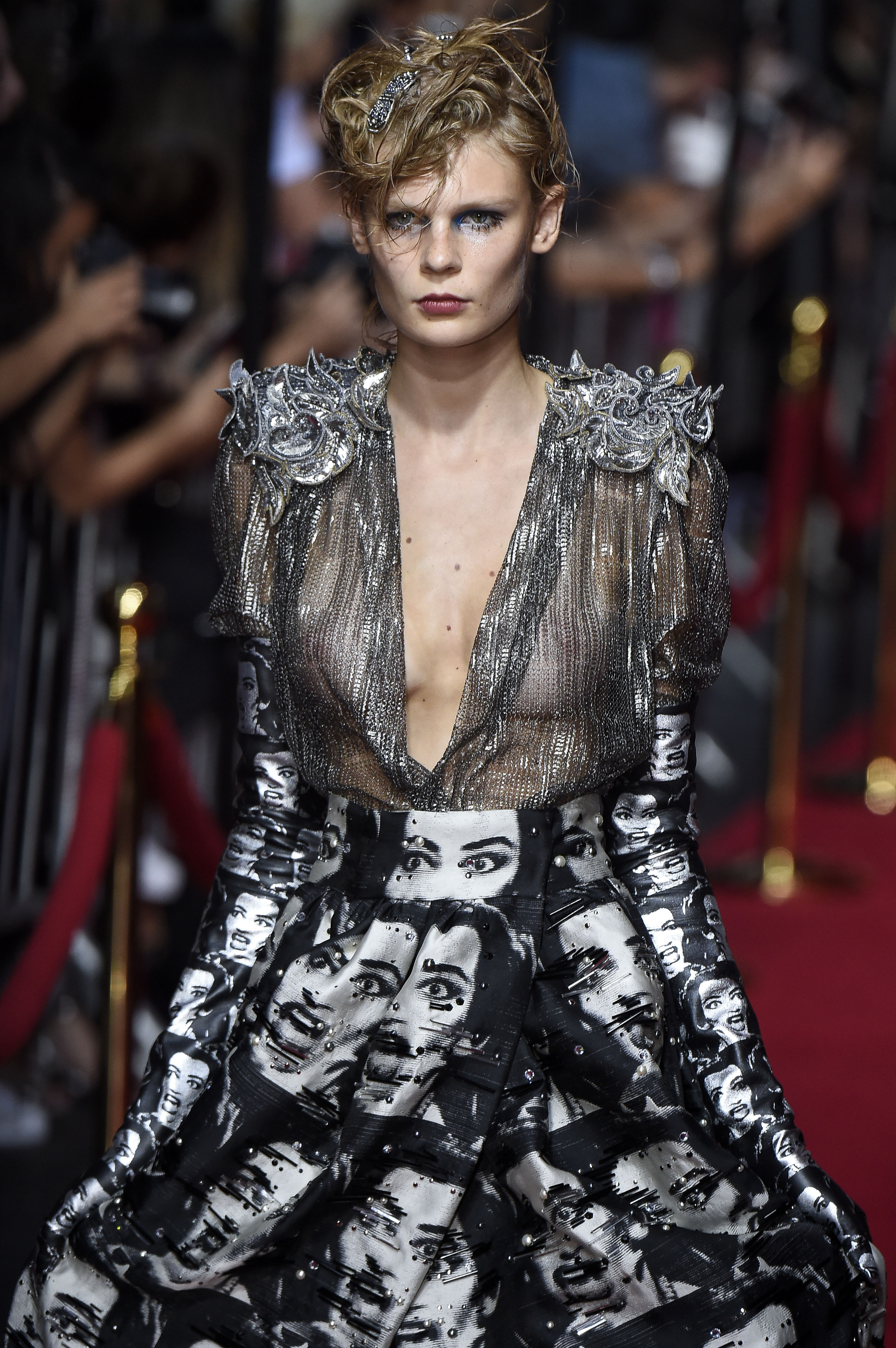 To say that Marc Jacobs marches to the beat of his own drum would be putting it mildly. An orchestra played in the background as an array of top models walked the runway (Plus! Beth Ditto) including Karen Elson, Bella Hadid, Alex Wek, Joan Smalls, Jamie Bochert, Anna Cleveland, Adriana Lima, Binx Walton, and the busiest model of the season, Lineisy Montero. There were no 90s-inspired looks on this runway, perhaps because that era is so inherently Marc’s. The show was all about faded American glam. Some of the models looked like washed up starlets from a bygone era. The Ziegfeld Theater is the longest surviving single-screen theater in America, thus fitting in with the evening’s theme. The building was built in 1969, but was based on the original which operated from 1927 to 1966. The looks included 40s style evening gowns, Americana themed pieces like a pair of jeans sewn to look like the American flag and high school letterman jackets, cowgirl fringe, sparkly pencil skirts, vintage inspired theater usher uniforms, and capes and skirts featuring Janet Leigh’s screaming visage. It was quite a spectacle, the likes of which the Ziegfeld Theater probably hasn’t seen in quite some time and it looked unlike anything else on the runways this season.