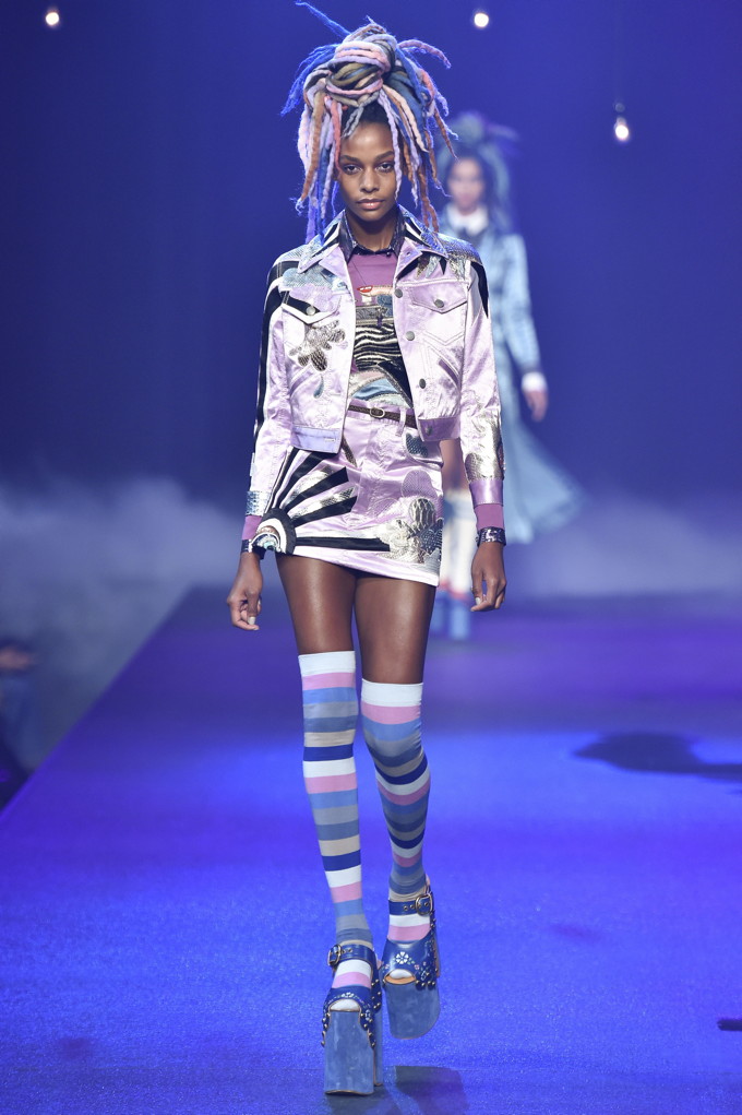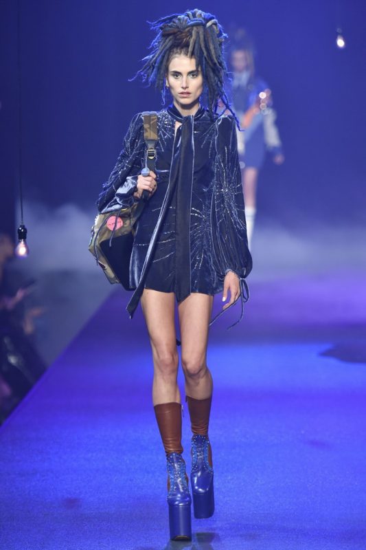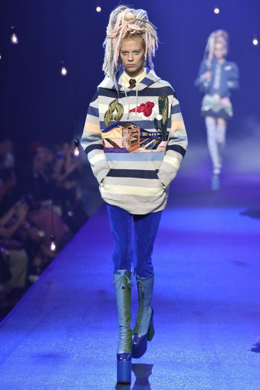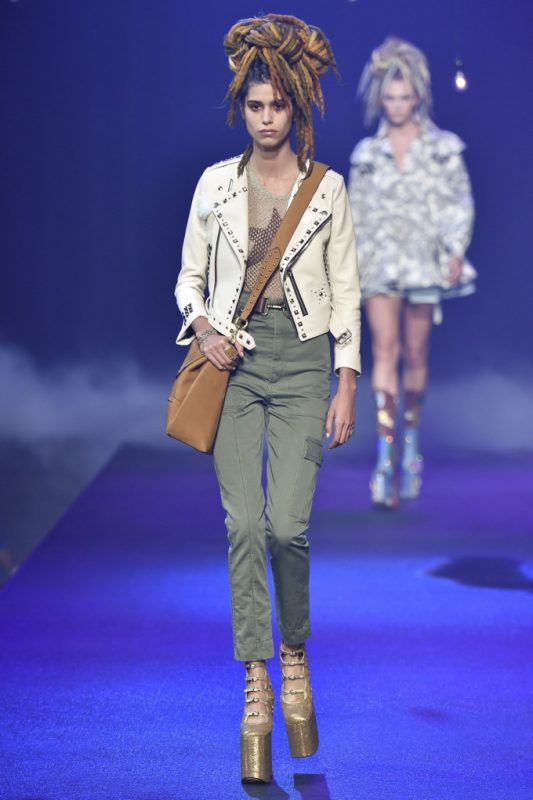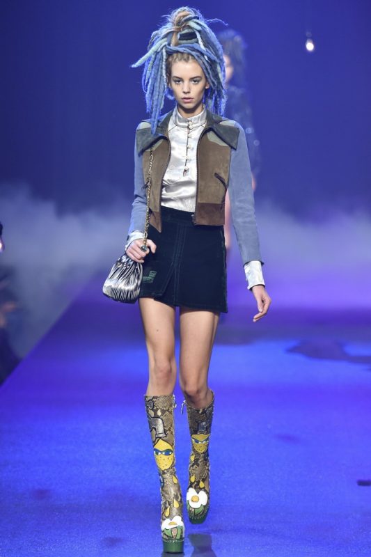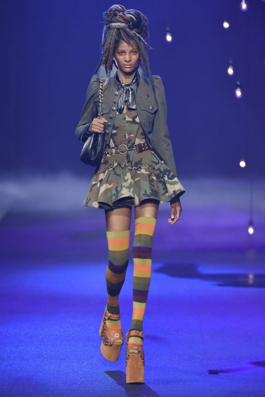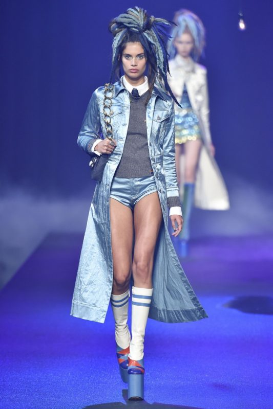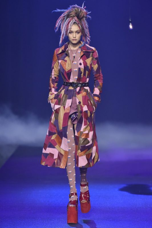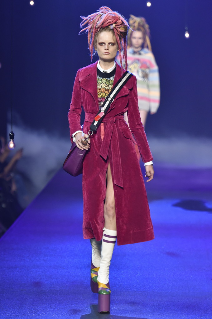 Holy hair! Guido Palau was working hard this season on the ‘dos for Marc Jacobs. Models sported piles of candy colored dreads in knotted masses on their crowns all the while marching on top of what looked like 8-inch platforms. Burning Man chic meets Tank Girl? If Lori Petty was remaking the ’90s cult-classic she might tap into Jacobs’ Spring 2017 collection. References ranged from steam punk Victoriana to David Bowie Ziggy Stardust-inspired outfits to Venice Beach stoners to rock n’ roll. Leave it to Marc Jacobs to close out New York Fashion Week marching to the beat of his own drum. The editorial possibilities for these pieces are endless.