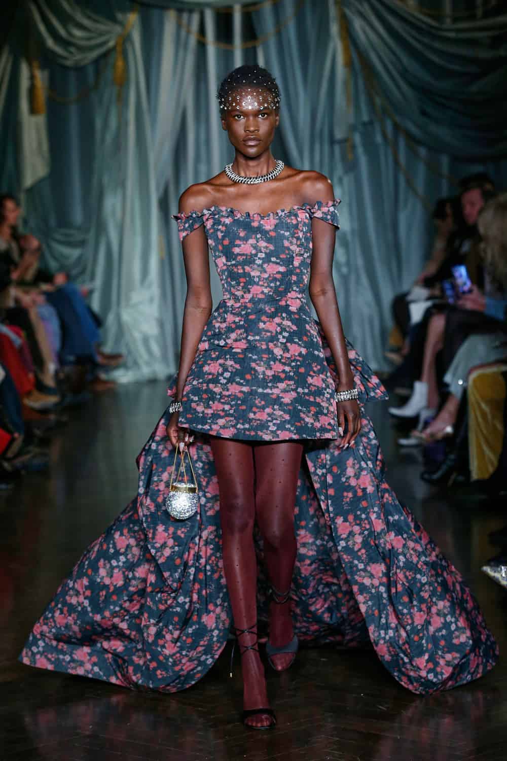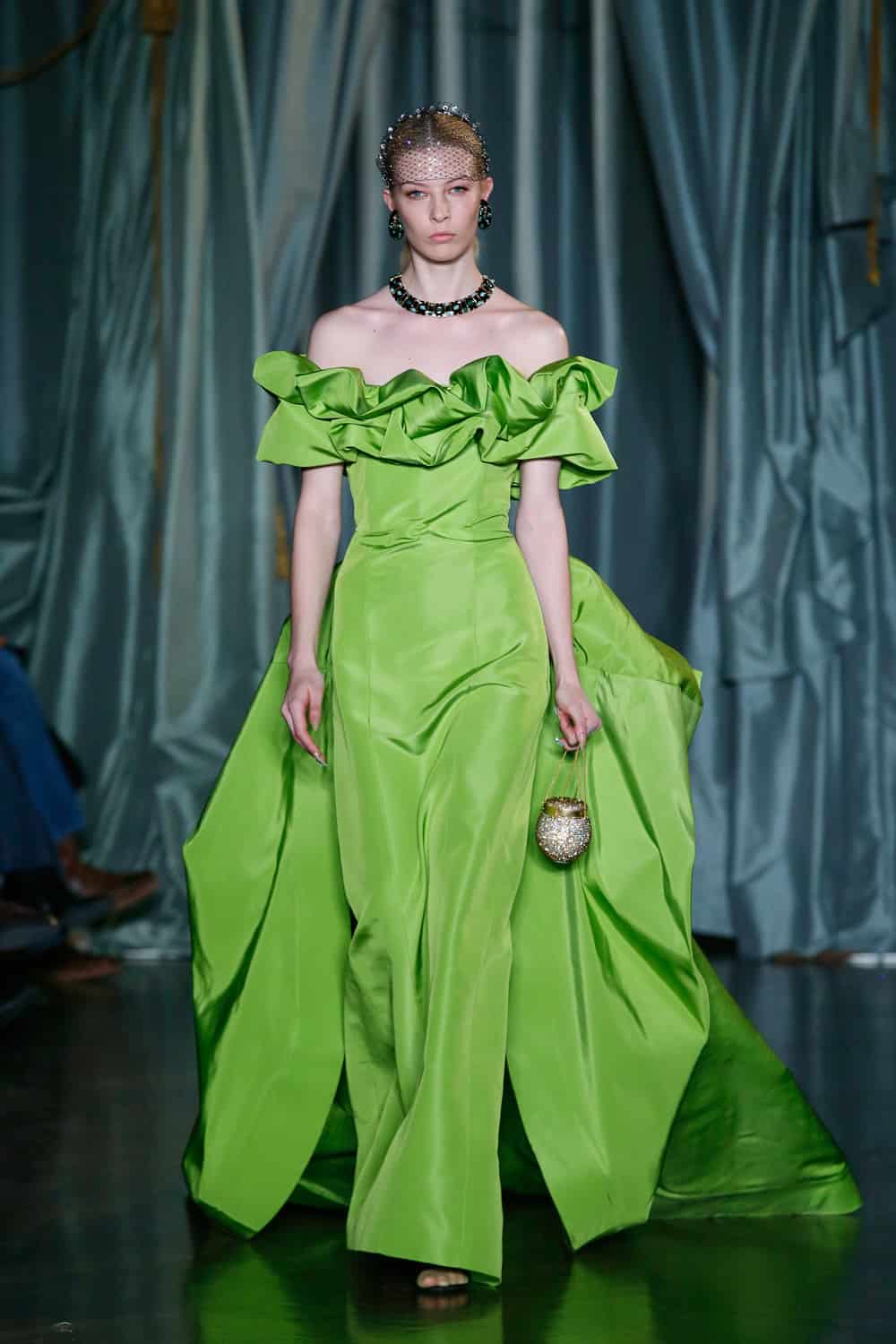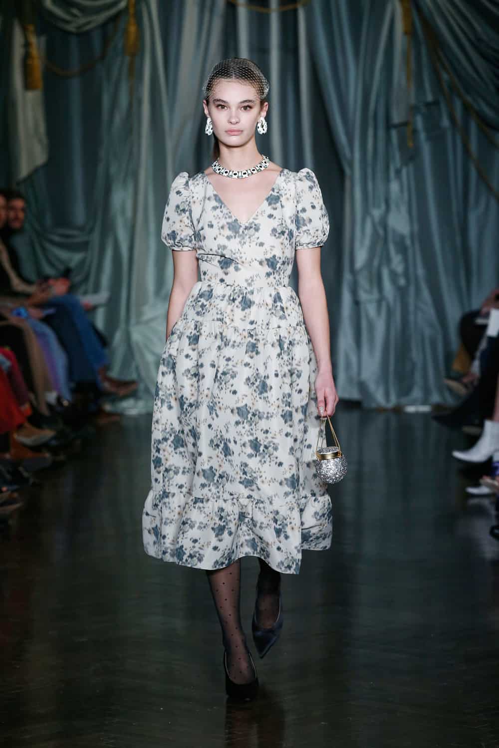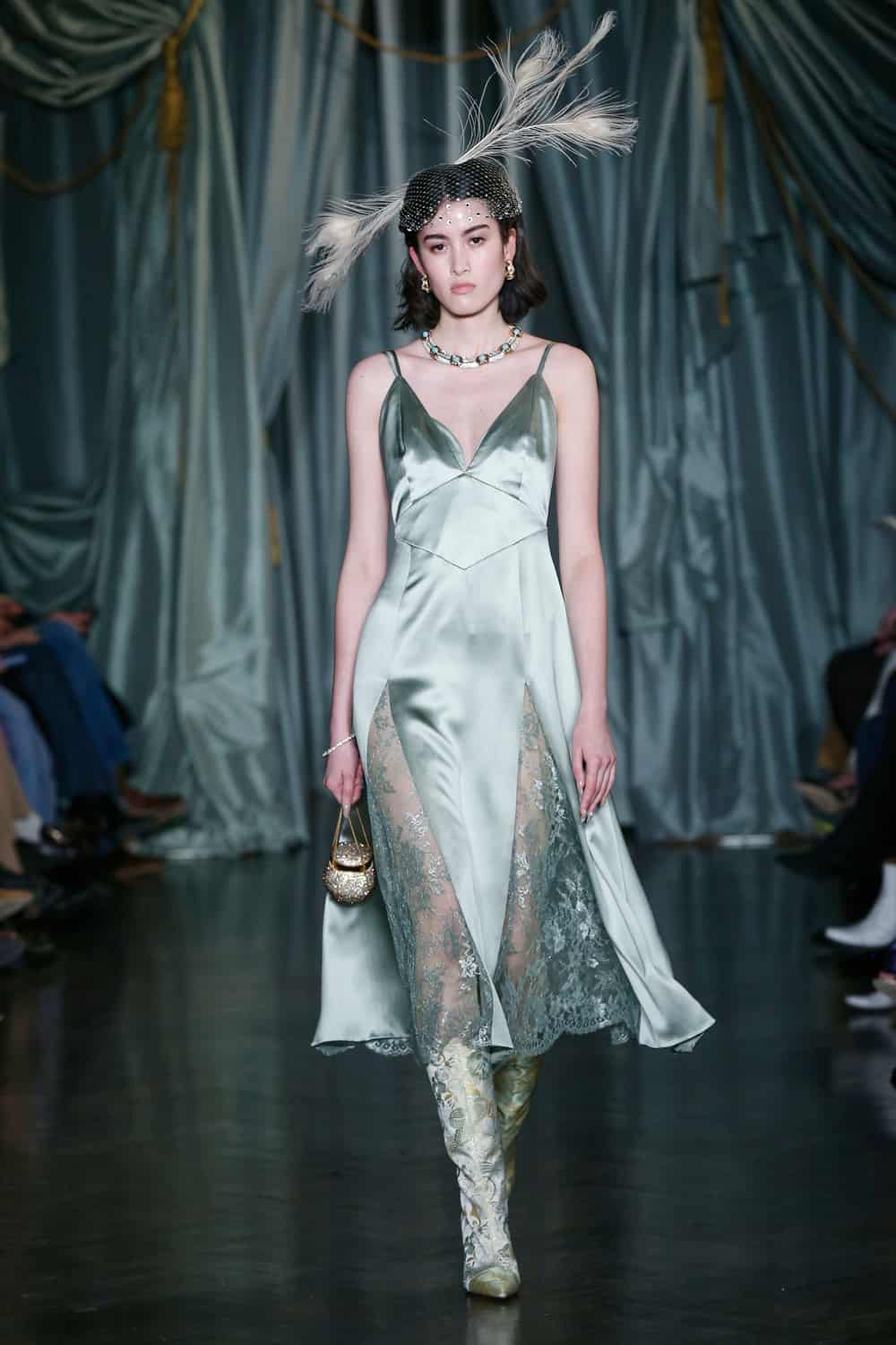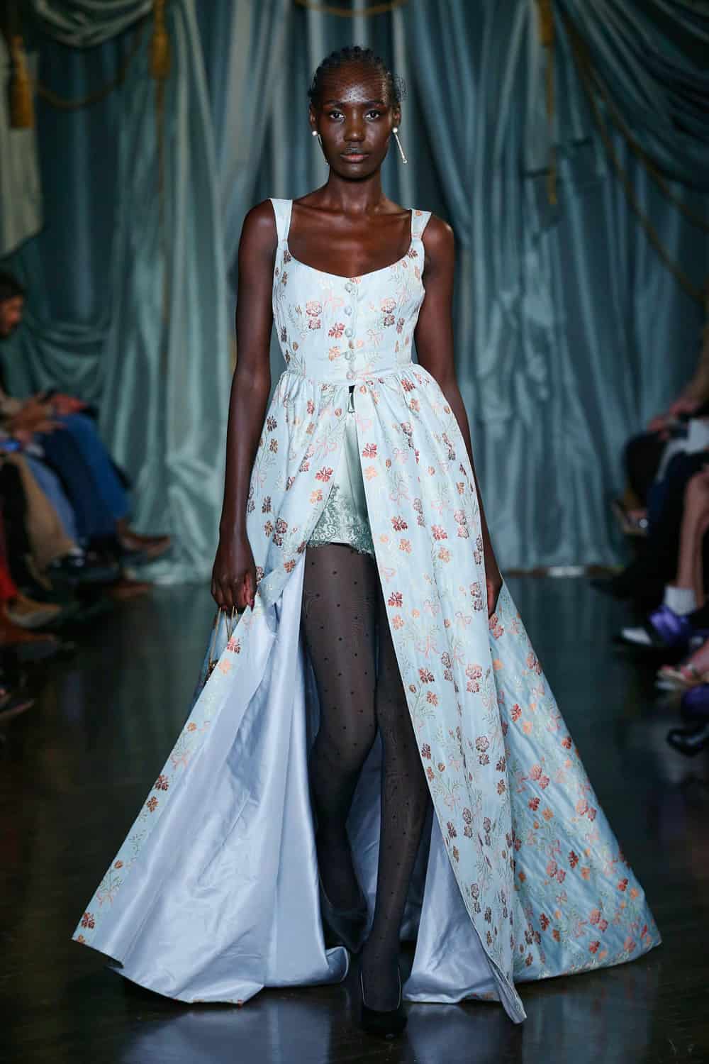 Each outfit was teamed with eye-catching accessories, such as Swarovski crystal-covered minaudiéres and clutches which bounced down the catwalk, plus custom belts with floral engraved metal buckles, snakeskin textures, and metal studs. The aforementioned shoe line, Maria Luca x Markarian, put forward lace-up sandals, slingbacks, ballerinas, and booties in floral brocade, satin, and suede. According to the designer, she was introduced to Maria Luca’s founder Carlotta De Luca by a mutual friend and they immediately hit it off thanks to their shared reference points and how they each find forever inspiration in their grandmothers. O’Neill also partnered with fellow NYC-based Gigi Burris Millinery on the eye-catching embellished and feathered headwear (a surefire way to make a memorable entrance!) and with Ciner jewelry on the enamel, beaded, and tasseled jewelry assortment.