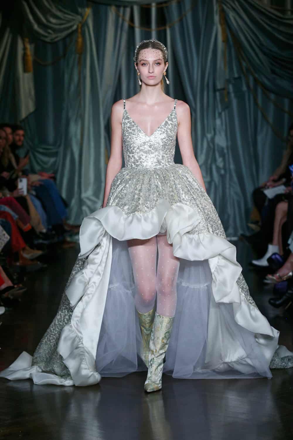 The 39-piece collection was elevated by Andrew Mukamal’s styling, who presented new takes on how to take your Markarian frock or evening coat out on the town. Pair your ball gown with boots! A bandana-style triangle top with your finest sequin trousers! Ladylike polka-dot tights with your shortest short shorts! The preferred fabrics of the brand, which creates its garments locally, were all evident throughout: wools, burnout silk velvets, paillettes, brocade, and plissé lamé.