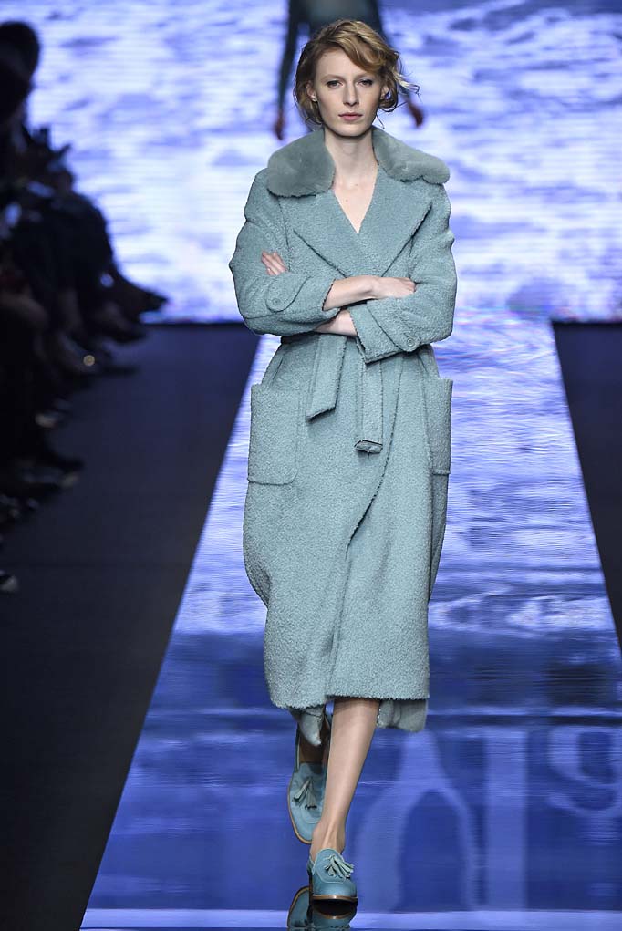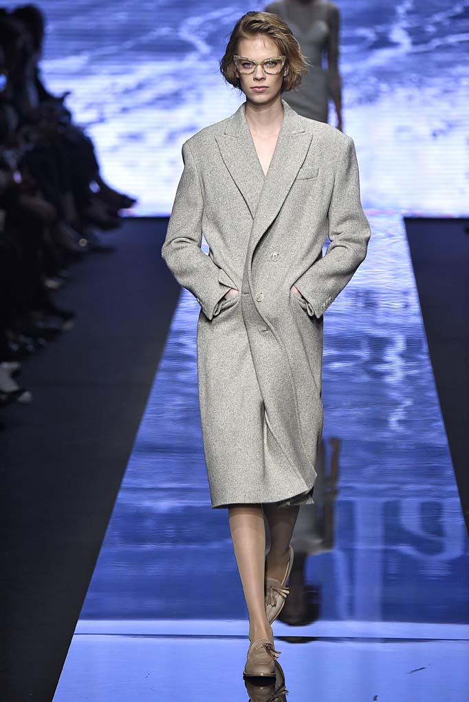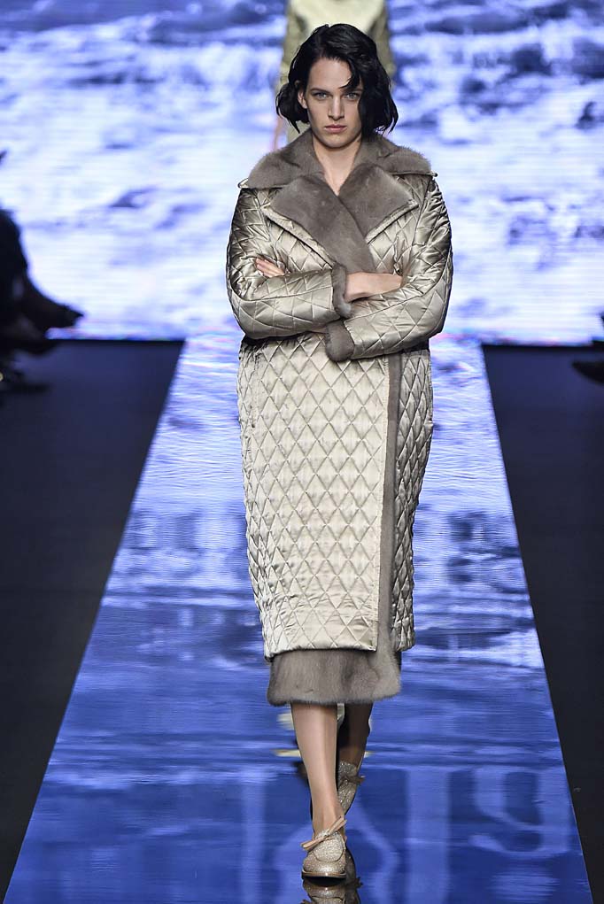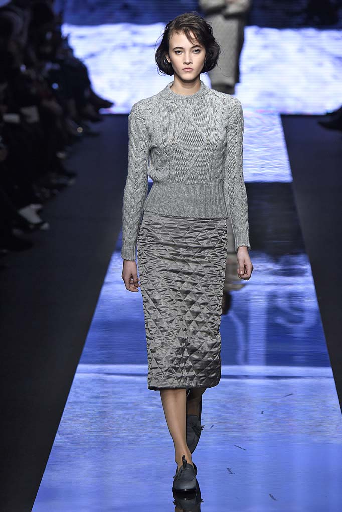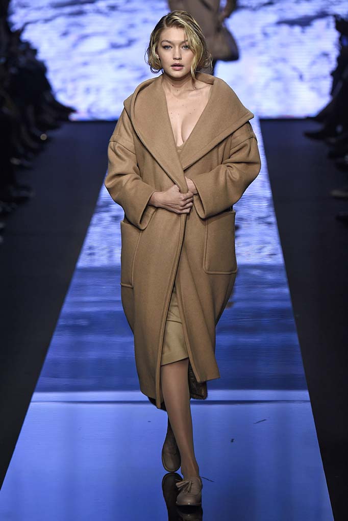 Marilyn Monroe was a chic point of reference for Max Mara this season. Specifically, the image of the buxom blonde icon lolling about on the beach in a chunky sweater, shot by George Barris in 1962, was the inspiration for Fall. That aesthetic was lifted directly from her look and adapted for the runway were messy bedhead locks, cat eye glasses, and silhouettes that emphasized the feminine shape. Gigi Hadid made three catwalk appearances here: opening the show in one of the house’s signature camel coats, donning a grey skirt and sweater combo towards the show’s middle, and finishing it all off in a yellow version of her first look. The rest of the collection featured plenty of perfectly executed outerwear, from a bomber jacket in camel wool to a satin quilted number with even more fur details. A slew of pencil skirts and proper sweaters kept the tone feeling ladylike with a vintage touch. Charming, non?