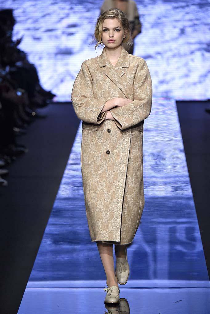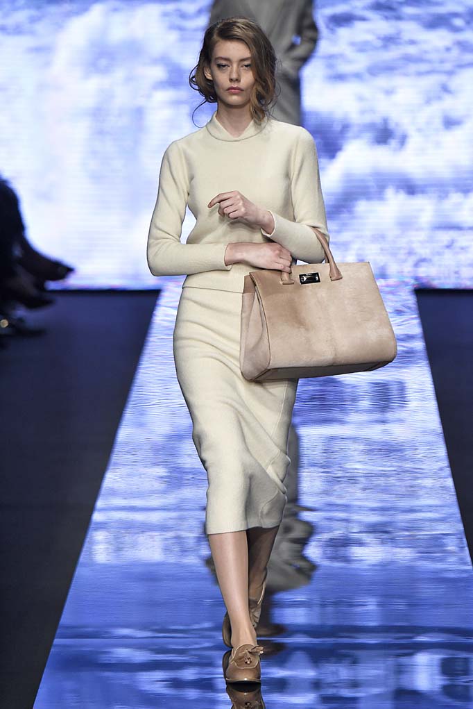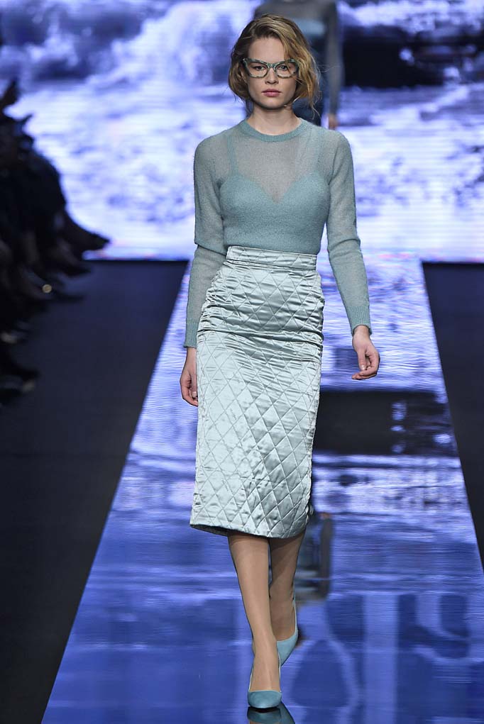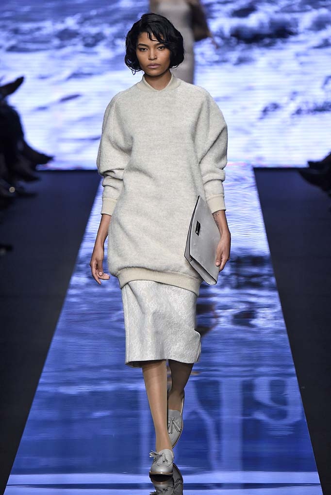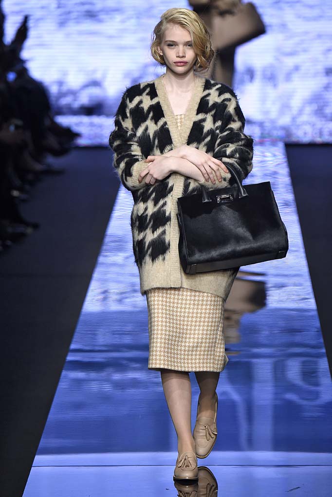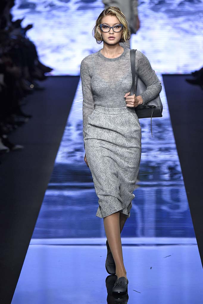 Marilyn Monroe was a chic point of reference for Max Mara this season. Specifically, the image of the buxom blonde icon lolling about on the beach in a chunky sweater, shot by George Barris in 1962, was the inspiration for Fall. That aesthetic was lifted directly from her look and adapted for the runway were messy bedhead locks, cat eye glasses, and silhouettes that emphasized the feminine shape. Gigi Hadid made three catwalk appearances here: opening the show in one of the house’s signature camel coats, donning a grey skirt and sweater combo towards the show’s middle, and finishing it all off in a yellow version of her first look. The rest of the collection featured plenty of perfectly executed outerwear, from a bomber jacket in camel wool to a satin quilted number with even more fur details. A slew of pencil skirts and proper sweaters kept the tone feeling ladylike with a vintage touch. Charming, non?