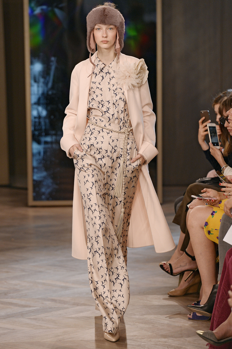 Another inspiration cited in the show notes included Cecil Beaton’s famous Fashion Is Indestructible photograph of a well-clad lady standing in the midst of war-torn rubble in London. The idea? The Max Mara woman is indestructible. She’s a fighting woman. But that doesn’t mean she’s above maintaining her femininity. Floral prints, shiny lamé materials, and sunny yellow hues, plus tiny dancing figures that served as the pattern on a soft pink pajama look. After all, there’s always an aura of fierce beauty that eventually emerges from the the detritus of an urban landscape.