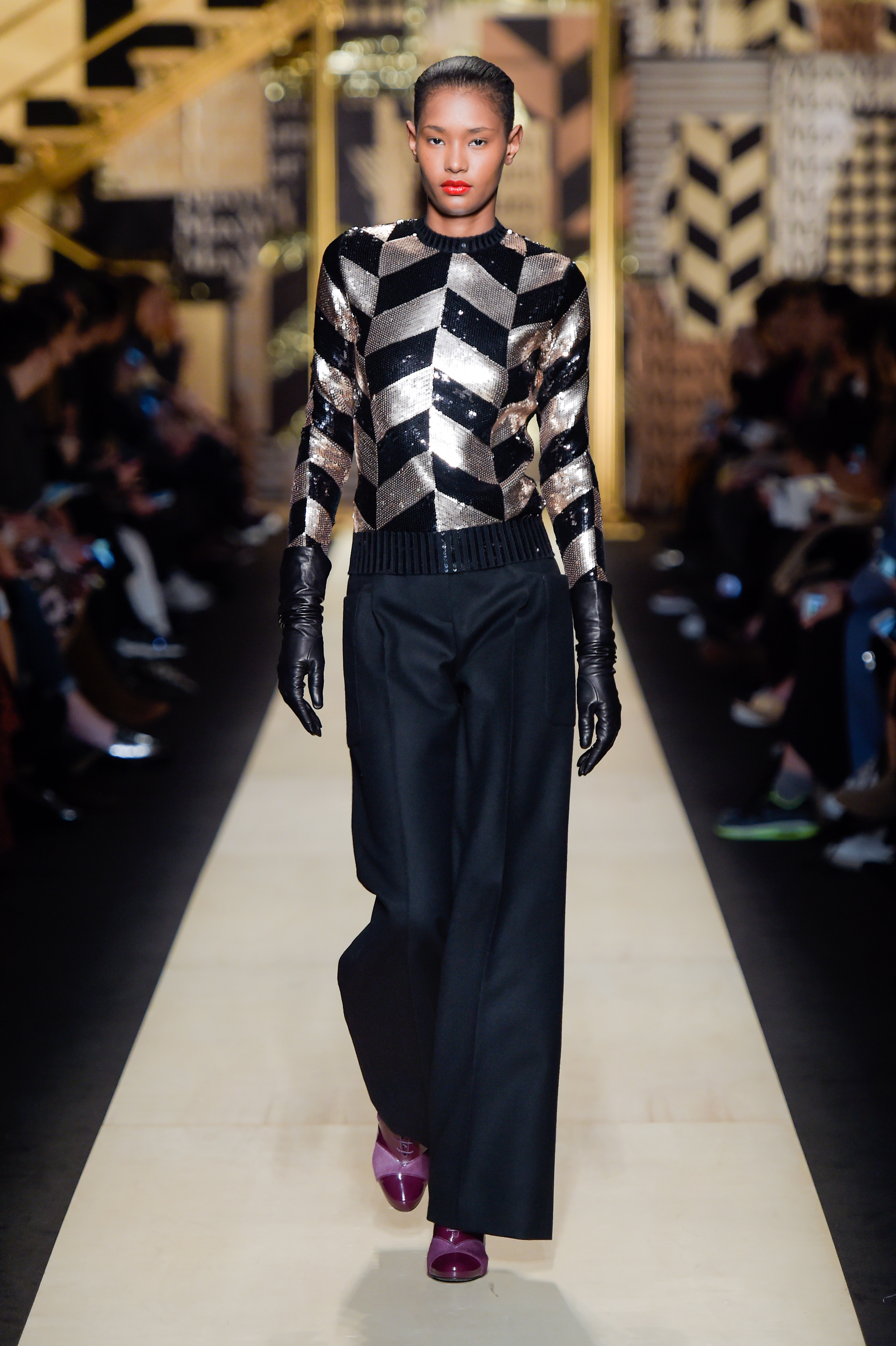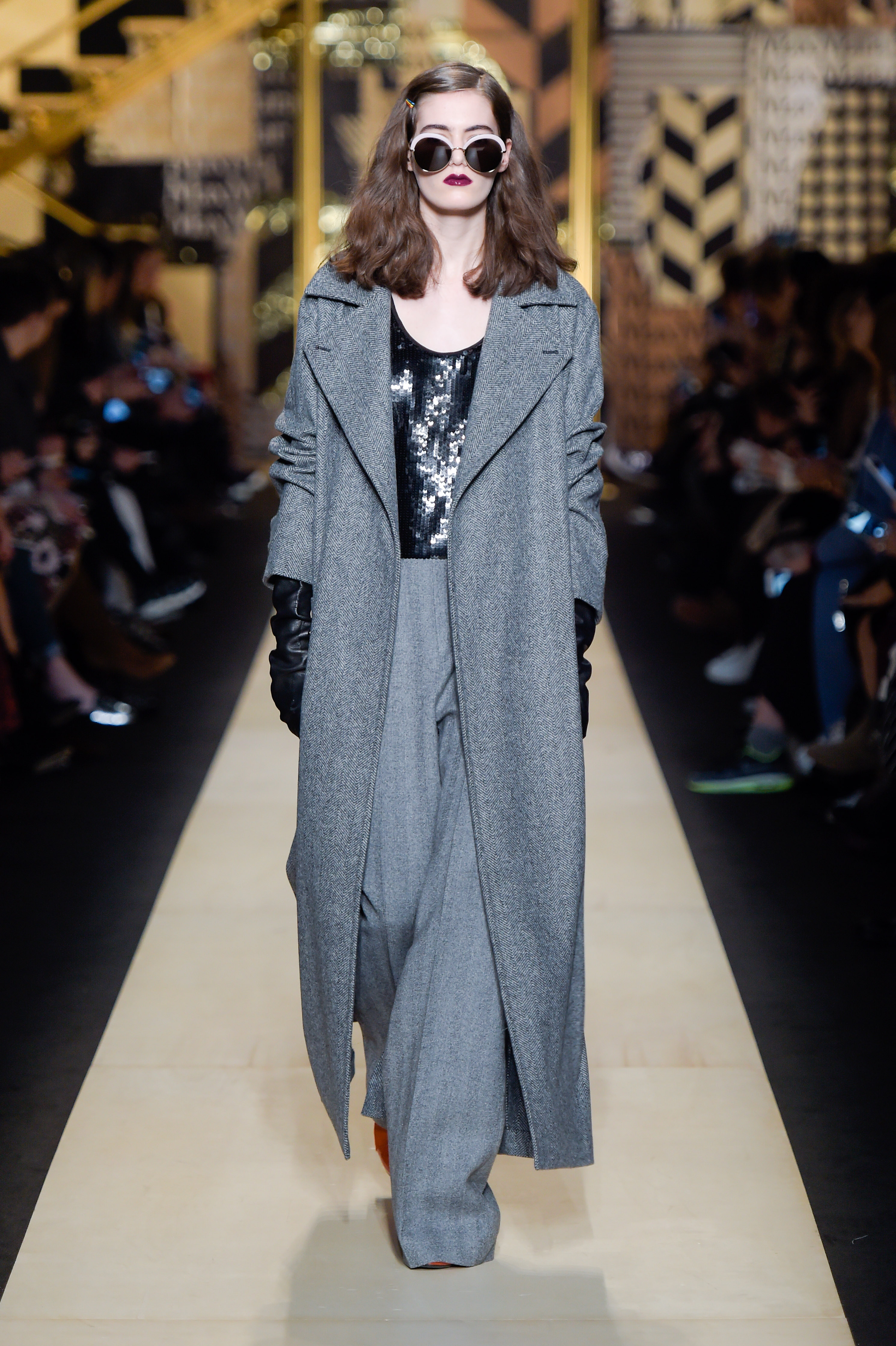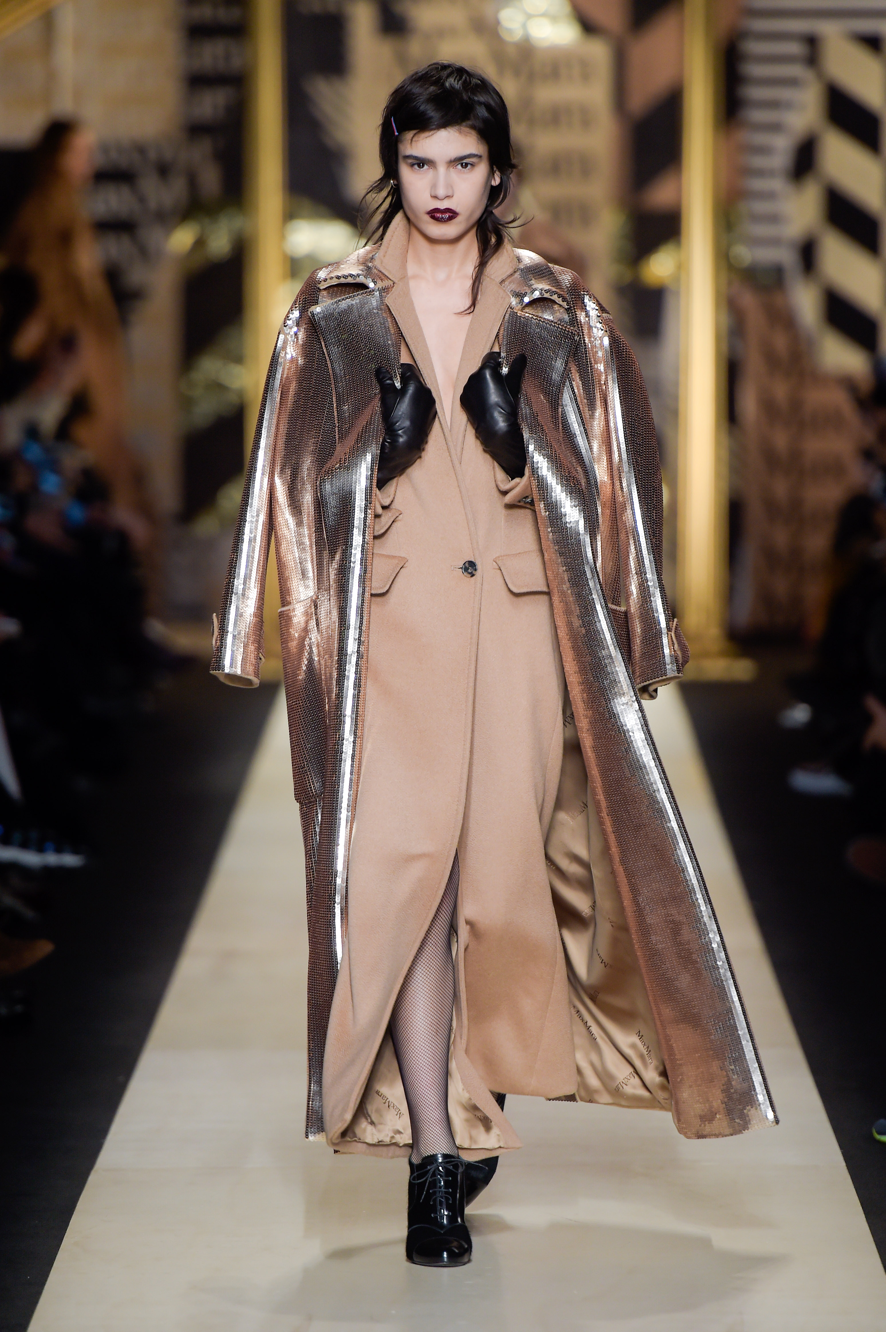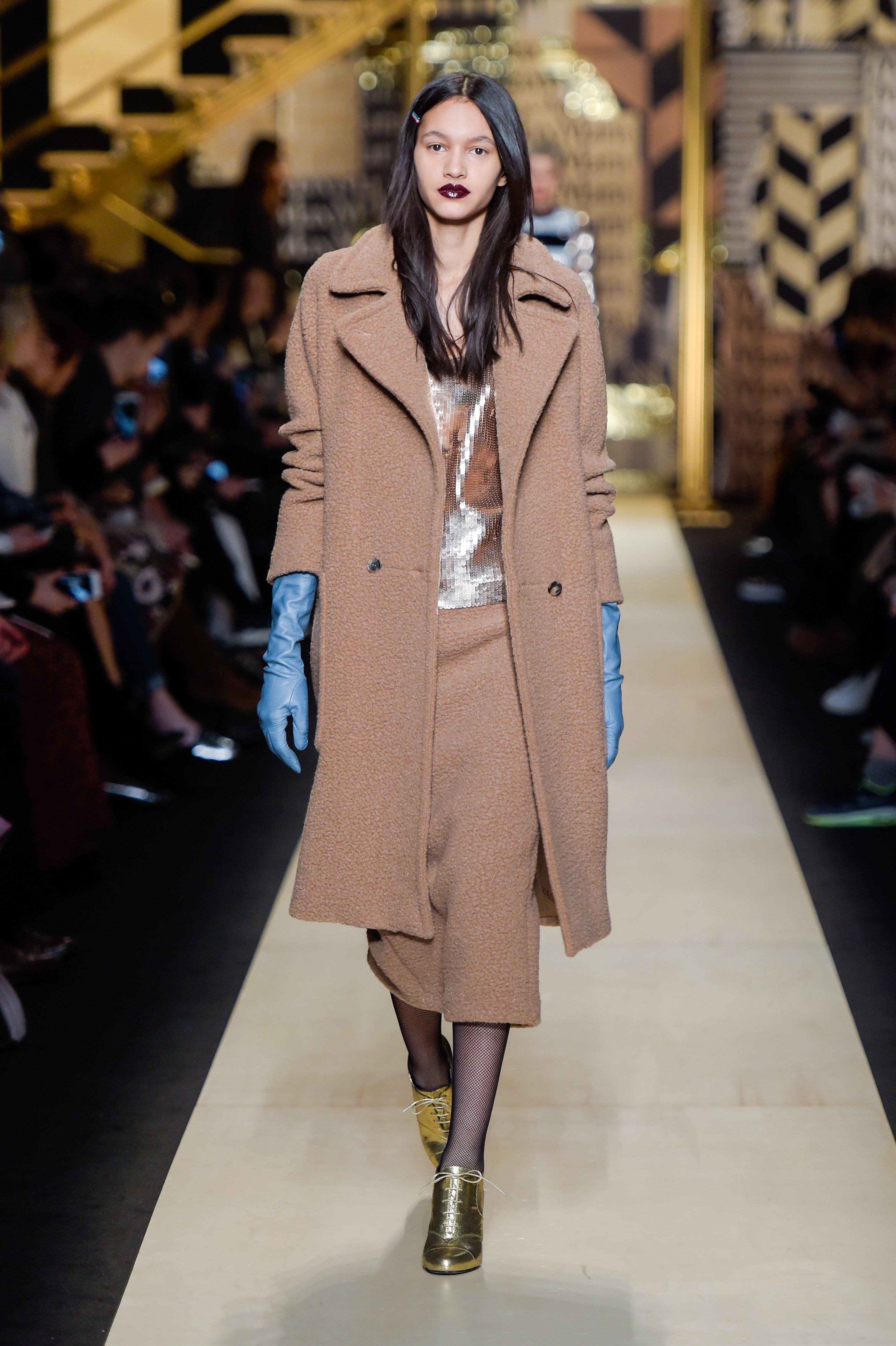 Divine outerwear, simple as that. But wait: Max Mara livened it up with bright hues, stripes, chevron prints, and sequins. Bauhaus, Dada, Constructivism, Modernism were among the themes running throughout this collection: think female artists in boiler suits painting away in their studios, if those uniforms had been jazzed up and destined for a night out on the town. The pieces that will fly off the racks first are a long grey wool coat with slouchy matching pants, a navy pinstripe suit, black coats covered in wet varnish, a chic long camel coat, a white shearling and more of those cozy teddy bear coats. The latter have certainly been a hot ticket for the brand, making their first iteration in oversized silhouettes on Max Mara’s Fall 2013 runway, followed by one runway version for Fall 2015, and a few styles for Pre-Fall 2016. In other words, the look is a brand staple. What could be more desirable when the weather dips into single digits? Stylist, influencers, and more daring clientele will love the colorful stripe ensembles and fur coats. And the mix of sequined gold and sober camels proved to be another winning combination.