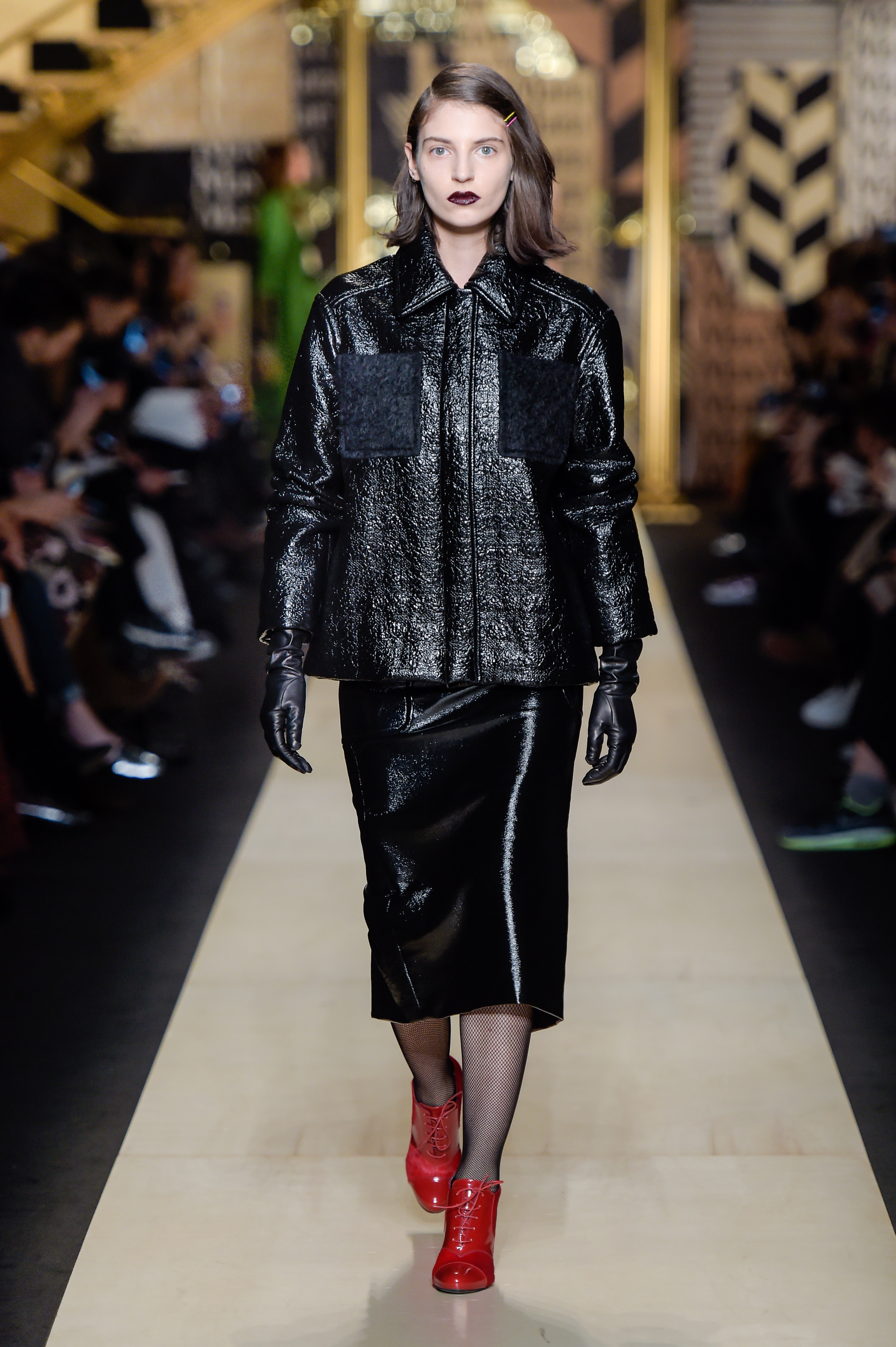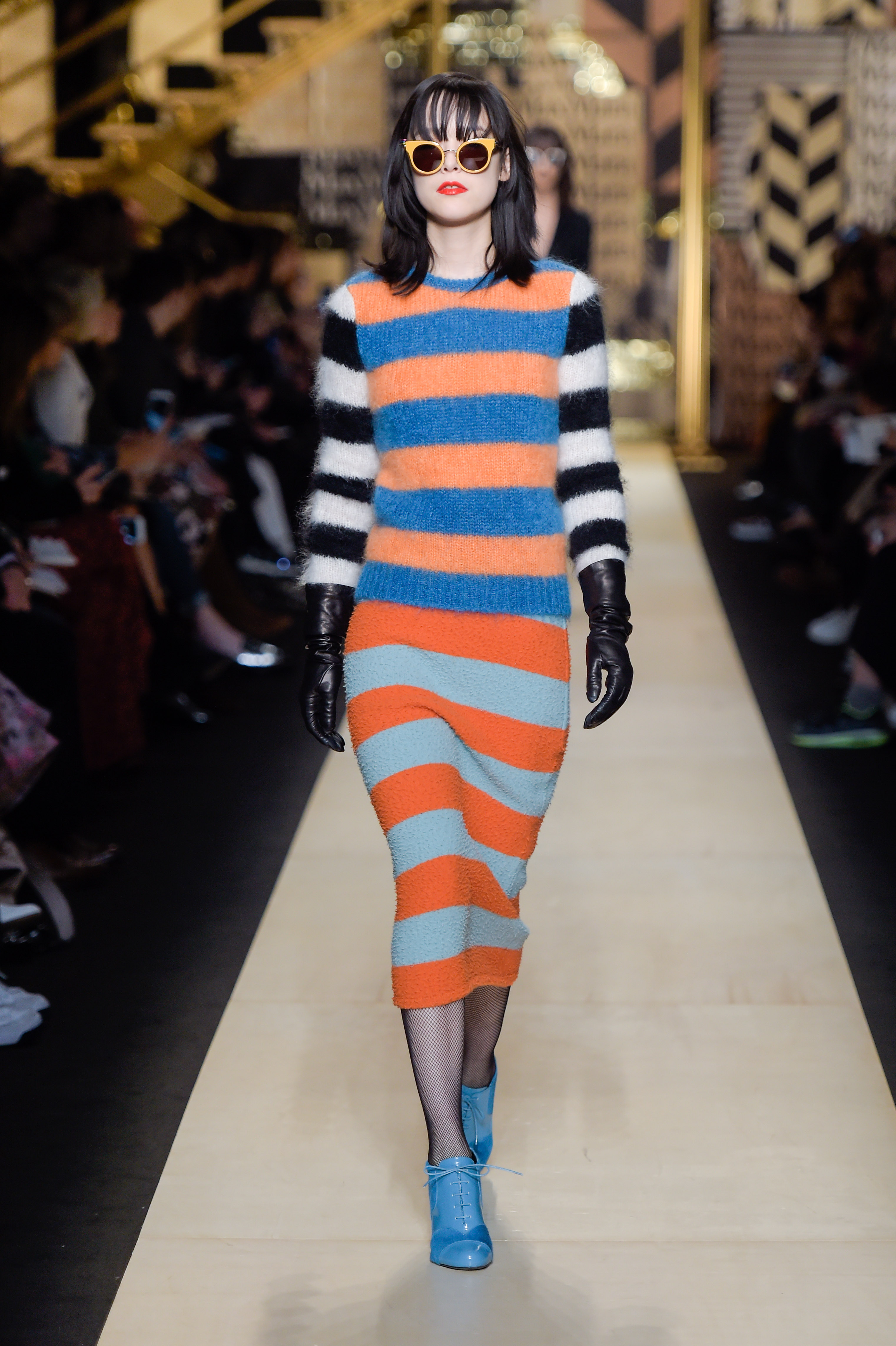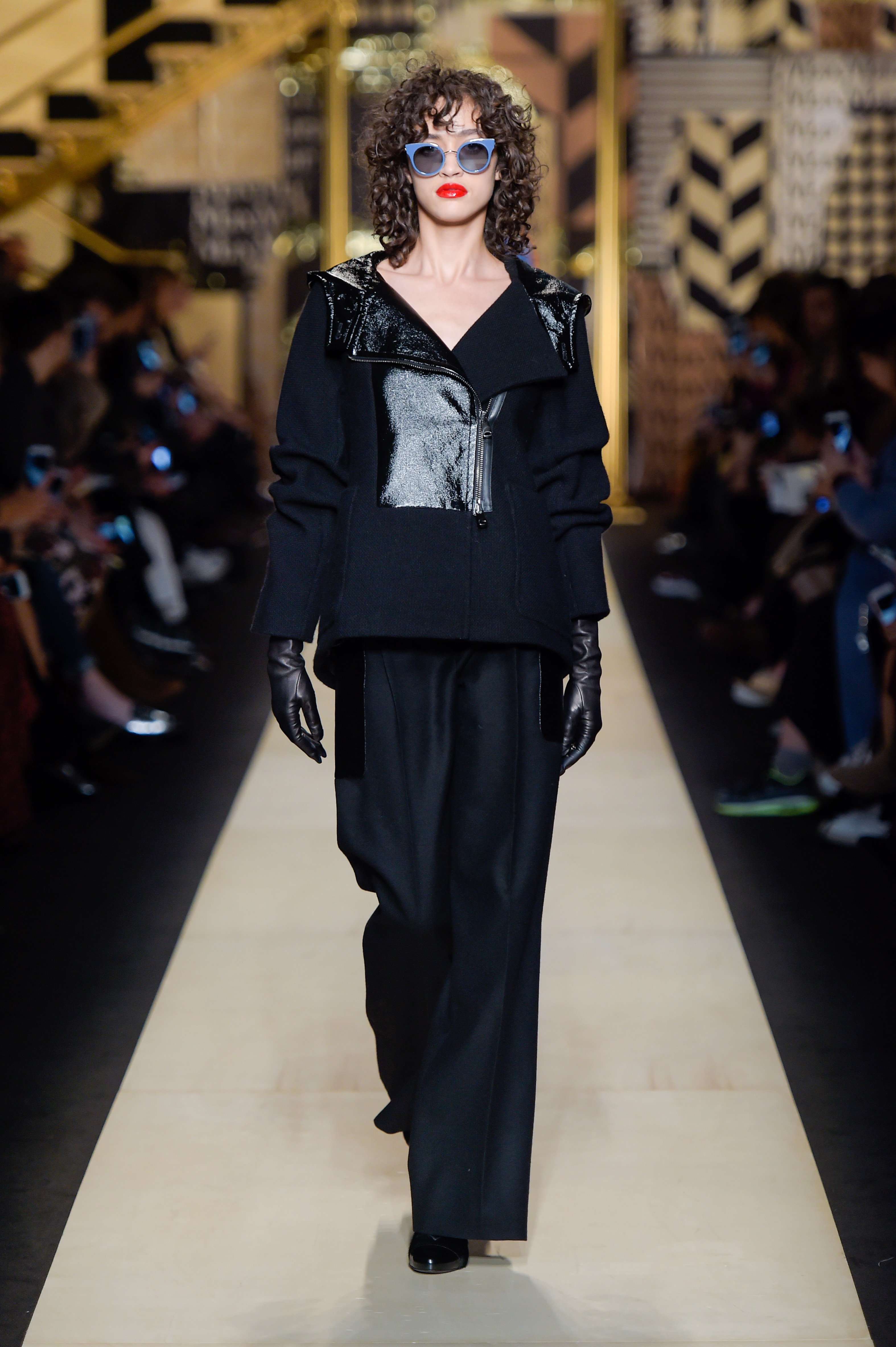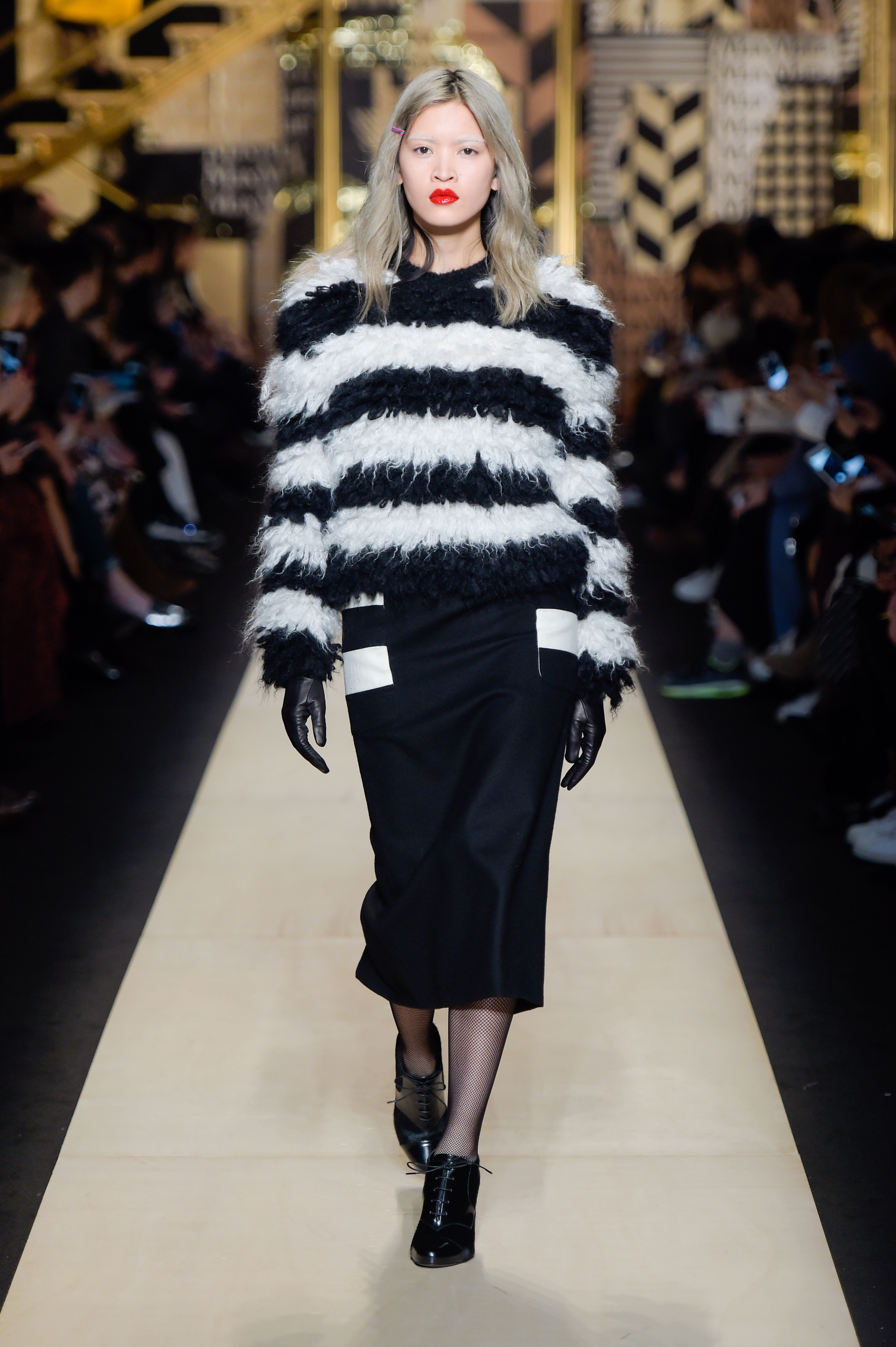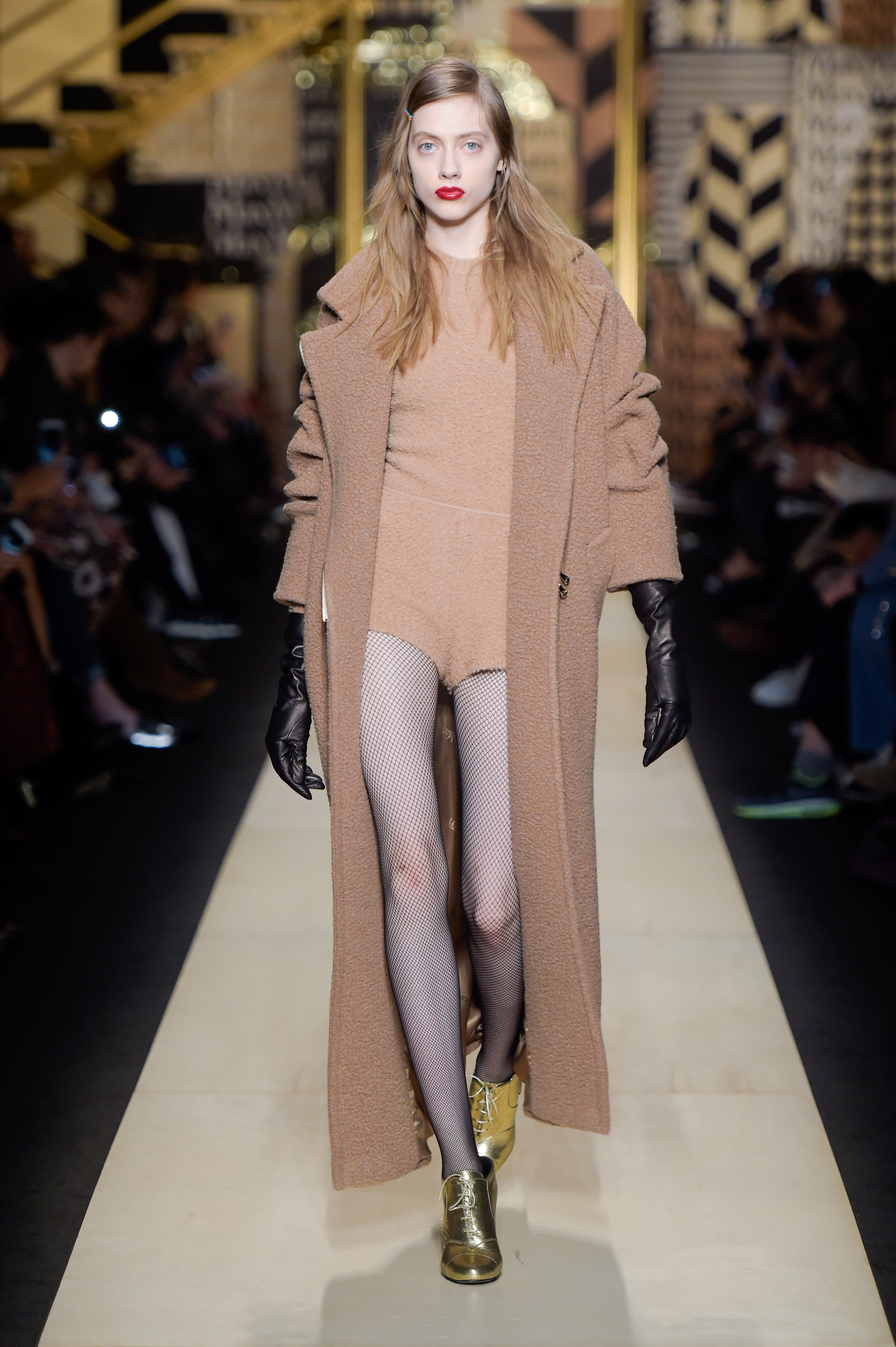 Divine outerwear, simple as that. But wait: Max Mara livened it up with bright hues, stripes, chevron prints, and sequins. Bauhaus, Dada, Constructivism, Modernism were among the themes running throughout this collection: think female artists in boiler suits painting away in their studios, if those uniforms had been jazzed up and destined for a night out on the town. The pieces that will fly off the racks first are a long grey wool coat with slouchy matching pants, a navy pinstripe suit, black coats covered in wet varnish, a chic long camel coat, a white shearling and more of those cozy teddy bear coats. The latter have certainly been a hot ticket for the brand, making their first iteration in oversized silhouettes on Max Mara’s Fall 2013 runway, followed by one runway version for Fall 2015, and a few styles for Pre-Fall 2016. In other words, the look is a brand staple. What could be more desirable when the weather dips into single digits? Stylist, influencers, and more daring clientele will love the colorful stripe ensembles and fur coats. And the mix of sequined gold and sober camels proved to be another winning combination.