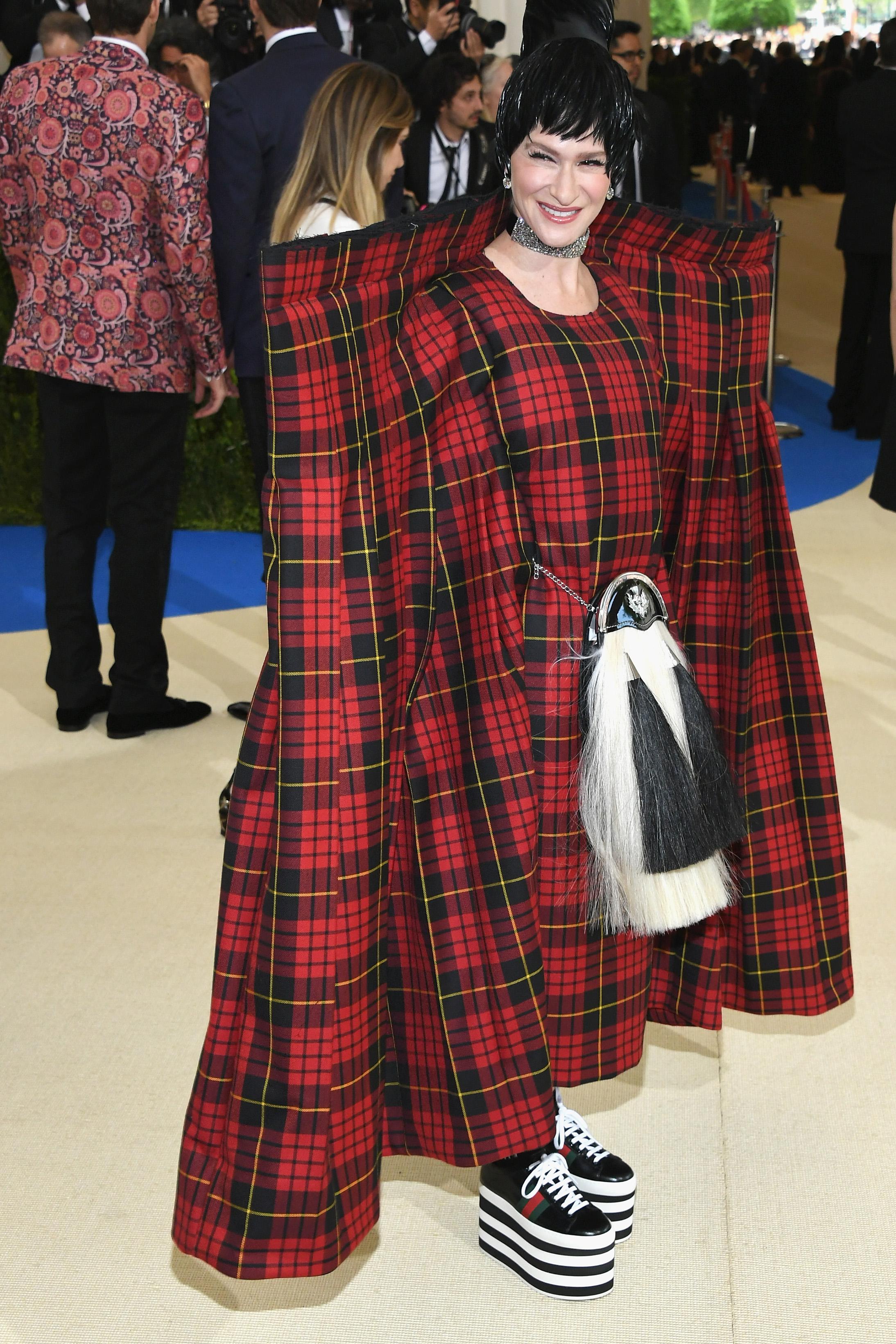 Socialite and fashion risk-taker Julie Macklowe, who’s known for the most outrageous of Met Gala looks, stopped by to say hi. As always, she went all out in a Comme des Garçons plaid, armless ensemble from the last collection, paired with Gucci platforms. “I’ve gone as a flying squirrel with no arms tonight and am wearing special underwear that you can pee in,” Macklowe told us. “It only took about an hour [to get ready]…very easy! I feel like I need a beer-bong helmut since I don’t have arms, so I can drink. I just hope someone who sits next to me will feed me.”