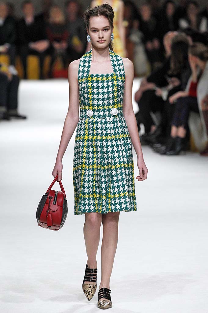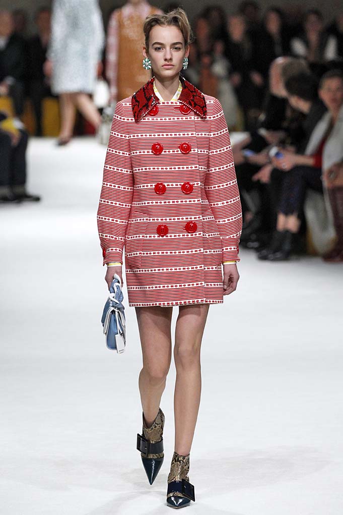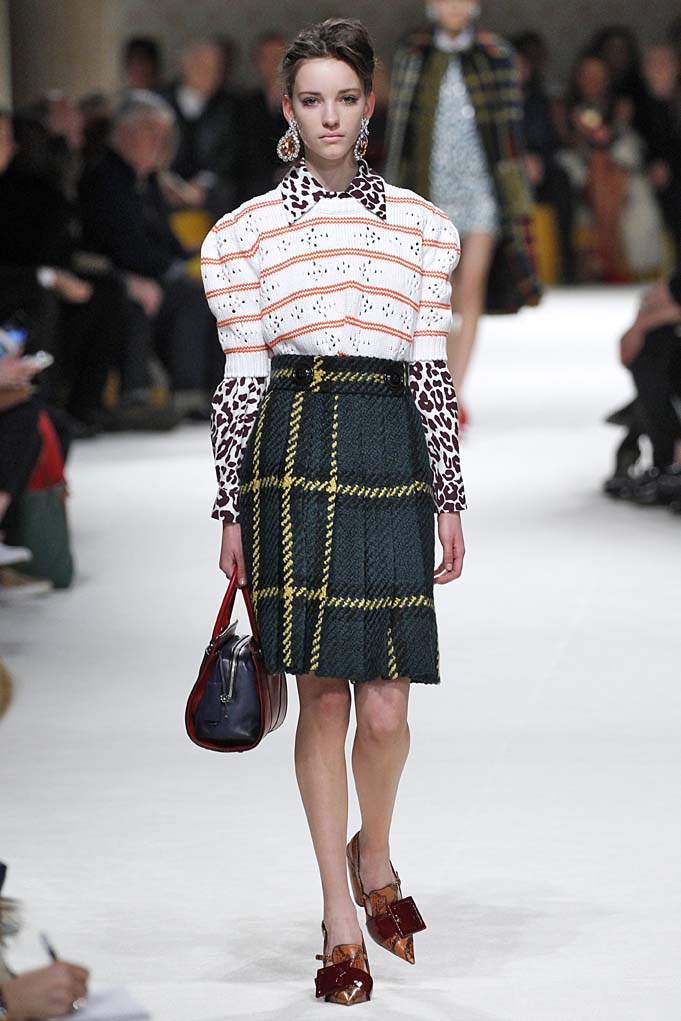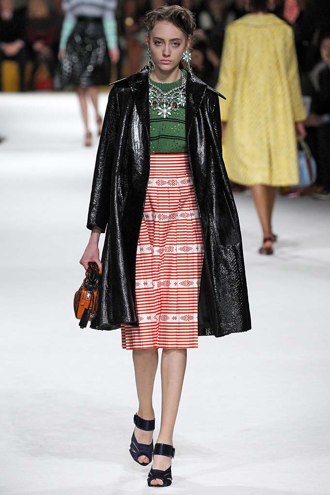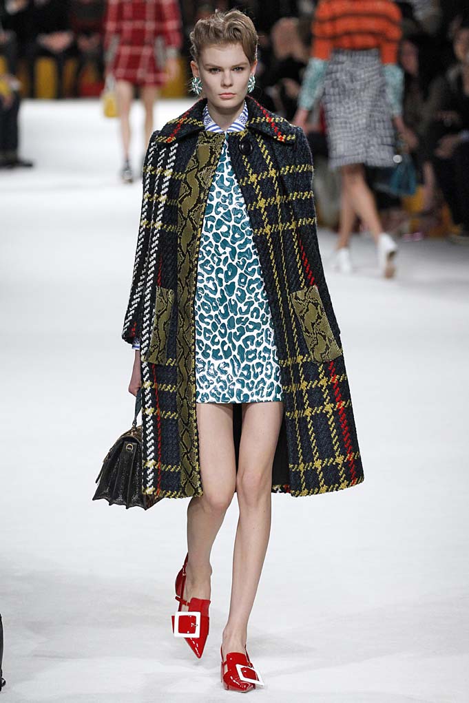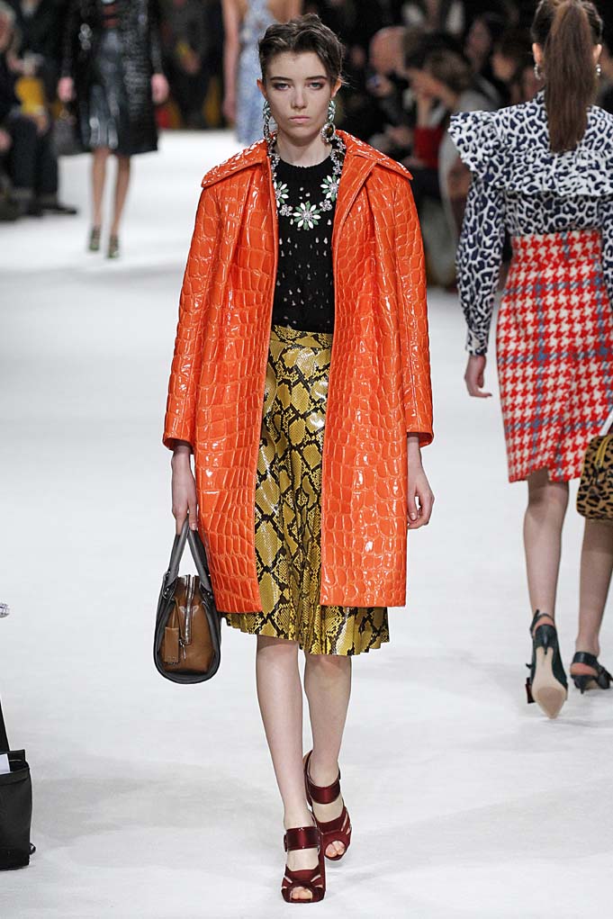 Miu Miu’s Fall collection was replete with glossy skins, plenty of colorful leopard, and tons of herringbone, like a trove of vintage finds, giving the style set much more to talk about than front rower Renee Zellweger’s exhaustively-discussed face. Oversized costume jewelry was also in the mix, as were bright pastel patent leather shoes, some with a multitude of straps, others with big buckles. At times the vintage theme was a bit excessive, like a green and yellow jumper with big, white buttons or the prim shirtdress with a horizontal stripe detail and a neck ruffle. But the outerwear here was key: all of the bright wool options featuring a snakeskin detail or even a full-on snakeskin look. Also attention grabbing? Those shiny croc shift dresses and mini skirts in punchy shades of orange, yellow, and red.
