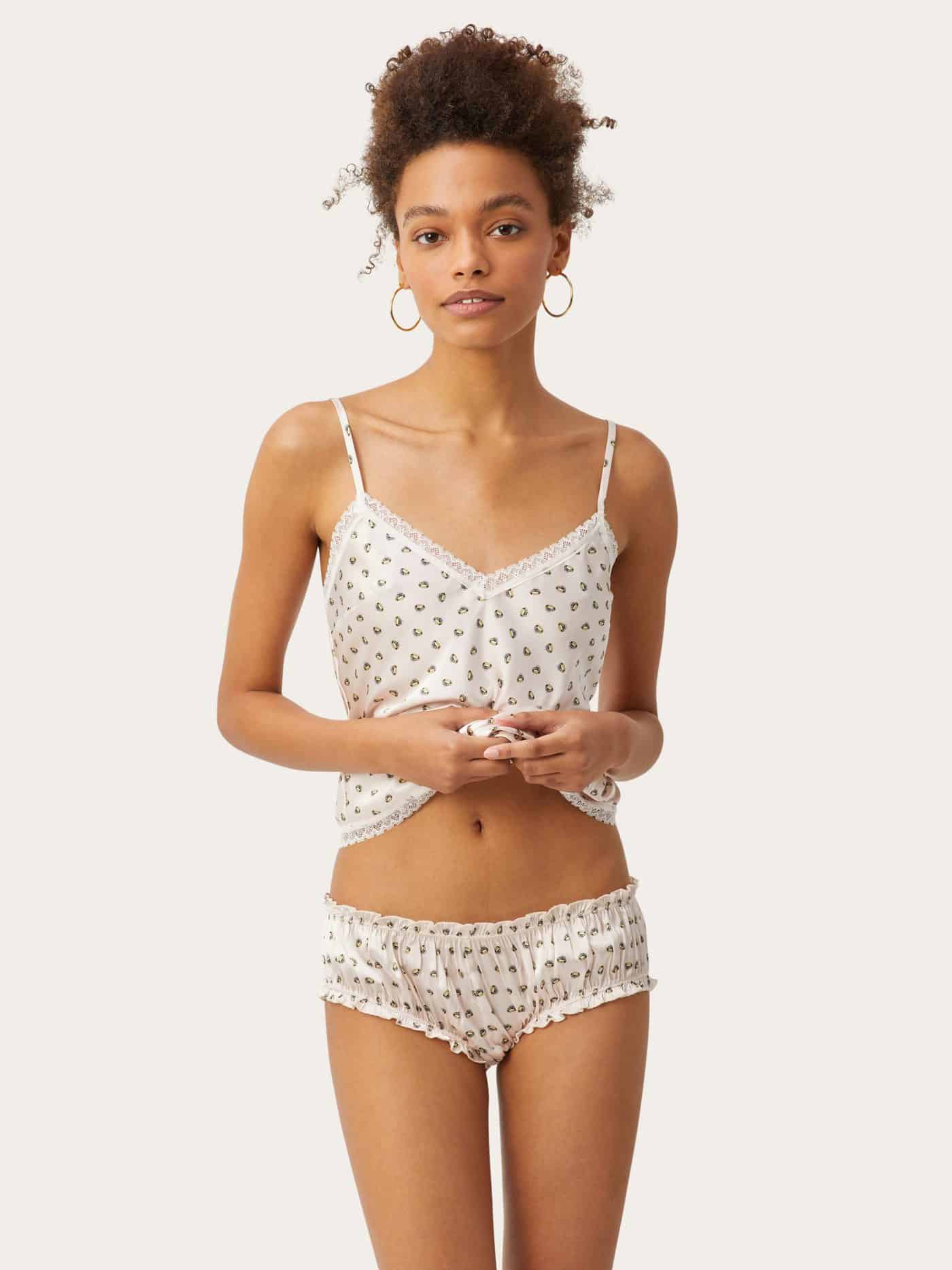 The collection is comprised of long sleeve shirts, ruched waistband shorts, drawstring pants, vintage-style bowling shirts, lingerie, a robe, and eye masks. The nostalgic-yet-modern pieces will launch November 16, with prices ranging between $98-$248 and the offering will range be available in sizes P, S, M, L, XL, and XXL.