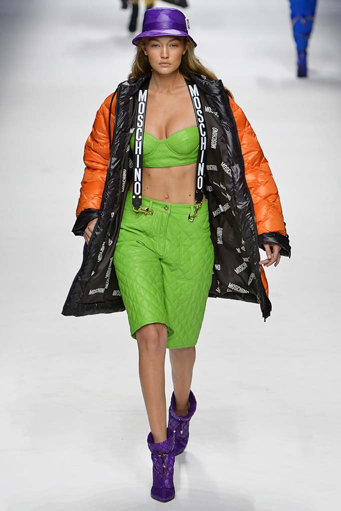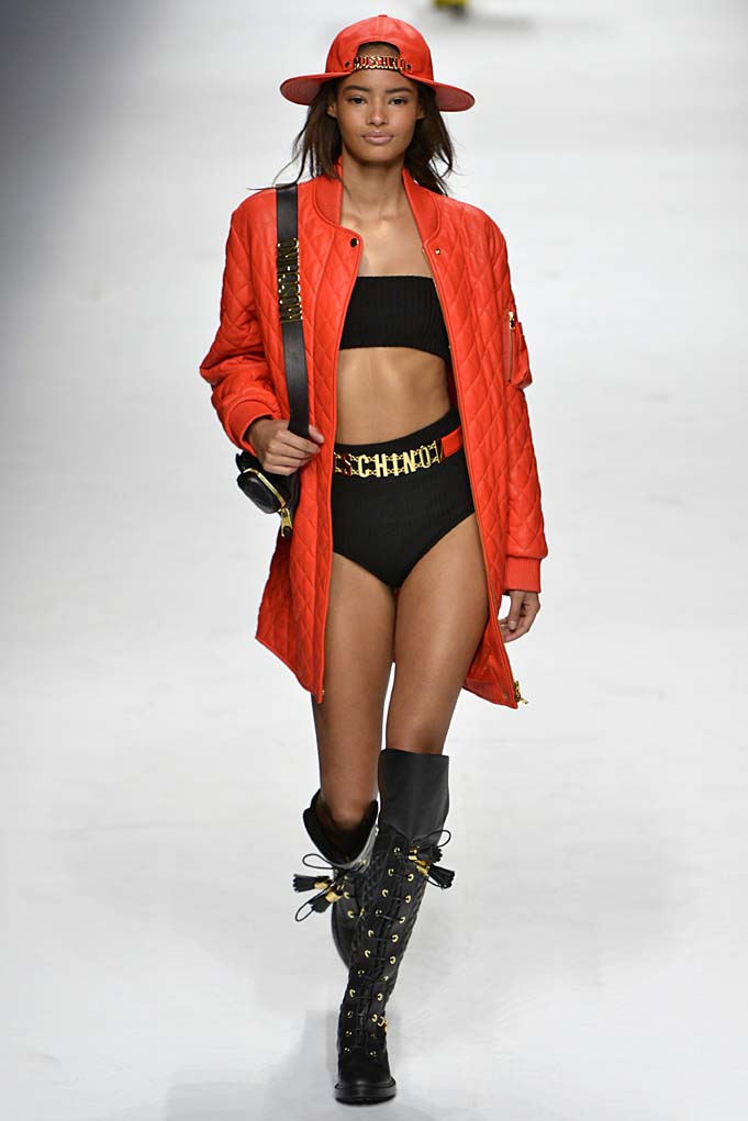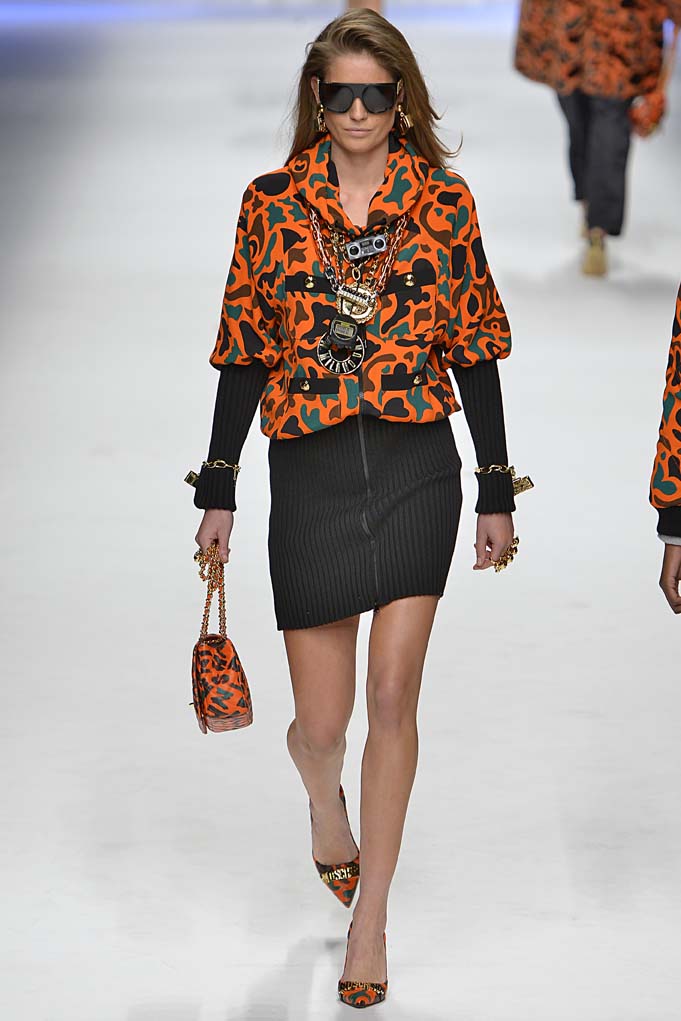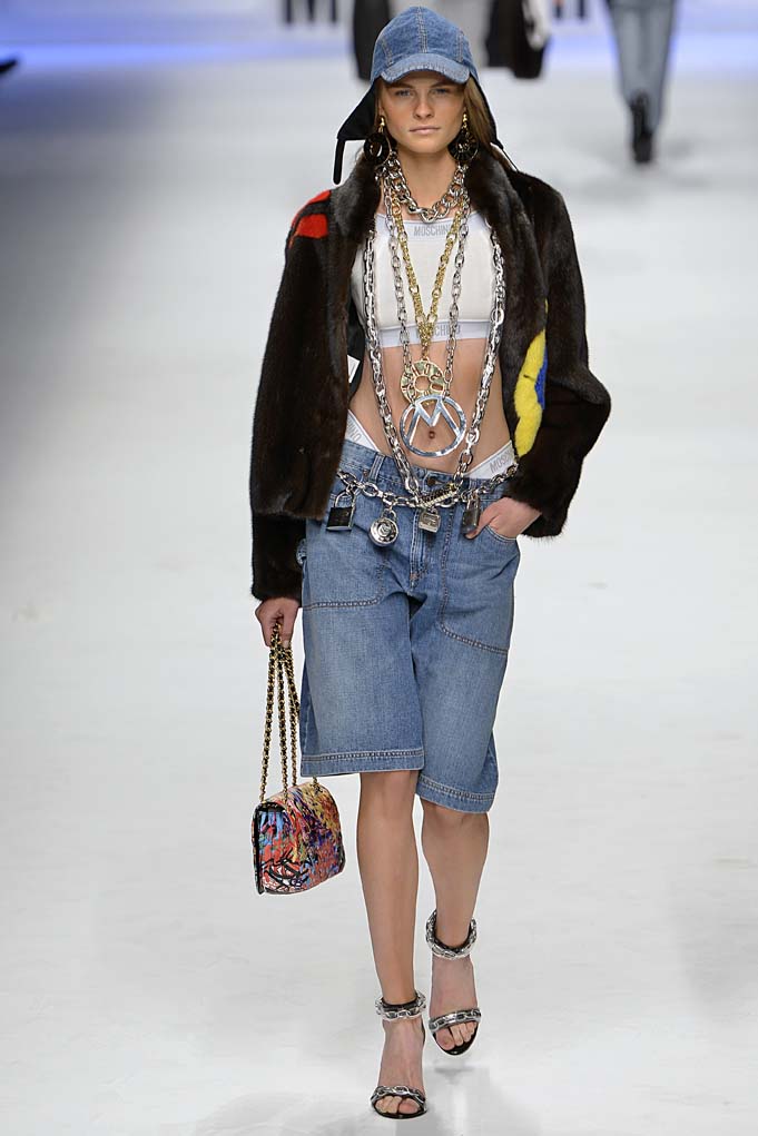 Influences throughout the collection could certainly be attributed to Scott’s longtime stylist, Carlyne Cerf de Dudzeele, like an orange camo jacket, which was accessorized with oversized black shades and multiple layers of gold chains. There was a bit of de Dudzeele in a modernized version of the classic tweedy Chanel skirt suit, translated into jersey with accents of a grey hoodie. Other streetwear touches included creative denim getups, like Bermuda shorts or a pair of inside-out trousers, and more than one appearance of tighty-whities stamped with the Moschino name. While this collection is high on the kitsch factor, there were plenty of strong separates and accessories that could be plucked from the collection for everyday use.