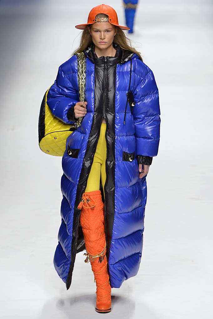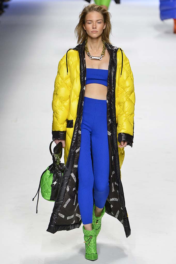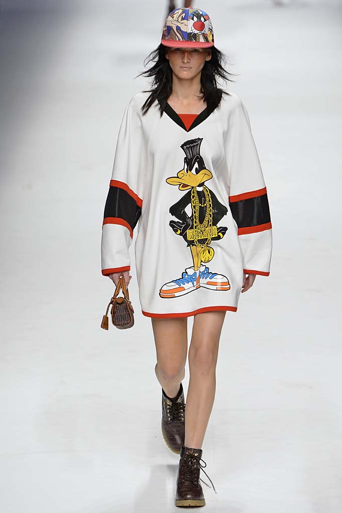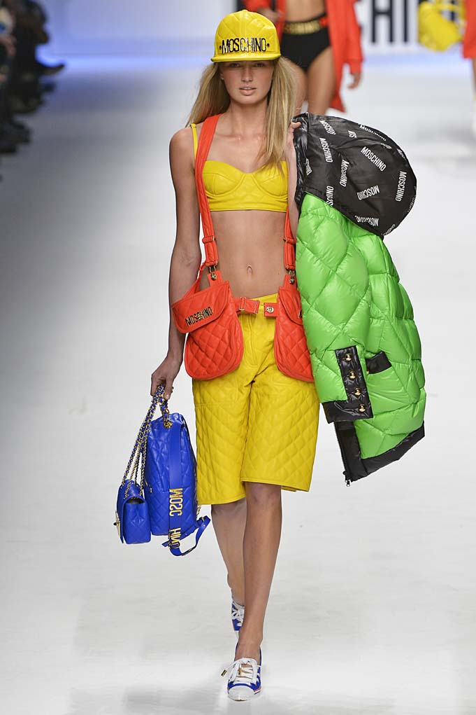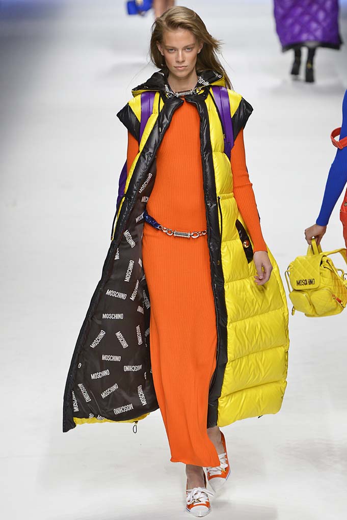 Influences throughout the collection could certainly be attributed to Scott’s longtime stylist, Carlyne Cerf de Dudzeele, like an orange camo jacket, which was accessorized with oversized black shades and multiple layers of gold chains. There was a bit of de Dudzeele in a modernized version of the classic tweedy Chanel skirt suit, translated into jersey with accents of a grey hoodie. Other streetwear touches included creative denim getups, like Bermuda shorts or a pair of inside-out trousers, and more than one appearance of tighty-whities stamped with the Moschino name. While this collection is high on the kitsch factor, there were plenty of strong separates and accessories that could be plucked from the collection for everyday use.