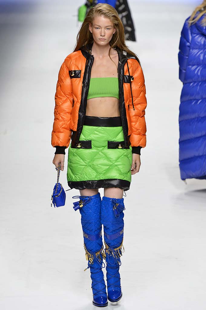 Influences throughout the collection could certainly be attributed to Scott’s longtime stylist, Carlyne Cerf de Dudzeele, like an orange camo jacket, which was accessorized with oversized black shades and multiple layers of gold chains. There was a bit of de Dudzeele in a modernized version of the classic tweedy Chanel skirt suit, translated into jersey with accents of a grey hoodie. Other streetwear touches included creative denim getups, like Bermuda shorts or a pair of inside-out trousers, and more than one appearance of tighty-whities stamped with the Moschino name. While this collection is high on the kitsch factor, there were plenty of strong separates and accessories that could be plucked from the collection for everyday use.
