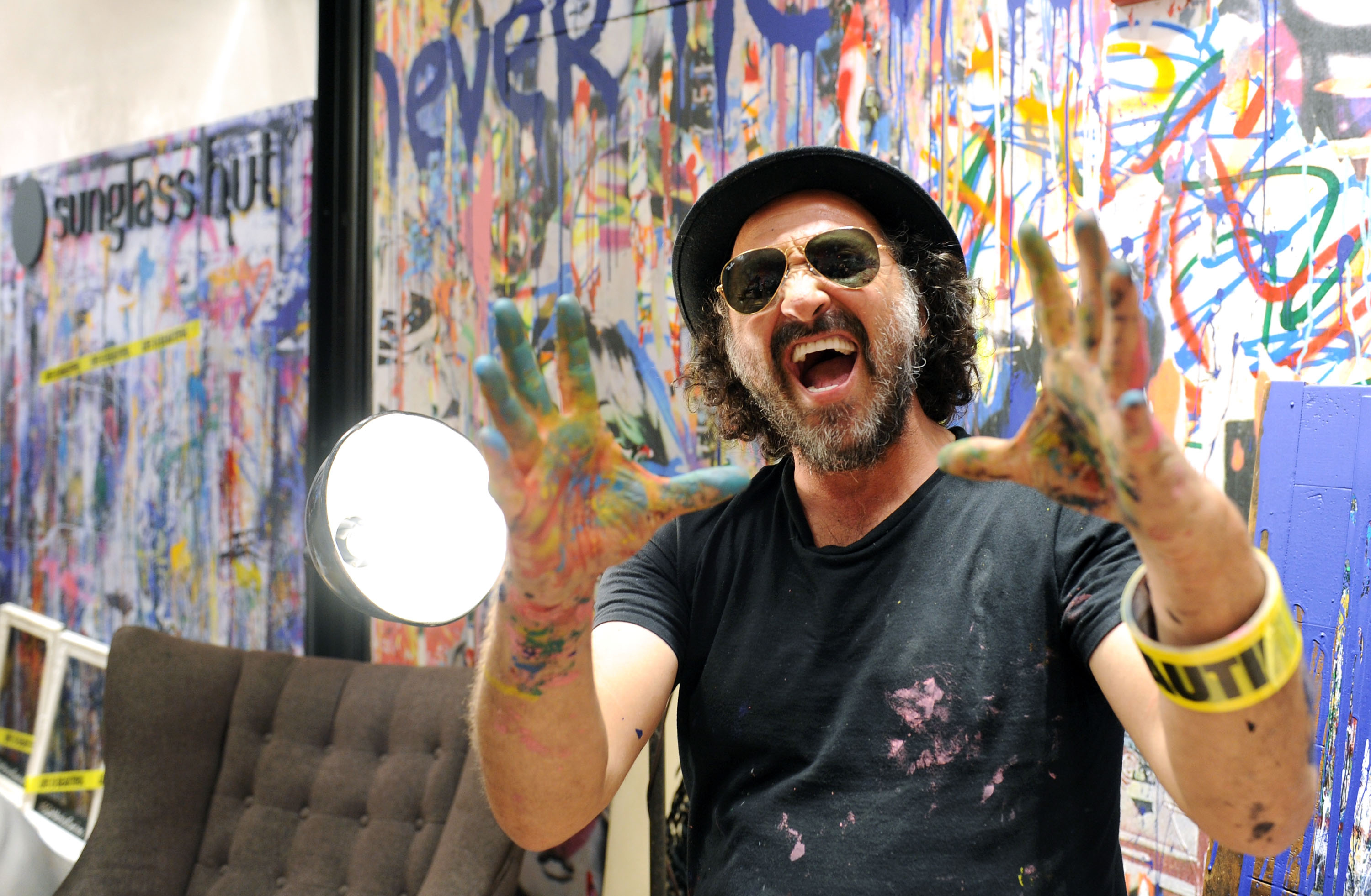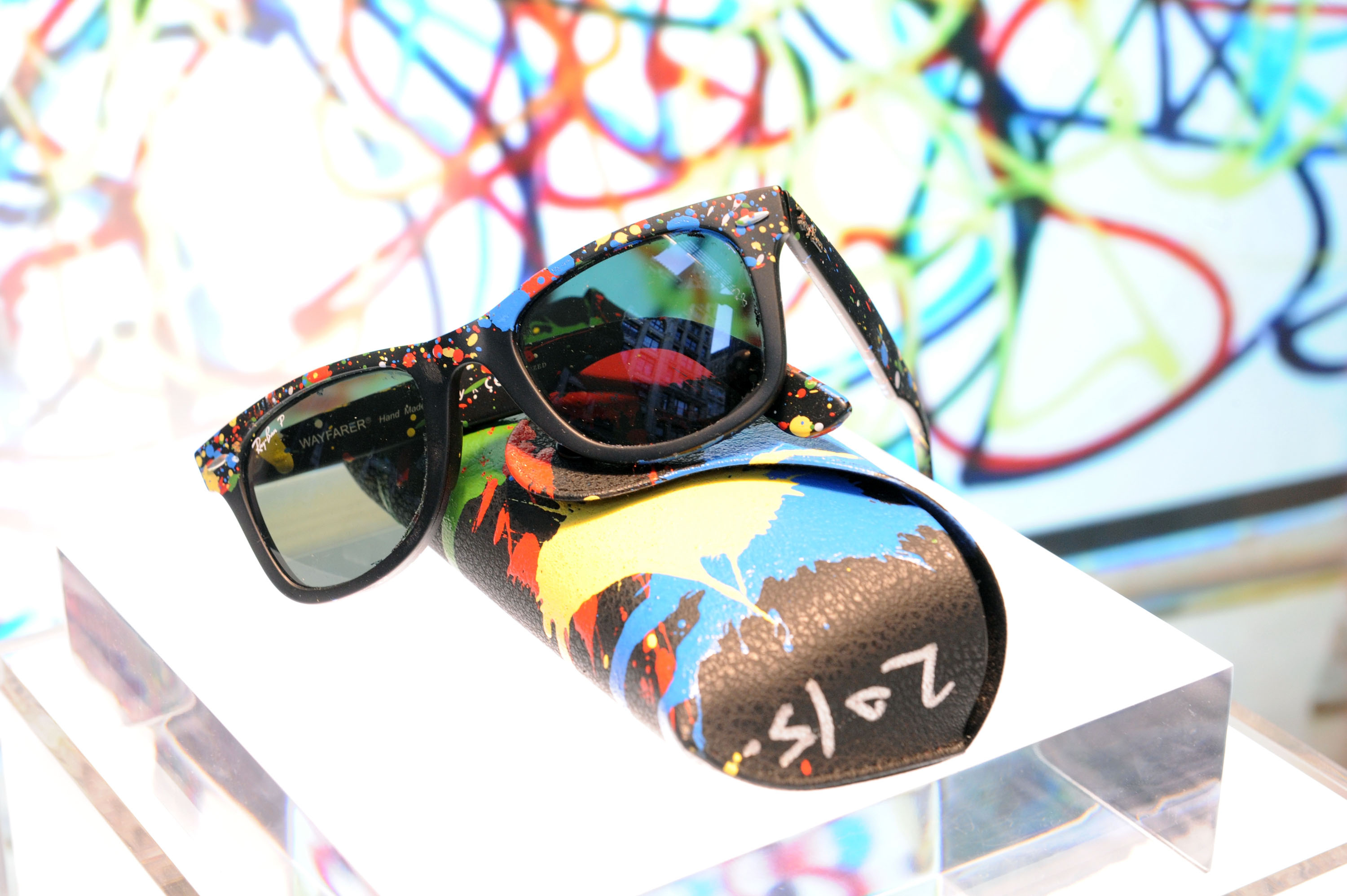 Street art junkies and Ray-Ban loyalists alike had something to obsess over at last night’s cocktail bash for the latest installment of Sunglass Hut’s Artist Series at the shades purveyor’s newly-reopened Soho store on Broadway and Broome. Mr. Brainwash (aka MBW, aka Thierry Guetta), who decked out 250 pairs of Ray-Bans with his signature colorful splatters as part of the series, also did quite a number on the back portion of the store itself, which will function as a pop-up for the next four months.