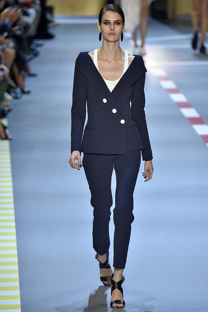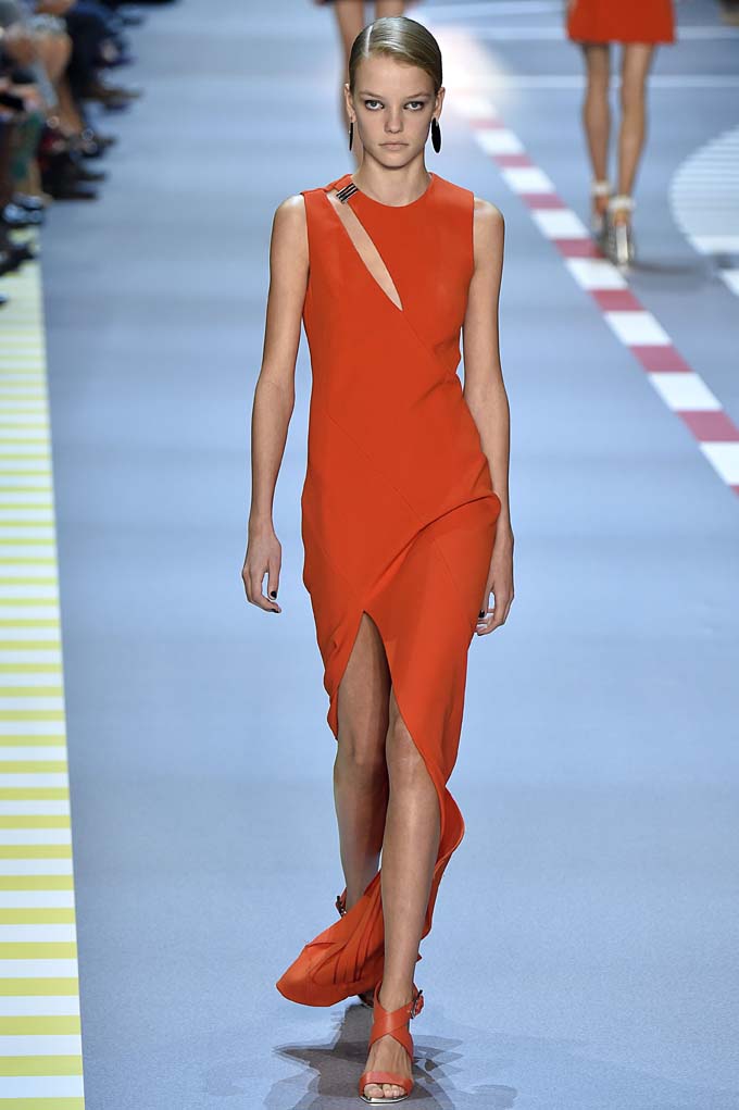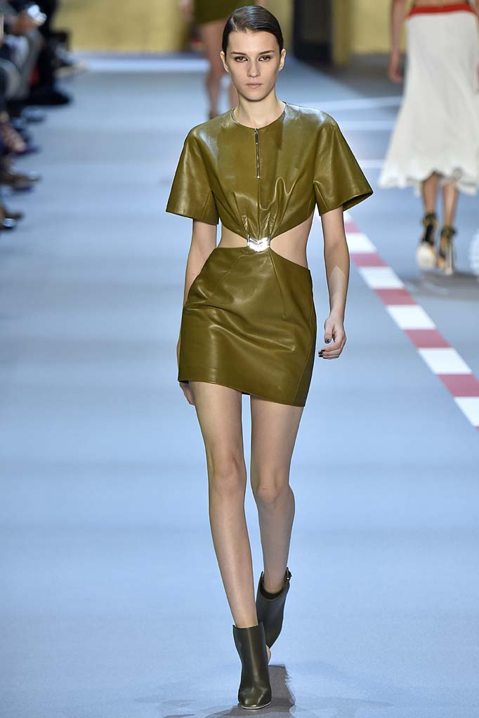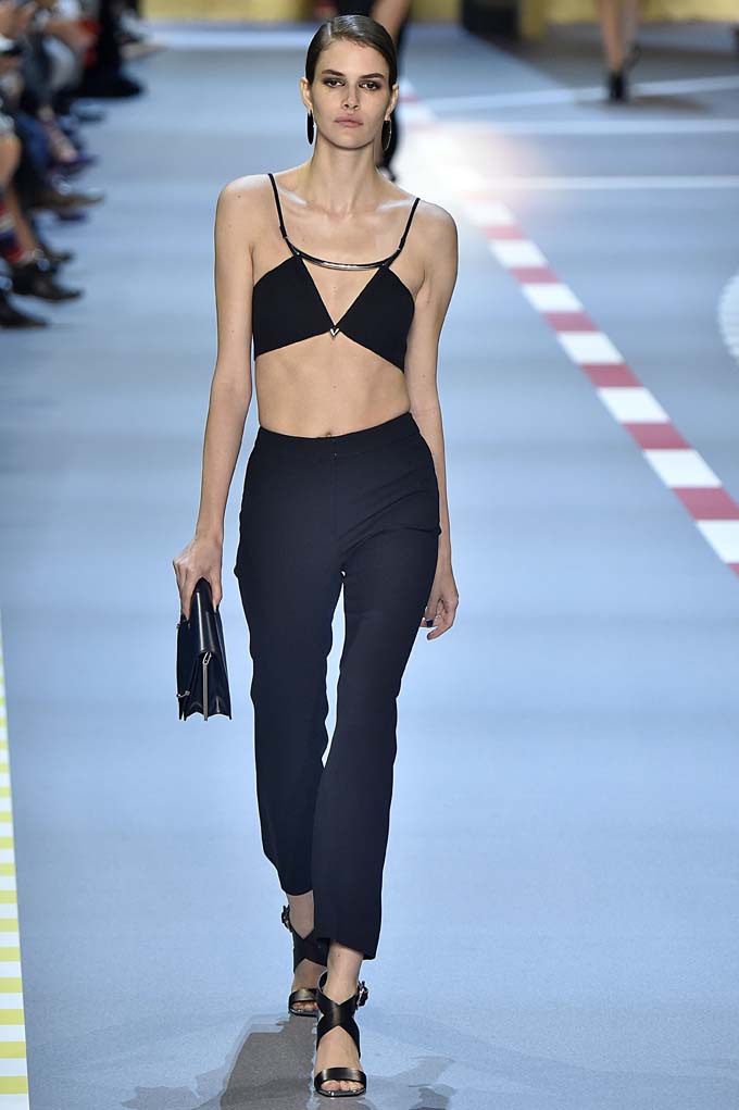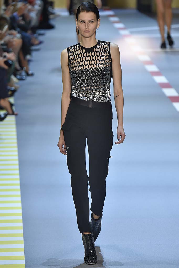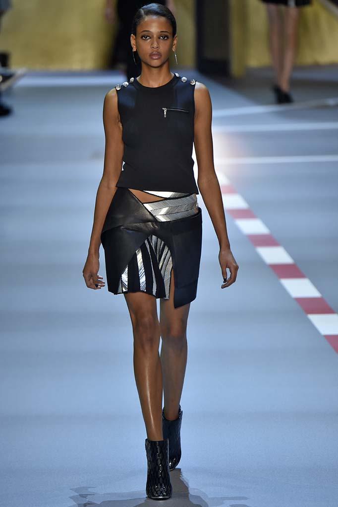 But the best looks seemed to be unrelated to the theme and more in line with the brand’s ongoing motif, which is straight up sex appeal. A leather dress with the sides cut out that gathered at the midriff with a red V and a white skirt with high-slits was seriously hot and a navy diamond cut dress with silver embellishments showed the right amount of skin without being vulgar (although one would have to have model Romy Schonberger‘s body to rock this properly). A black evening dress that hung from a slim silver piece with a high slit is also just what the Mugler girl is looking for. Sometimes having no theme other than the codes of the house works best.
